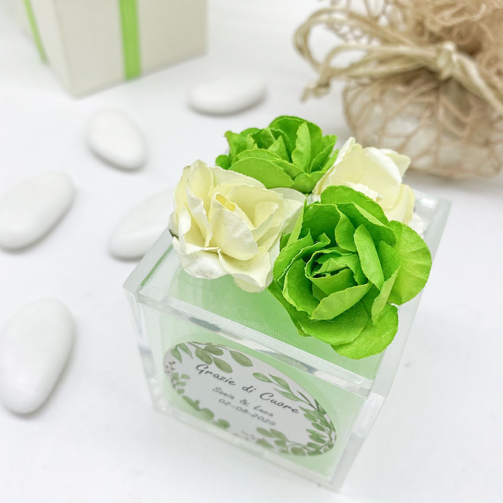 Questa scatolina è arricchita da quattro roselline in TNT, due verdi e due panna, che adornano il coperchio. Con una dimensione di 5x5 cm, è perfetta per una confettata o come segnaposto, aggiungendo un tocco di eleganza al tuo evento.