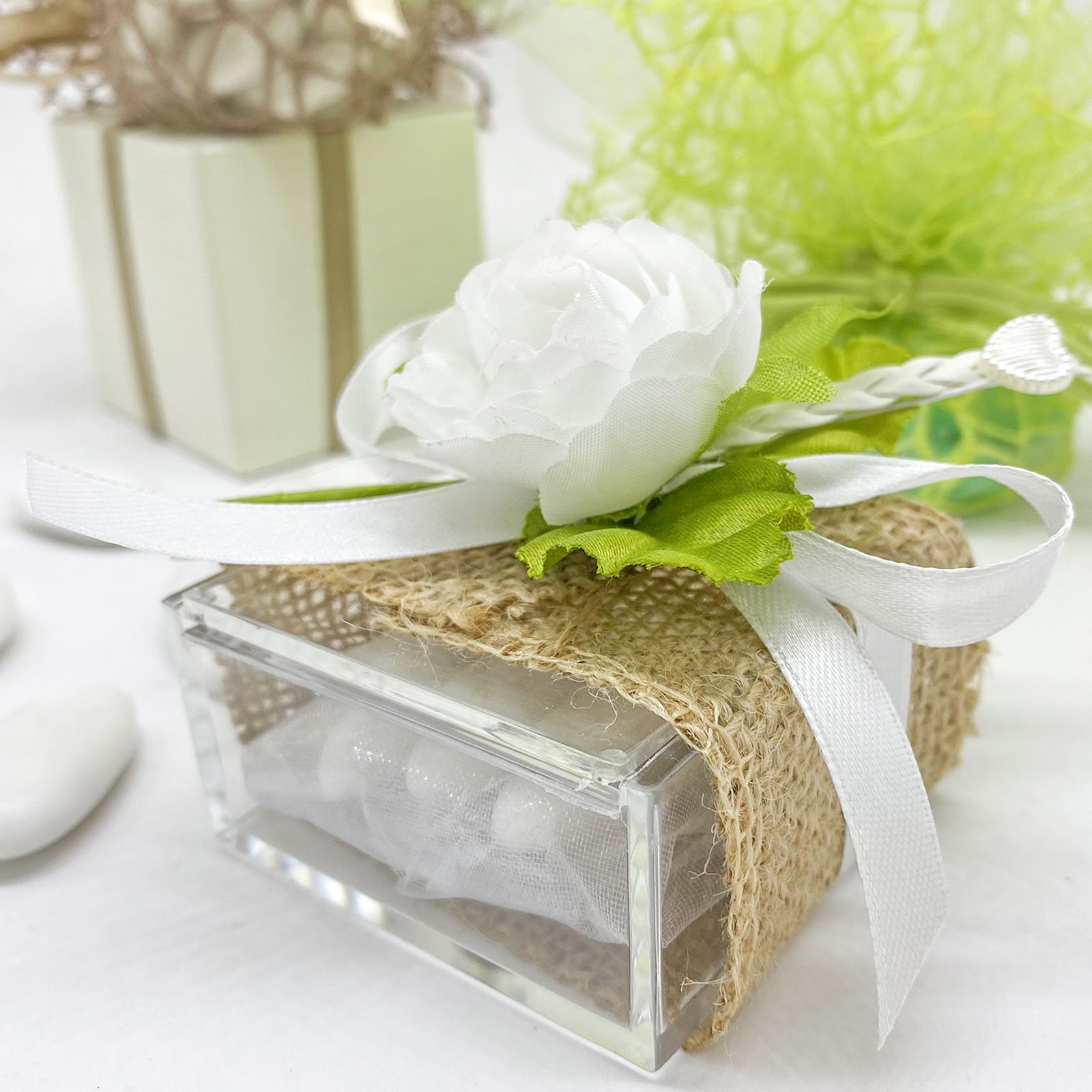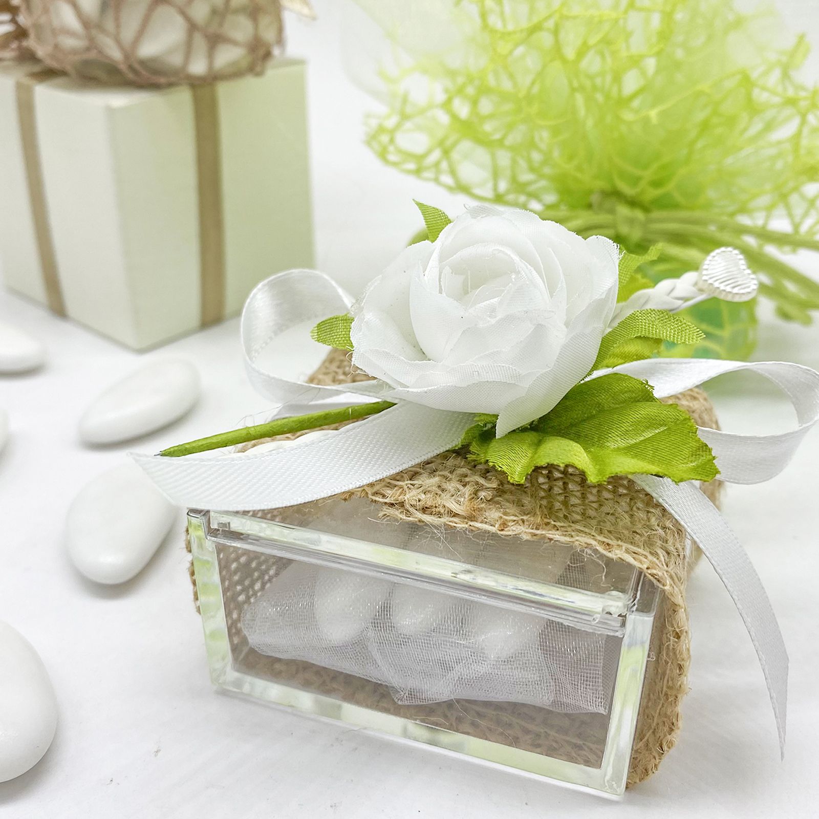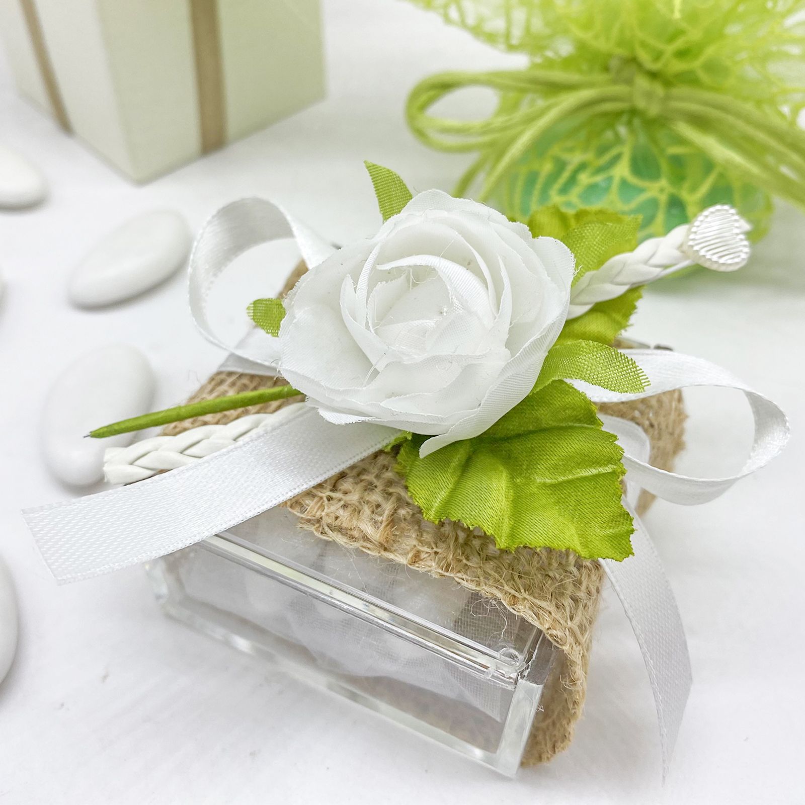 Porta un tocco di raffinatezza al tuo evento con questa splendida scatolina per confetti. Realizzata in plexiglass, è chiusa da un sofisticato nastro in juta. Sul coperchio si trova una rosa decorativa arricchita con una trecciolina, foglie e un delicato cuoricino, per un tocco di classe e delicatezza.