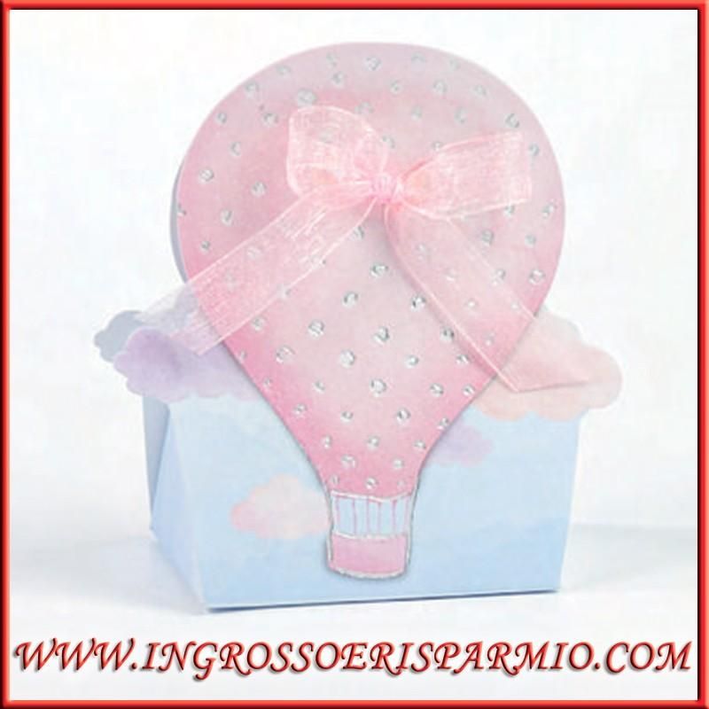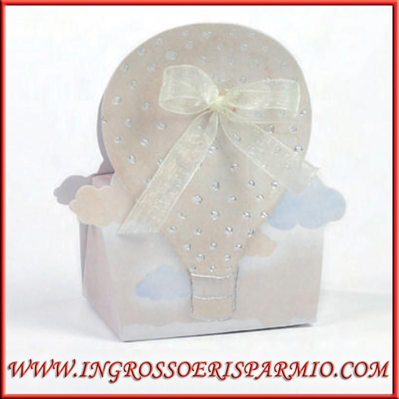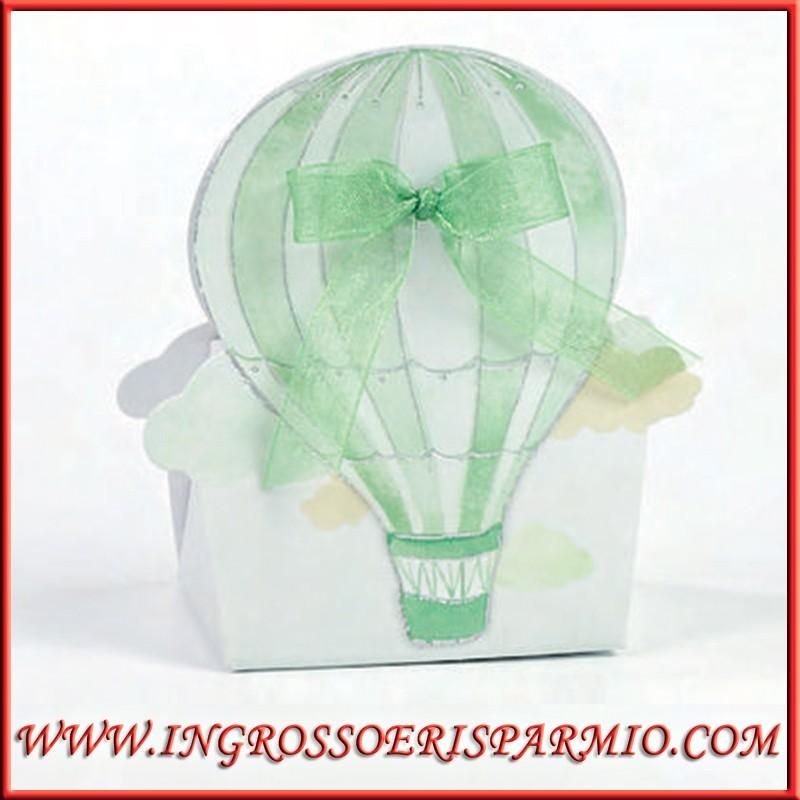 Mongolfiere Portaconfetti in cartone rigido, disponibili a scelta tra i colori: Rosa, Celeste, Verde, Panna. Nel modello rosa e quello panna, la mongolfiera ha un decoro a pois, mentre in quello azzurro e verde la fantasia è a righe, entrambi con piccoli dettagli argentati.