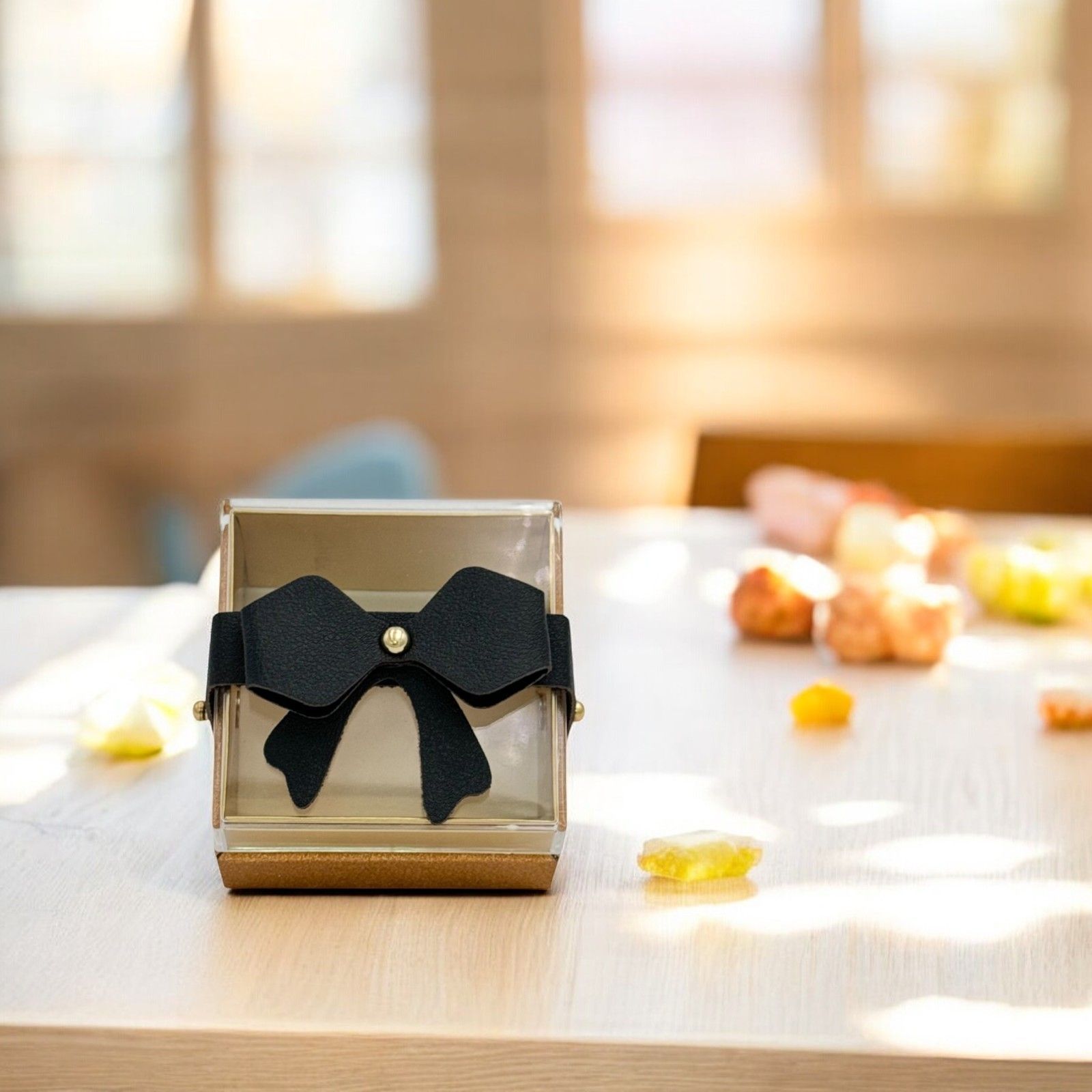 La scatola è dotata di un coperchio fissato con due chiodini laterali color oro e un fiocco centrale con dettagli oro, aggiungendo un tocco di classe e raffinatezza. Regalare questa bomboniera significa donare un piccolo pensiero di classe ai vostri ospiti. La trasparenza del plexiglass e la morbidezza del cartoncino creano un mix armonioso che renderà la vostra festa ancora più speciale. Utilizzatela come portaconfetti, segnaposto matrimonio o aggiungetela alla vostra confettata per un tocco di eleganza in più.