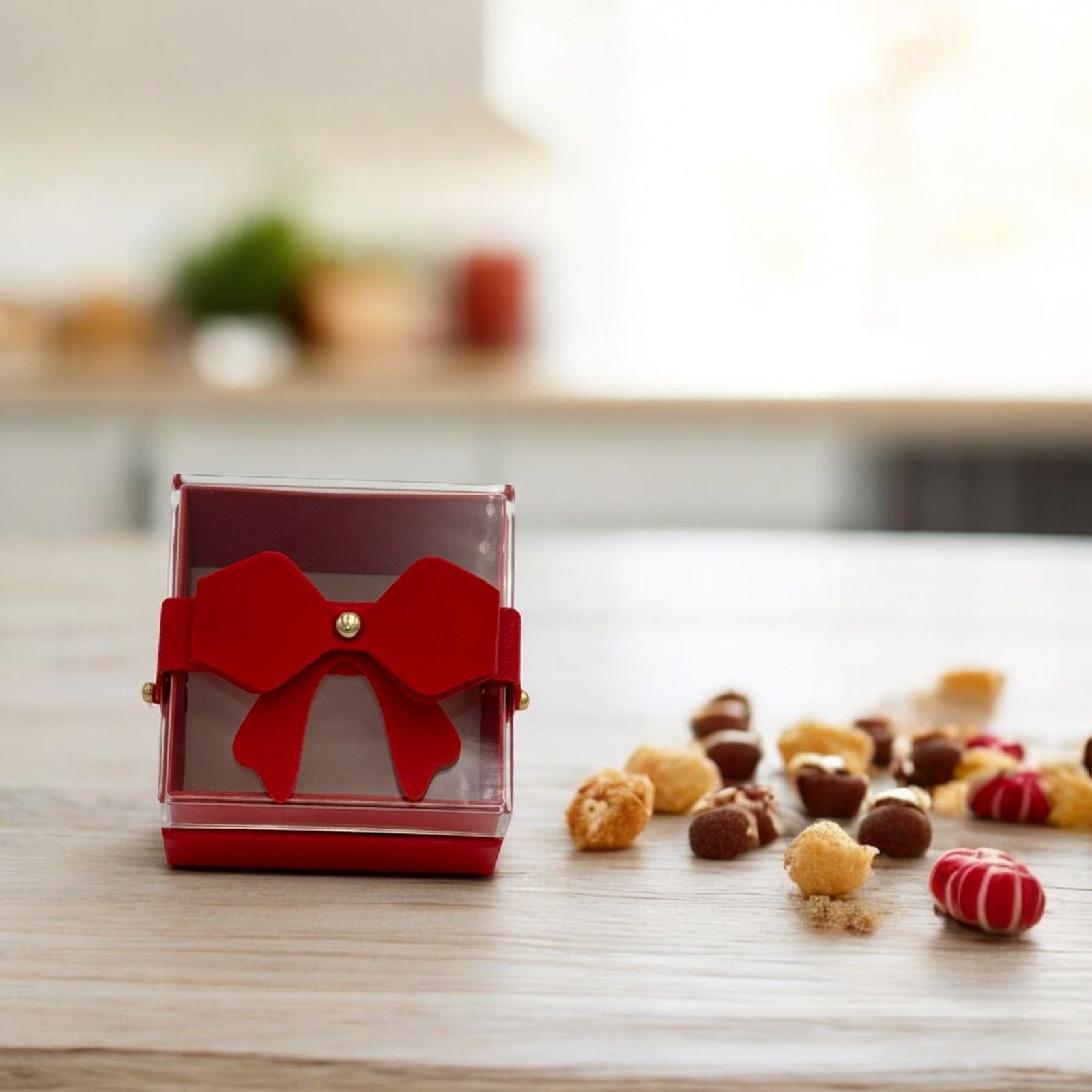Elegante e pratica, questa scatolina in cartone e plexiglass è ideale per contenere confetti o piccoli oggetti. Il coperchio è fissato con due chiodini oro a mo' di nastro, mentre un fiocco in ecopelle rossa aggiunge un tocco di classe. Le sue dimensioni di circa 68 x 6.8 x 4.6 cm la rendono perfetta per ogni evento speciale.