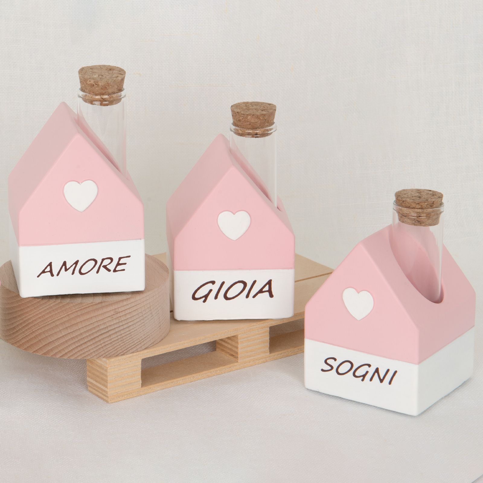 Questa scatolina a forma di casetta, realizzata in resina di alta qualità (6x6x8 cm), è il regalo perfetto per gli invitati alla cerimonia di nascita o battesimo di una bimba. Il design elegante, con la parte superiore rosa decorata con un cuoricino bianco, include uno spazio apposito sul tetto per inserire una provetta portaconfetti. Le parole “amore”, “gioia” e “sogni” aggiungono un tocco di significato emotivo.