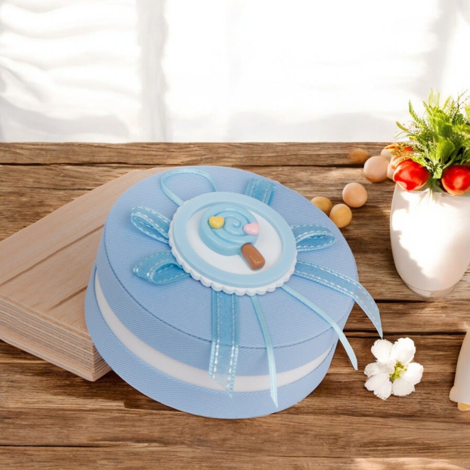 La scatolina rotonda con divisorio è un perfetto regalo da offrire agli invitati in occasione di eventi come nascite, battesimi, compleanni, baby shower e gender reveal. Realizzata in cartone rigido e tessuto, questa bomboniera è ideale per contenere confetti e altri gadget fine festa grazie ai suoi quattro scompartimenti. Decorata nella parte centrale del coperchio con lecca lecca candy e cuoricini, e con nastri celesti come da foto, aggiungerà un tocco di dolcezza e eleganza alla tua festa.