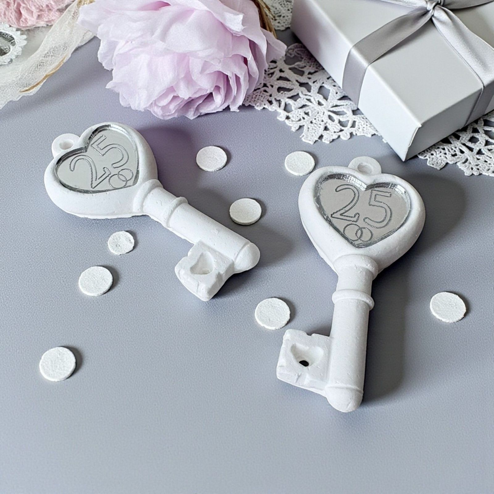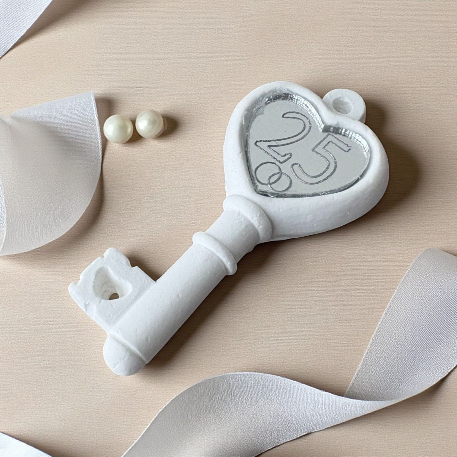 Realizzato in un raffinato mix di gesso bianco e plexiglass argentato, questo ciondolo è l'ideale per personalizzare le vostre bomboniere per il 25° anniversario di matrimonio. Potete utilizzarlo come chiudipacco o come applicazione su scatoline e sacchettini, rendendo ogni regalo unico e indimenticabile. Il suo design delicato e luminoso aggiunge un tocco di eleganza che farà brillare il vostro evento.