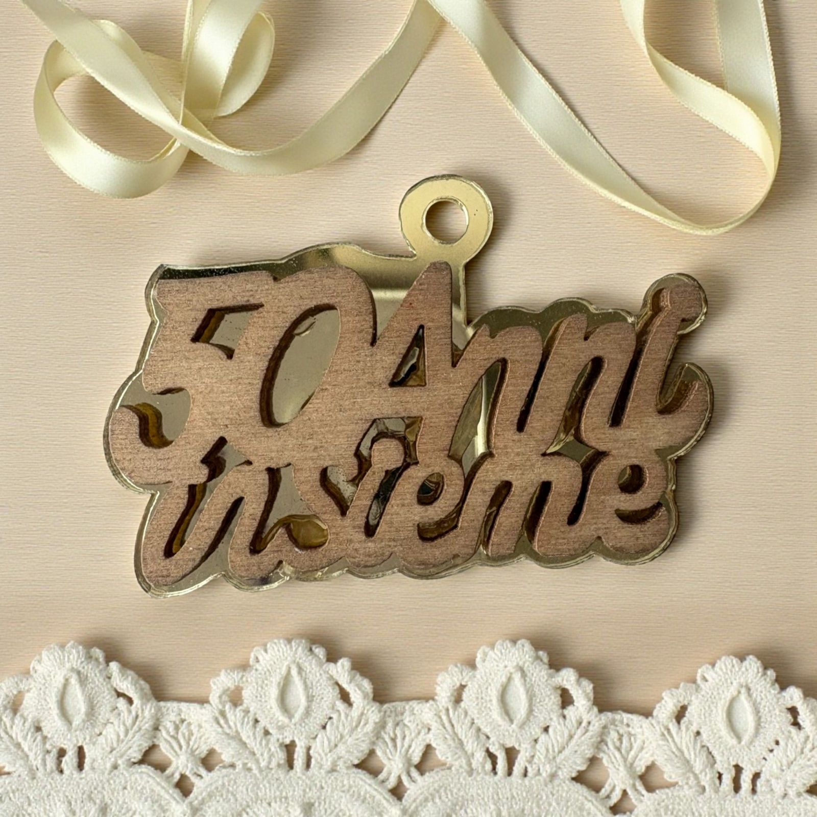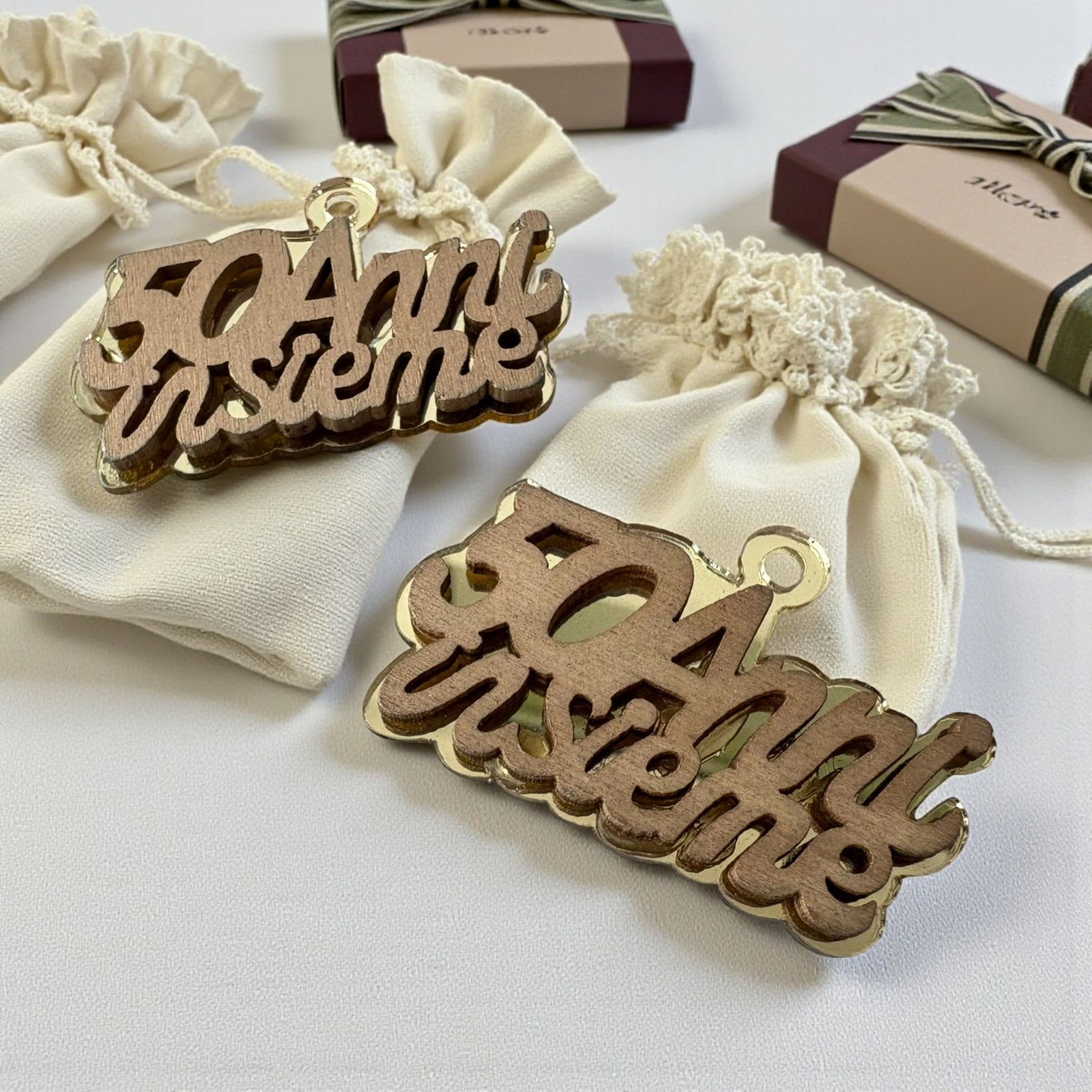 Celebrare un 50° anniversario di matrimonio è un momento unico e indimenticabile, e le nostre bomboniere "50 anni insieme" in oro sono il modo perfetto per rendere omaggio a questa straordinaria tappa. Ogni calamita, realizzata in plexiglass dorato e legno, rappresenta la solidità e la bellezza di un legame che dura da mezzo secolo. Con questa bomboniera, non solo offri un ricordo tangibile, ma anche una testimonianza dell'amore che ha attraversato il tempo.
