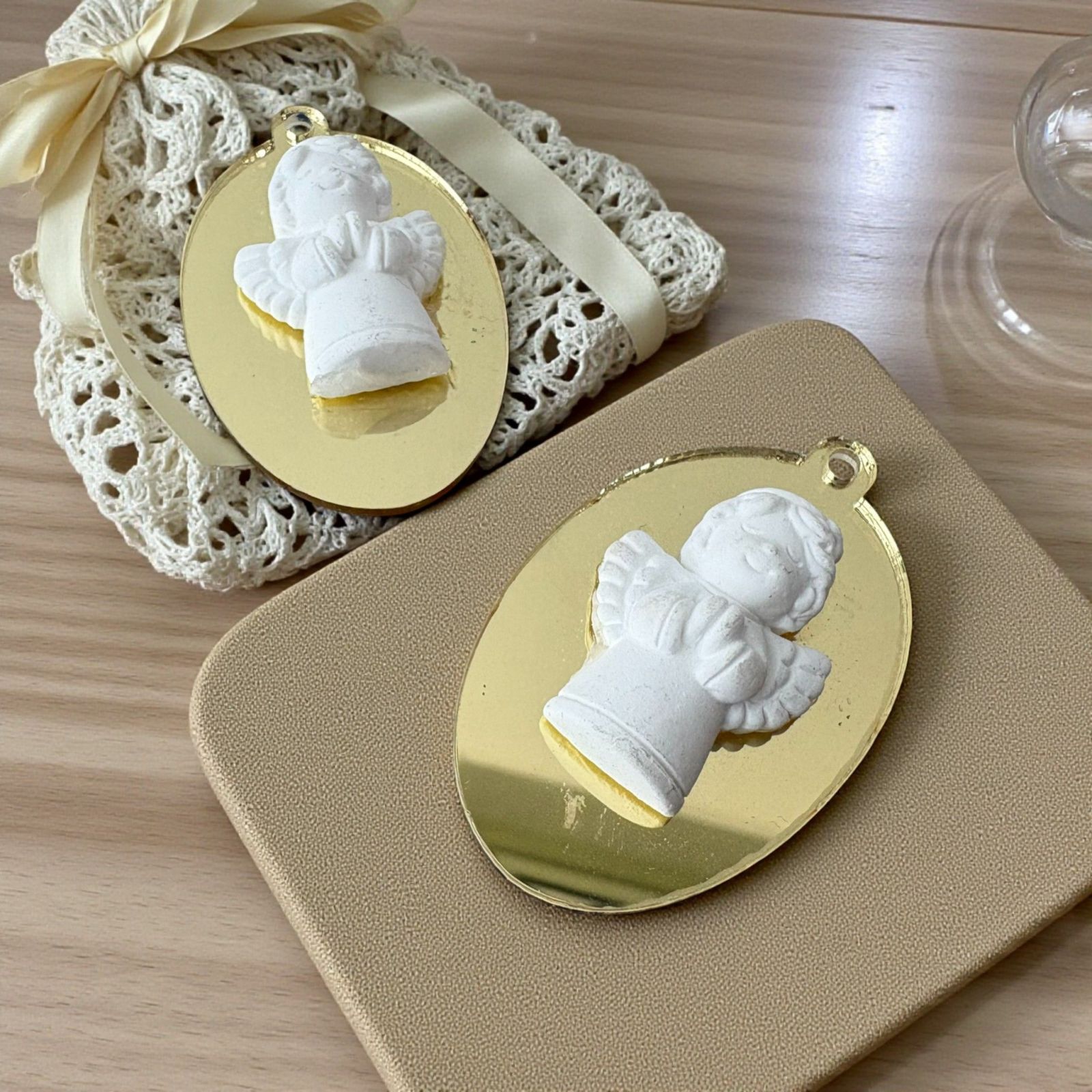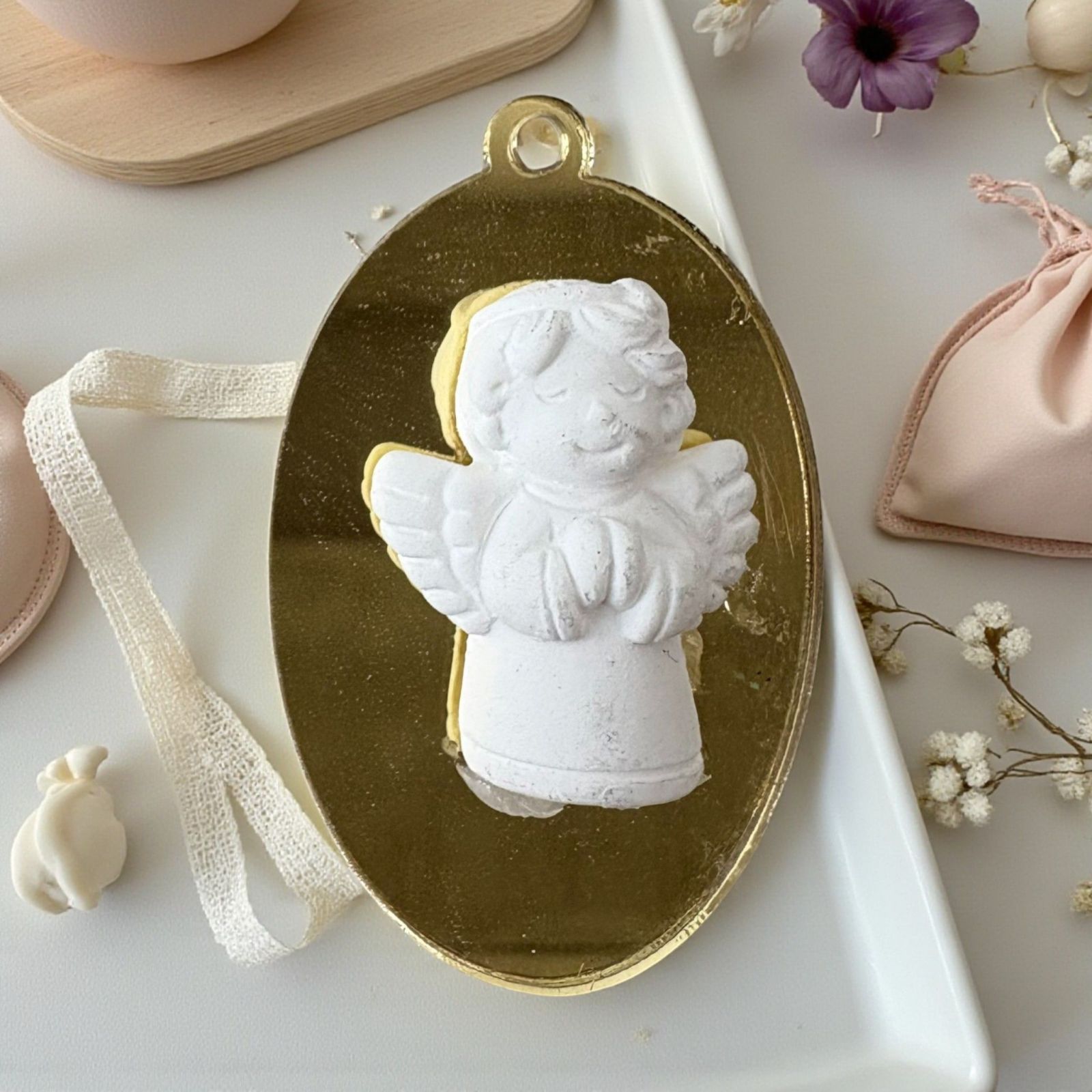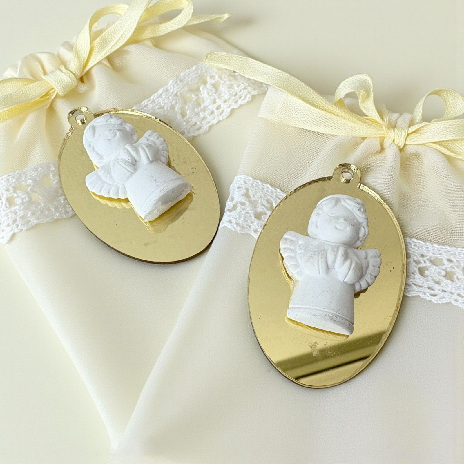 Realizzato in un affascinante oro specchiato e bianco, il nostro ciondolo si distingue grazie alla sua particolare combinazione di materiali, con un fondo in plexiglass e un angelo in gesso bianco. Le sue linee delicate e la lucentezza dorata cattureranno l’attenzione di chiunque, rendendo le tue bomboniere comunione non solo un regalo, ma un ricordo prezioso da custodire.