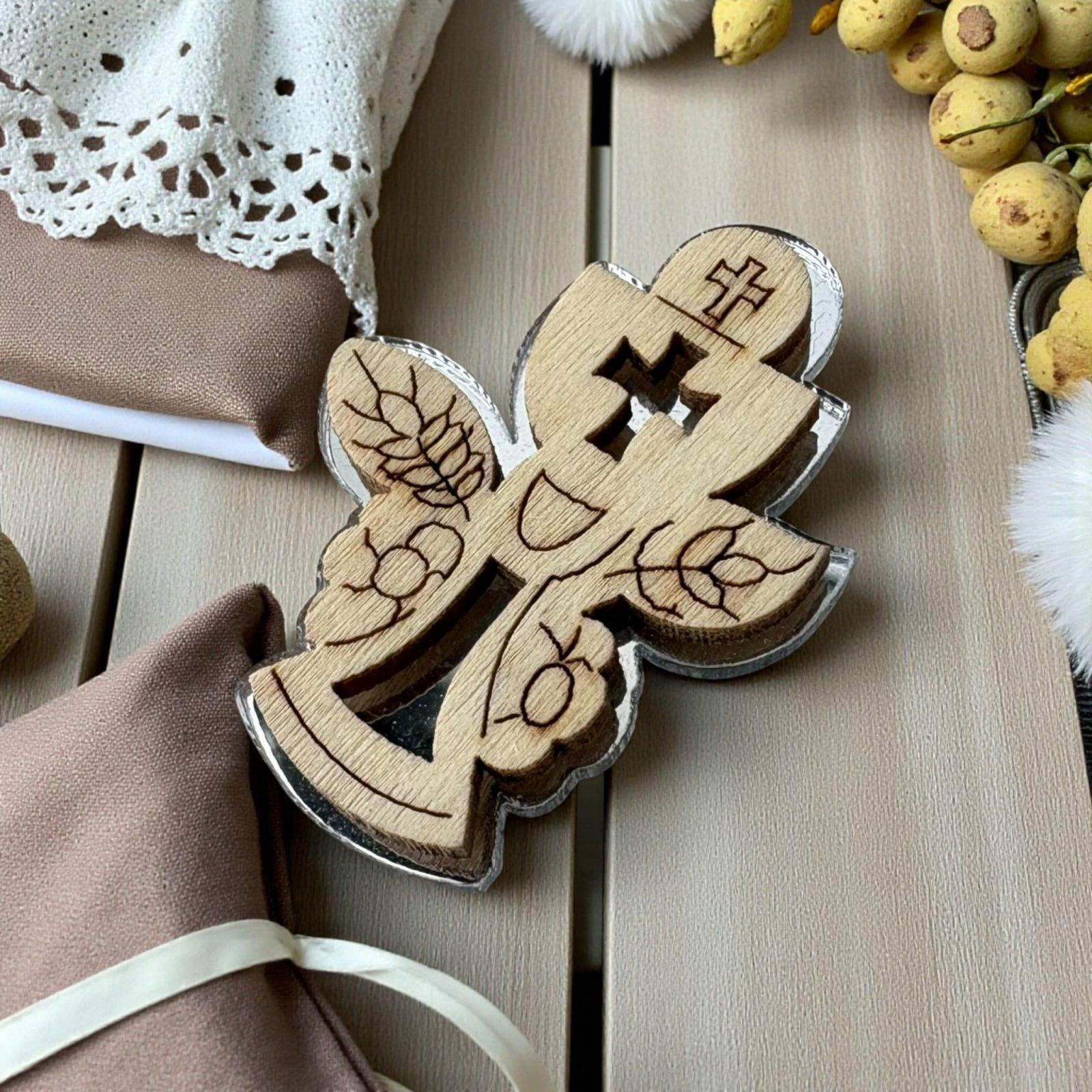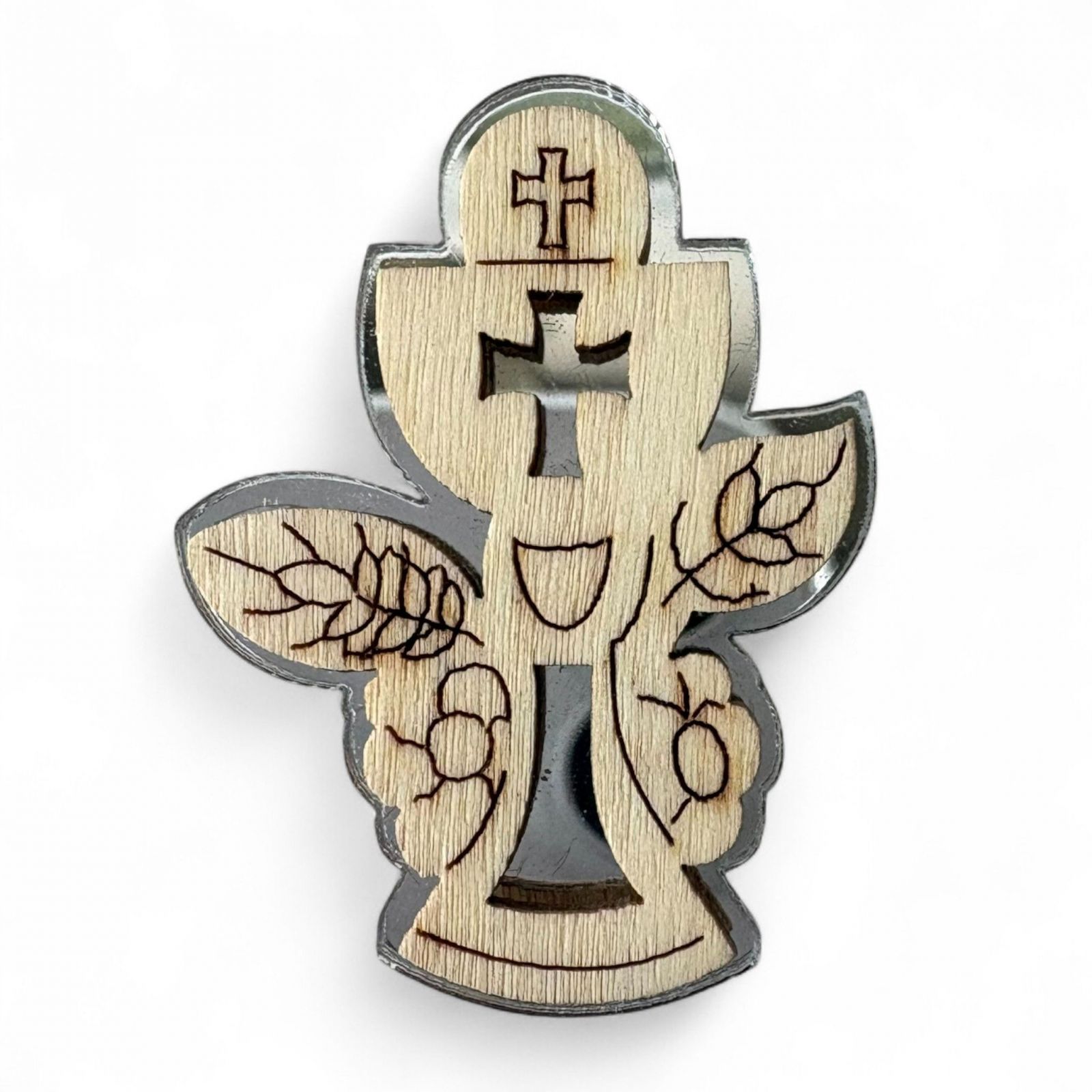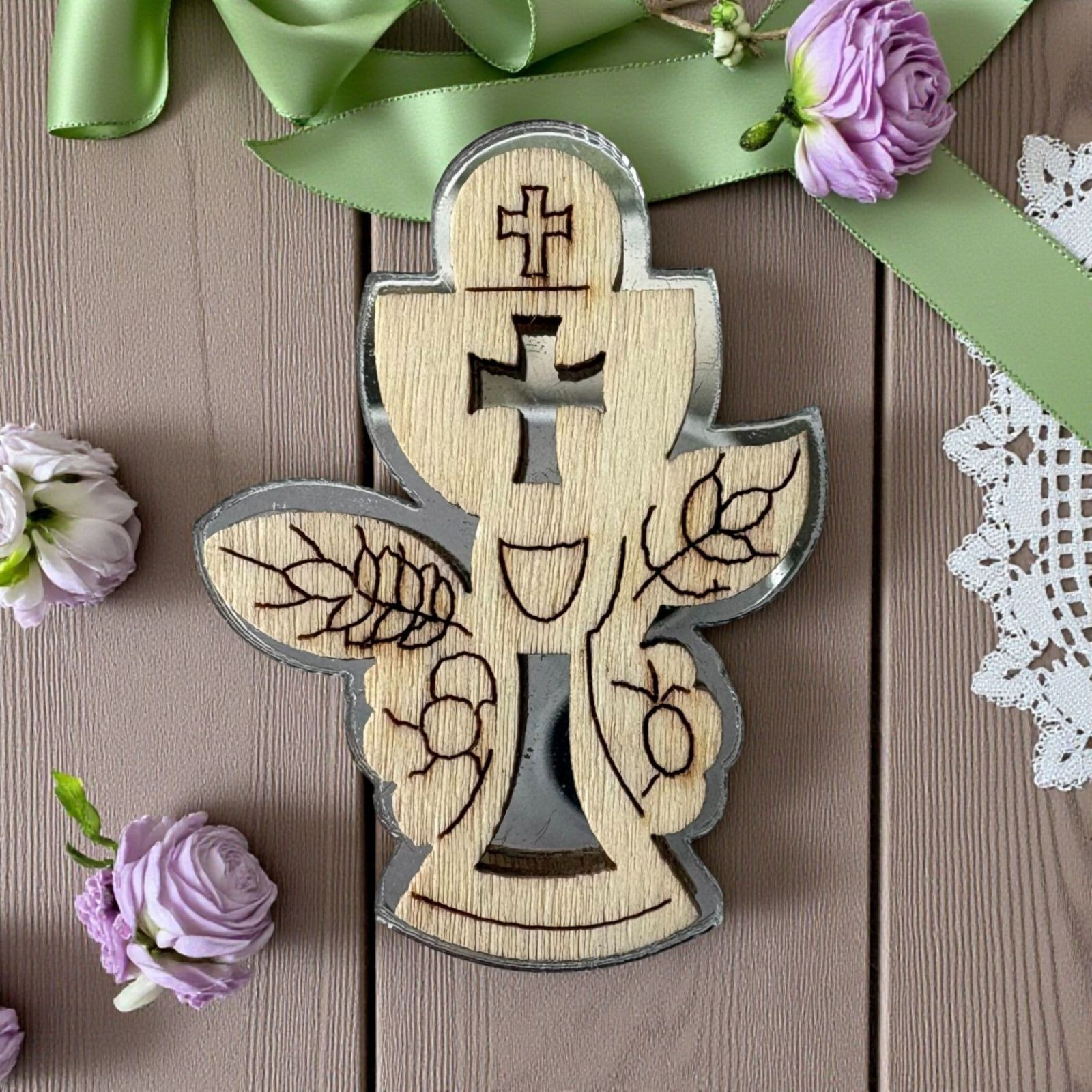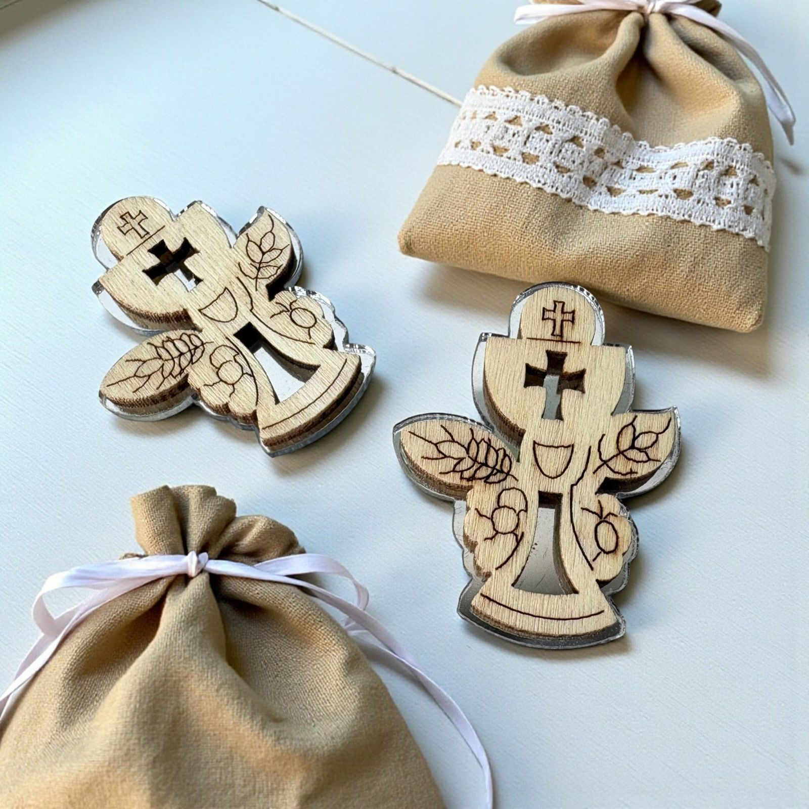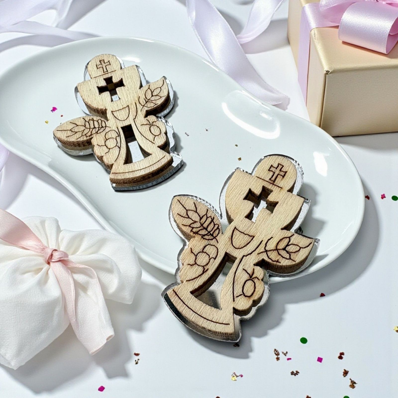 Realizzata con un affascinante fondo argentato in plexiglass e una delicata sagoma superiore in legno, questa applicazione è ideale sia per le bomboniere comunione bambino che per le bomboniere comunione bambina. La combinazione di materiali conferisce un aspetto elegante e contemporaneo, capace di incantare ogni invitato e di rendere memorabile il giorno della tua celebrazione.