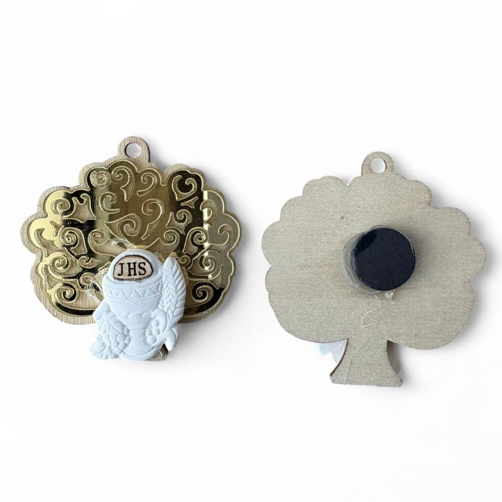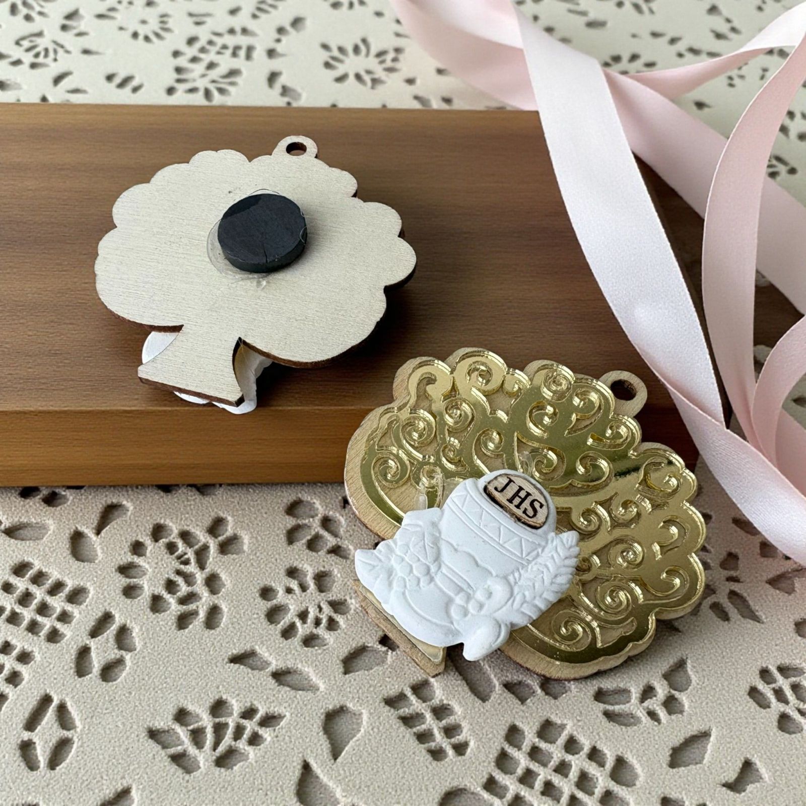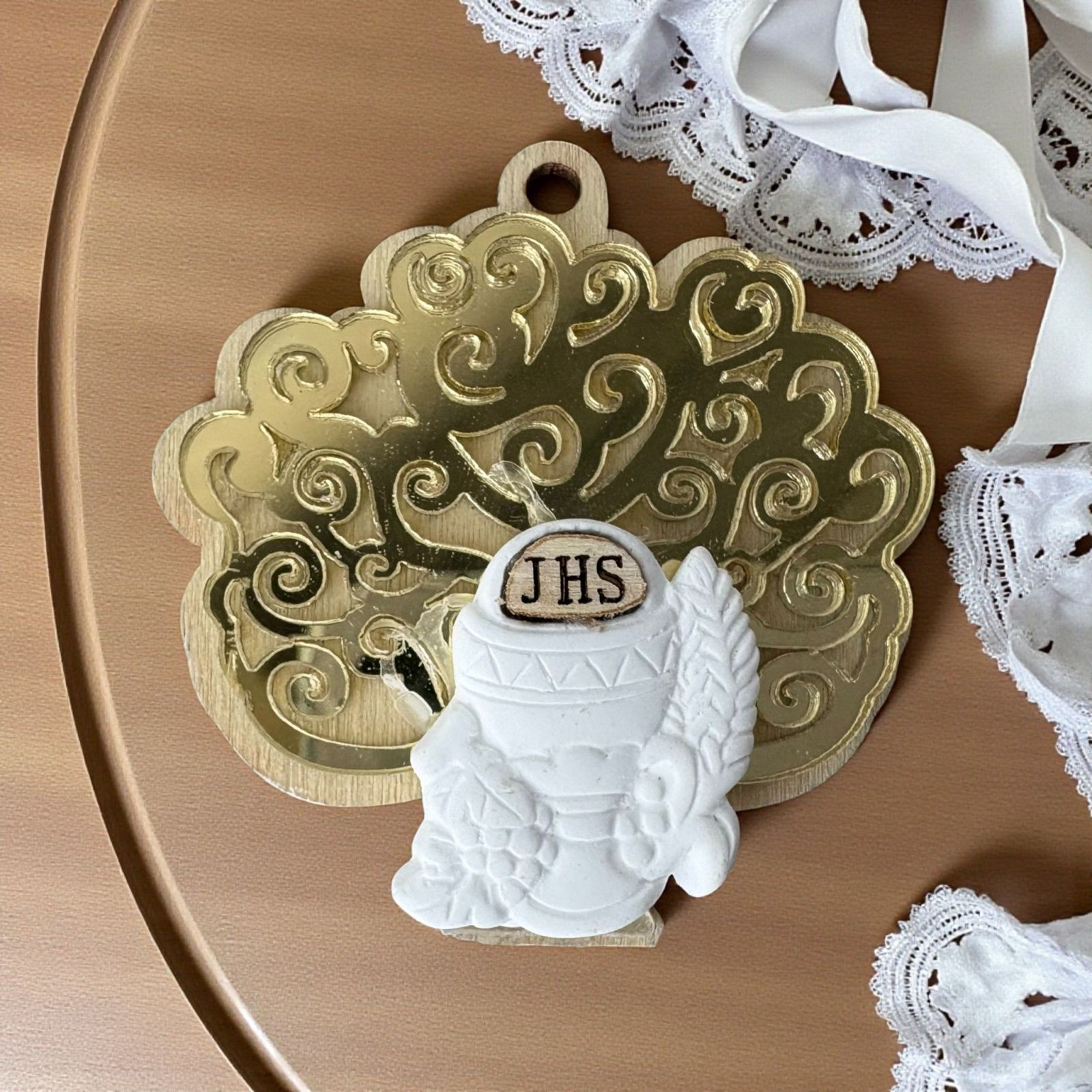 Realizzato con cura, il magnete presenta un raffinato colore oro specchiato, legno e bianco, che si integrano armoniosamente per offrire un tocco di eleganza alla tua confettata. Il fondo in legno offre stabilità e calore, mentre la sagoma dell’albero in plexiglass dorato aggiunge un tocco contemporaneo. Il gessetto calice e ostia bianco rappresenta il sacramento e i valori della fede, rendendo questa bomboniera perfetta anche come segnaposto per i tuoi ospiti.
