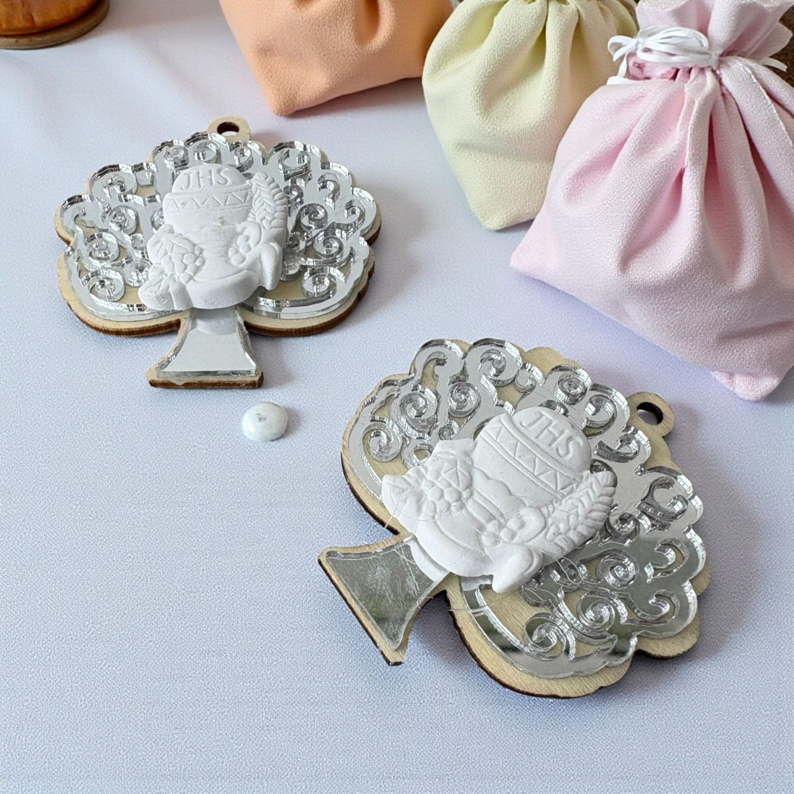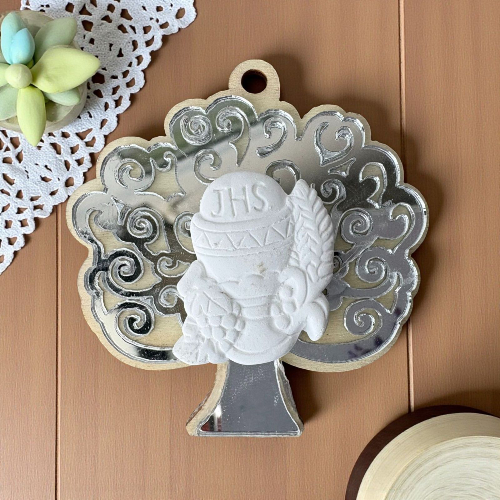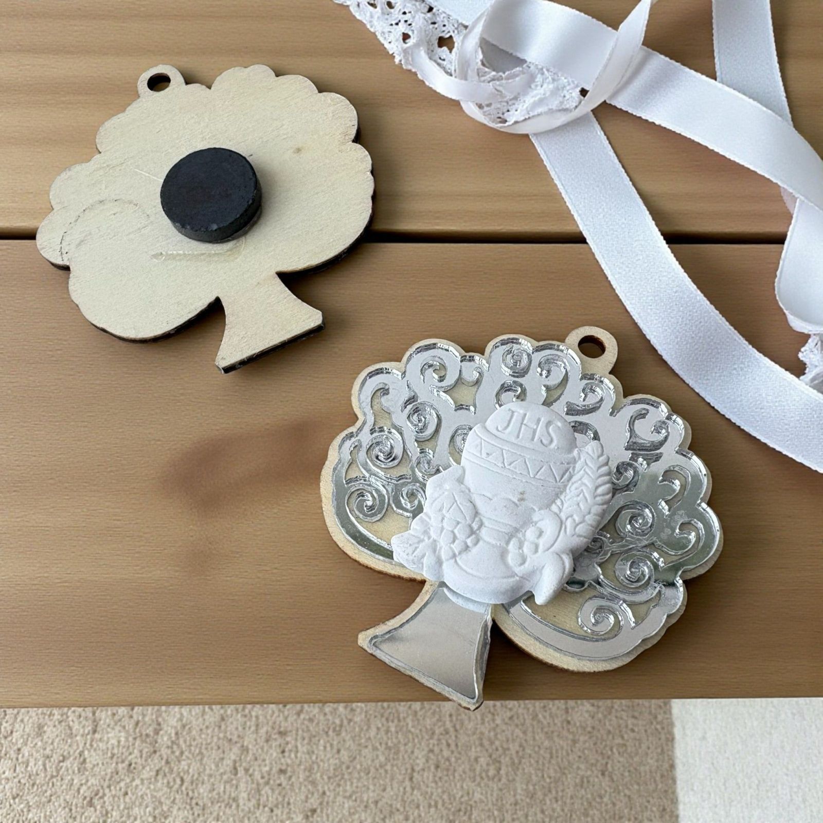Realizzata con materiali di alta qualità come il plexiglass argentato e il legno pregiato, questa bomboniera per la comunione è un perfetto equilibrio tra eleganza e spiritualità. Il delicato gessetto a forma di calice e ostia, dipinto di bianco, aggiunge un tocco di dolcezza e purezza, rendendo questa calamita un segnaposto ideale per la vostra confettata.