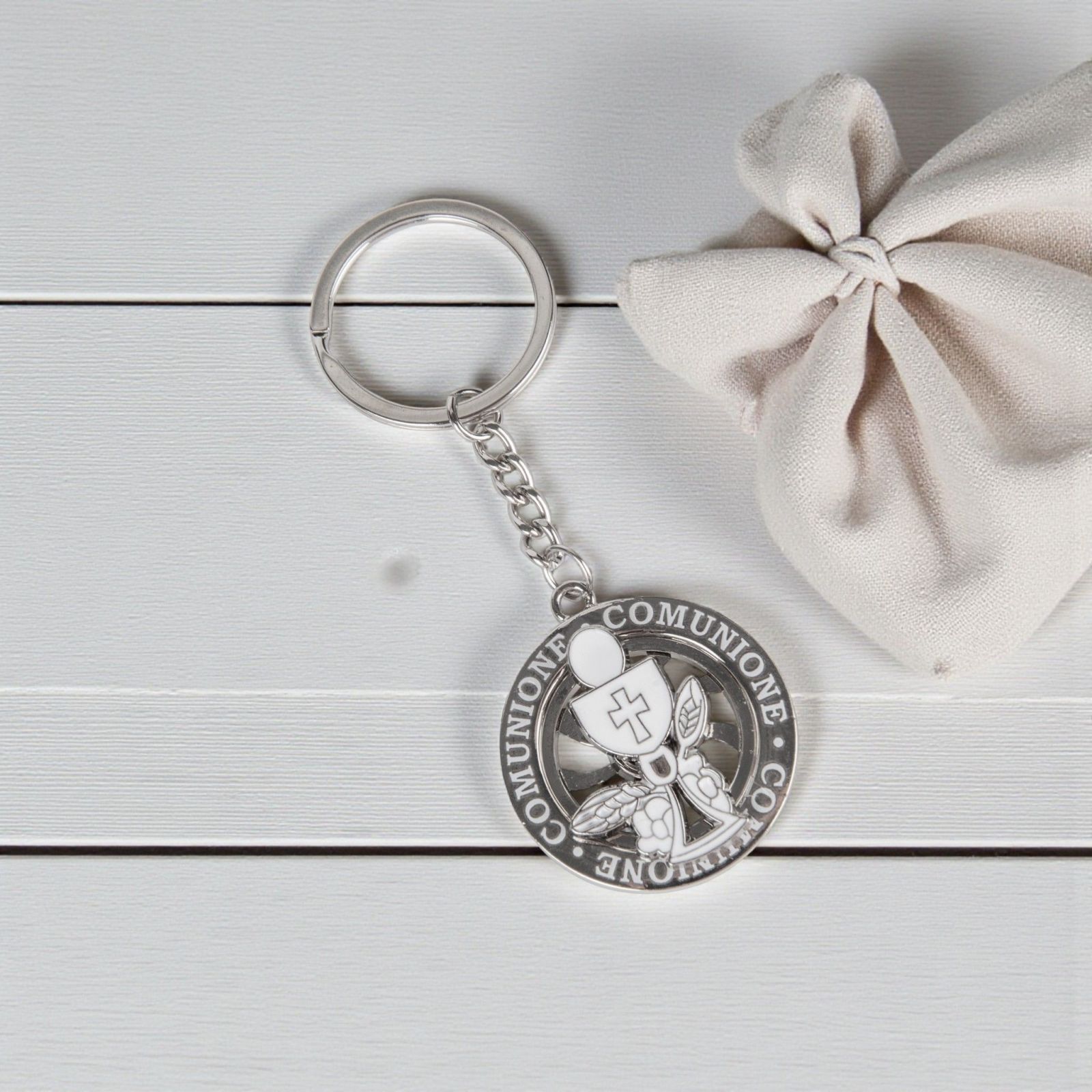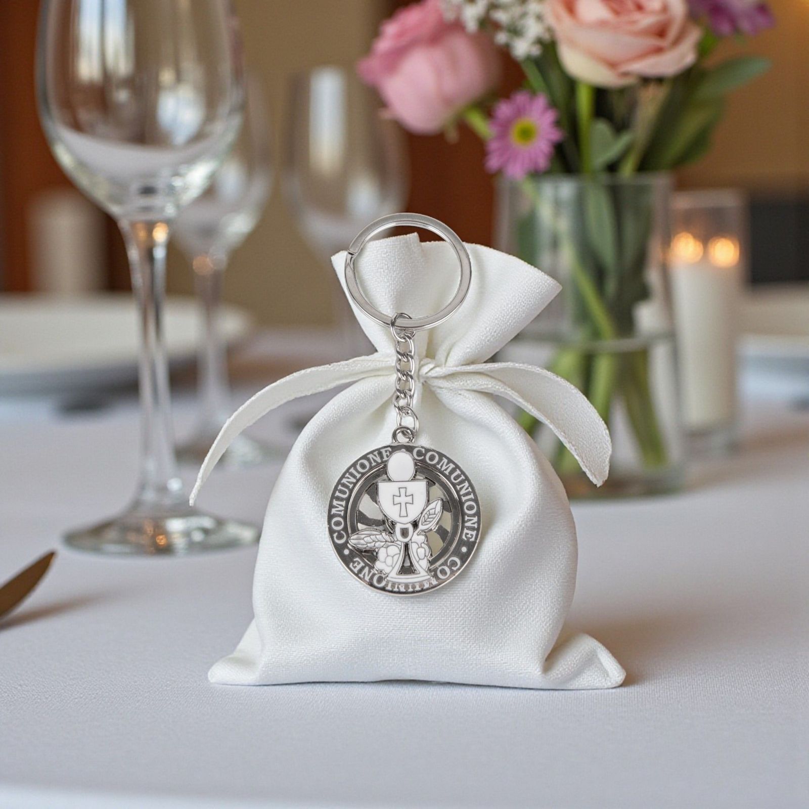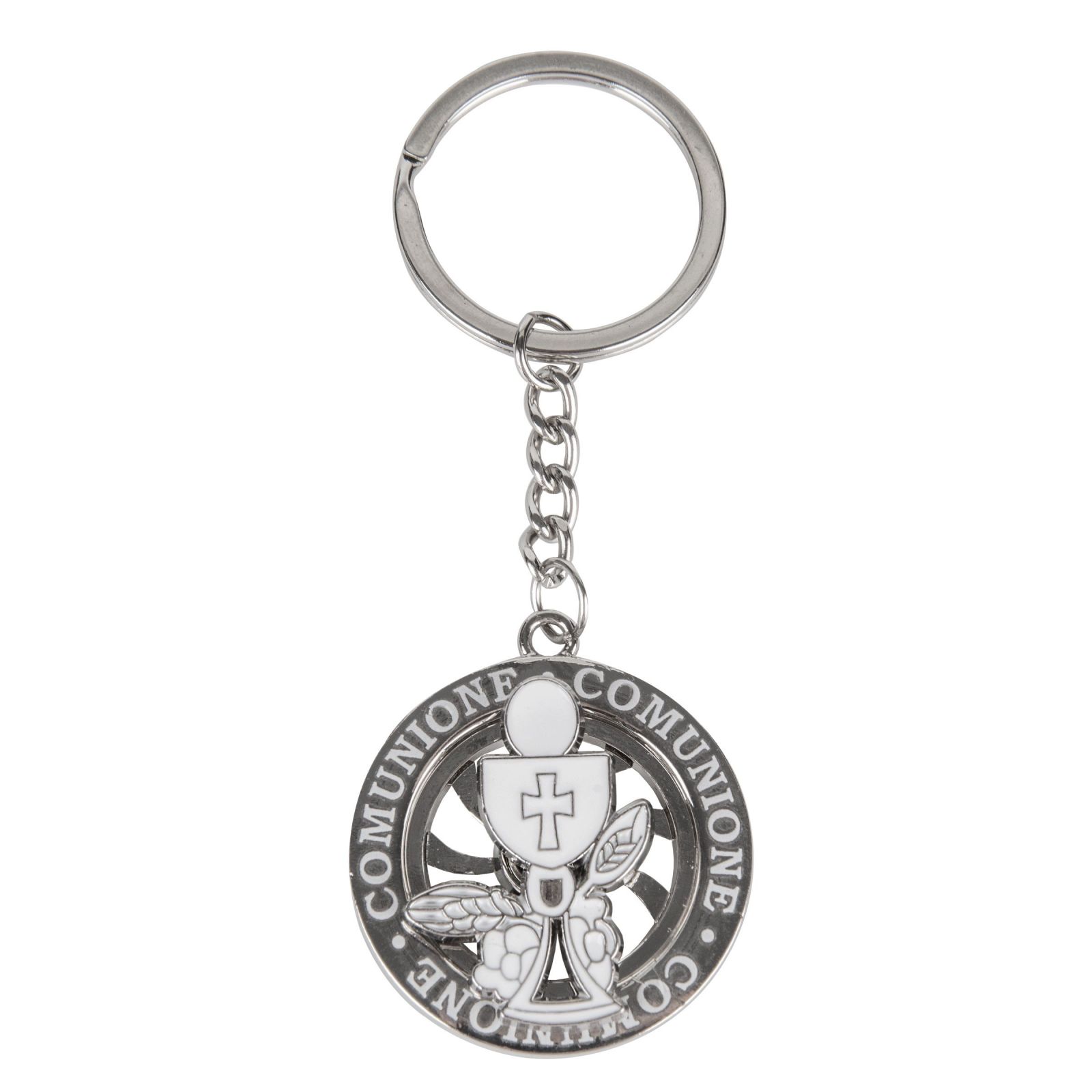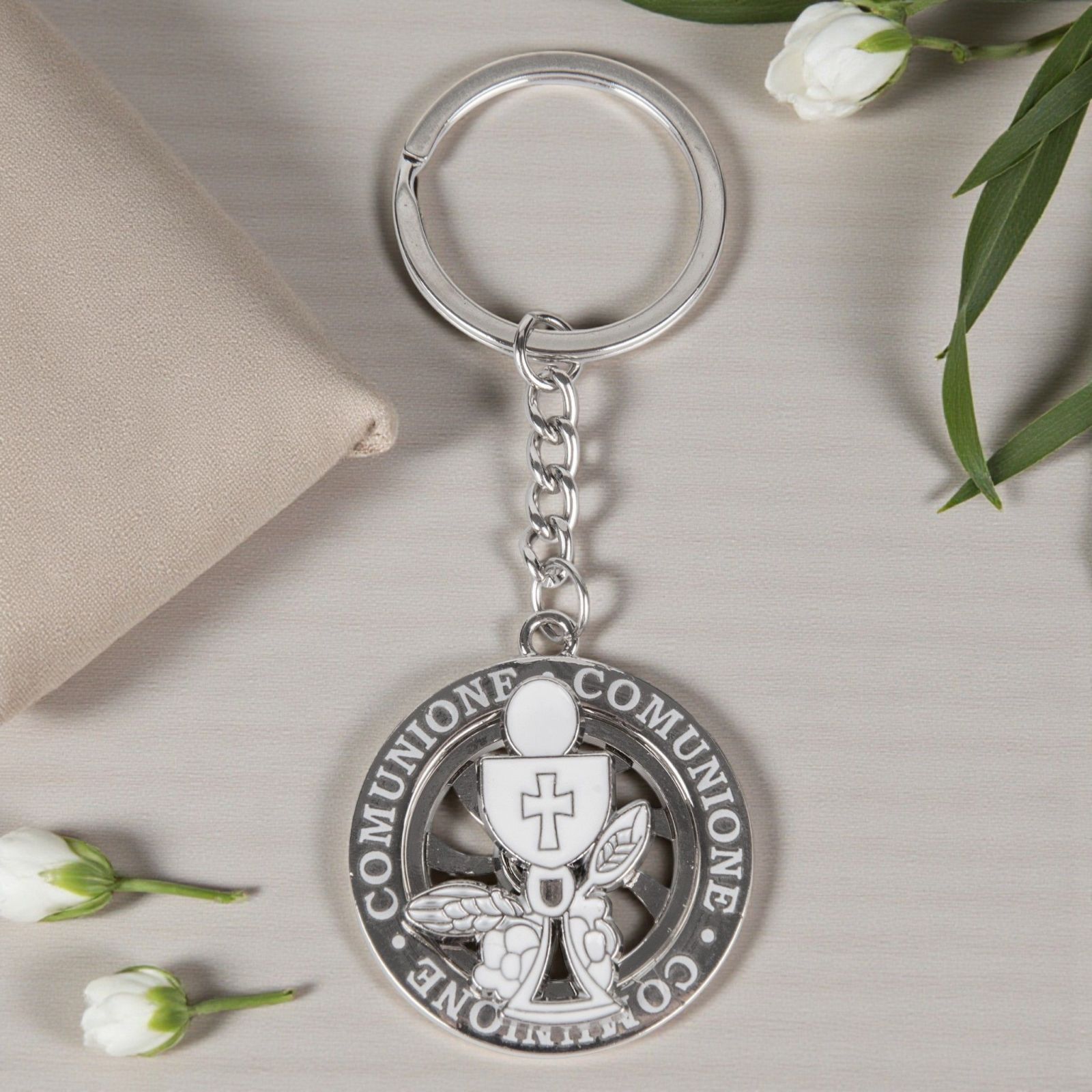 La bomboniera perfetta per celebrare un momento così speciale come la prima comunione è un regalo che racchiude significato e bellezza. Questo portachiavi ruota con la scritta "Comunione" e simboli sacri come il calice e l'ostia è un oggetto unico, capace di diventare un prezioso ricordo per tutti gli ospiti. Ogni volta che lo guarderanno, rivivranno l'emozione di quel giorno indimenticabile.