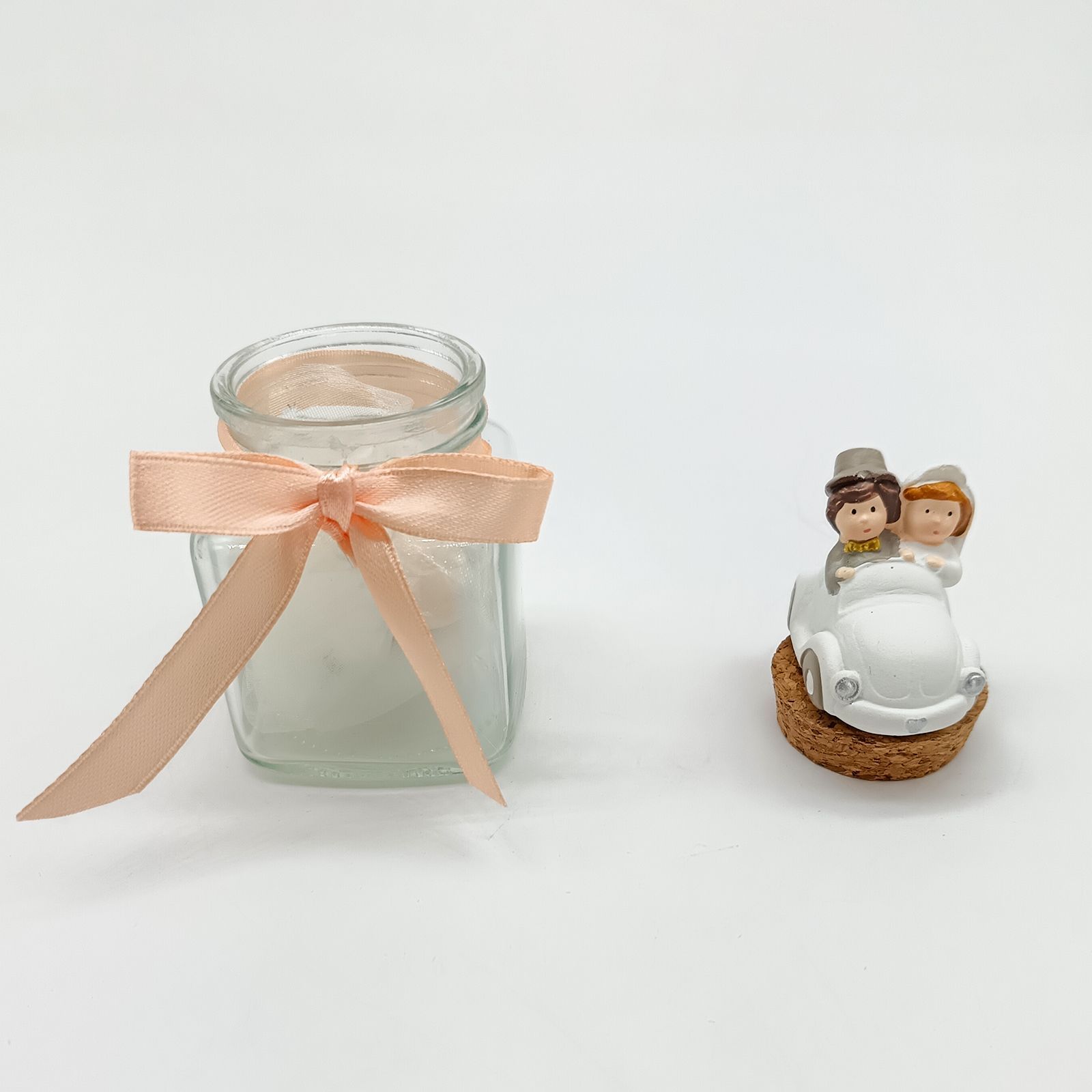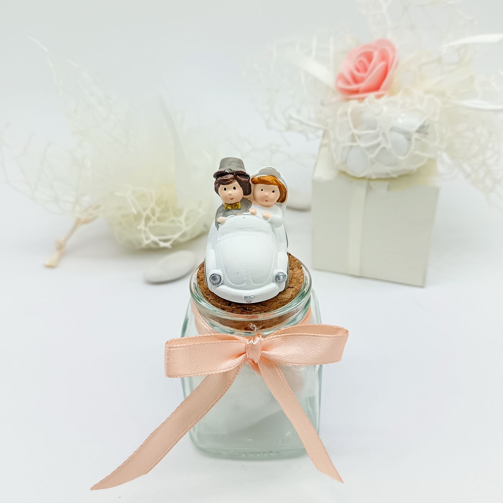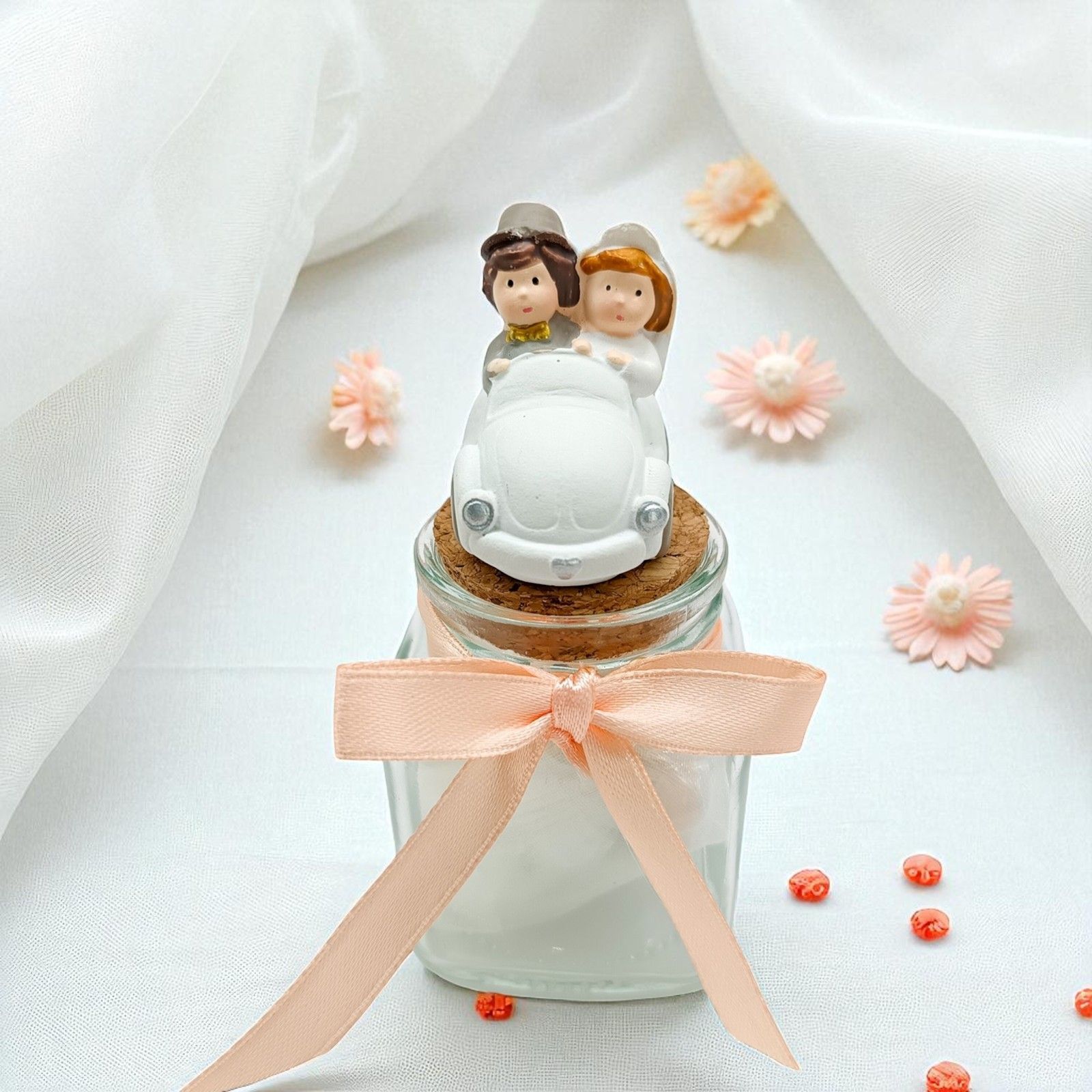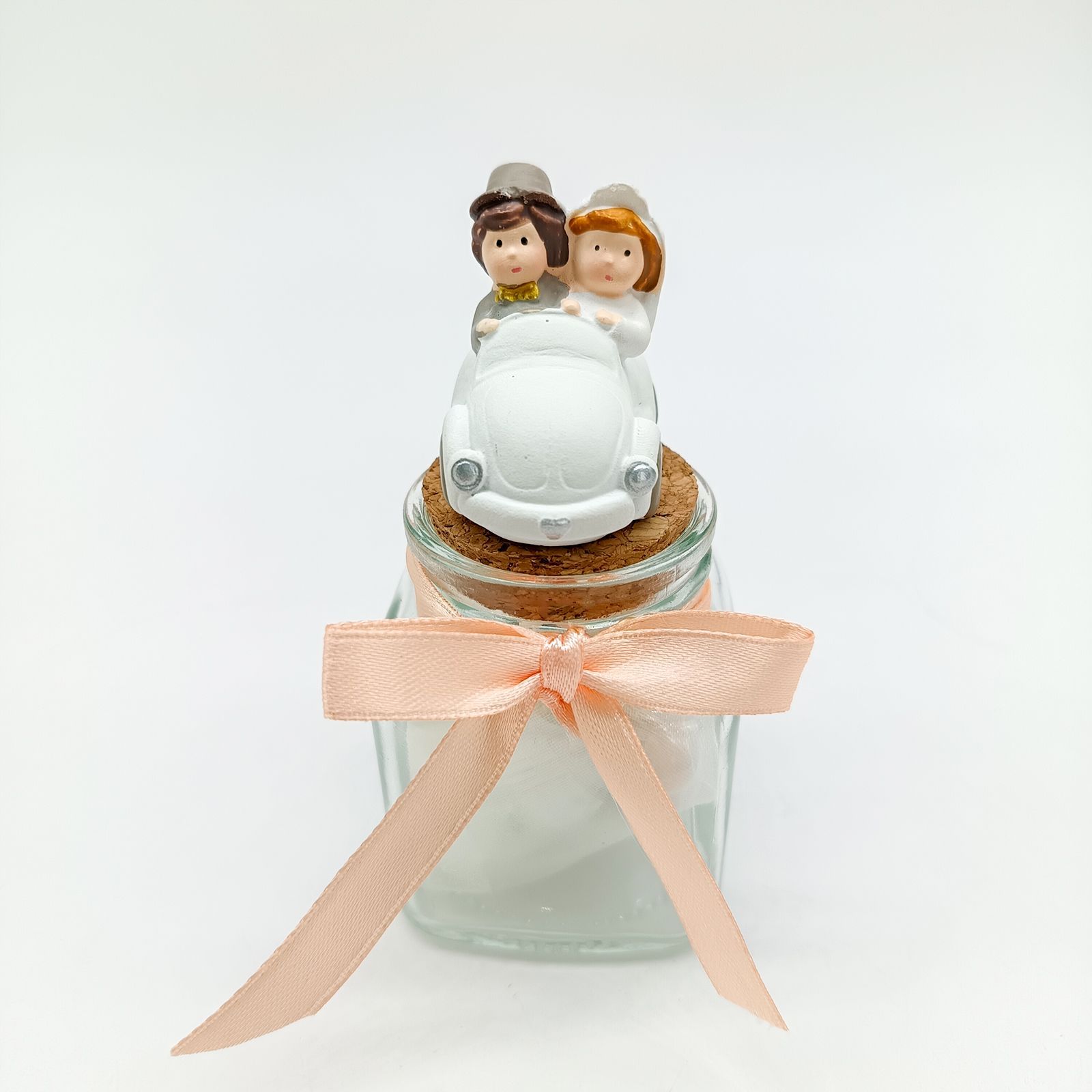 Un tocco dolce e creativo per il tuo matrimonio, anniversario o promessa: questo elegante barattolino in vetro con tappo in sughero è sormontato da una simpatica statuina in resina con due sposini in auto, perfetta per eventi a tema viaggio. Le delicate tonalità pastello lo rendono ideale per aggiungere colore e romanticismo alla tua confettata.