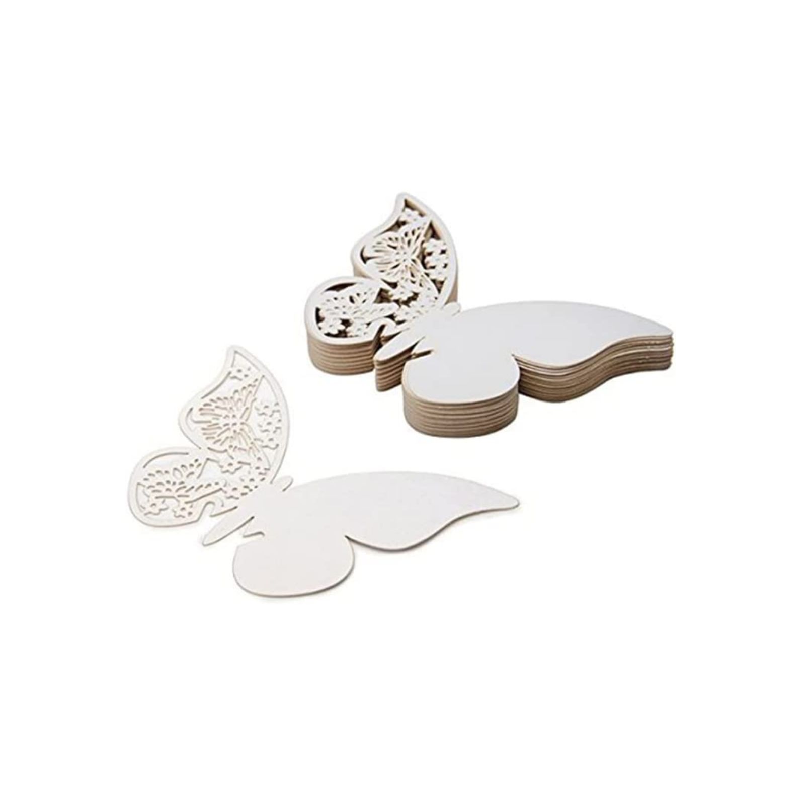 Acquista questi incantevoli segnaposti tavolo cerimonia a forma di farfalla bianca in cartoncino, con un'ala completamente bianca per poter scrivere il nome dei tuoi invitati ed un'altra delicatamente incisa al laser con un decoro floreale.