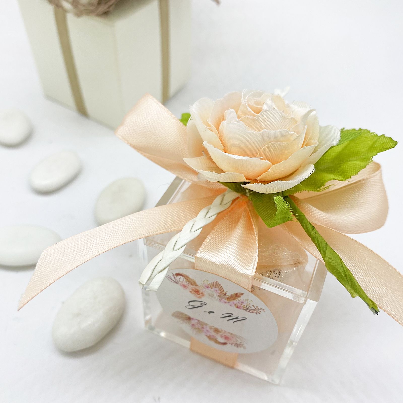 La scatolina è realizzata in plexiglass trasparente a forma di cubo, con dimensioni di circa 5 x 5 x 5 cm. Caratterizzata da un tocco di eleganza, la bomboniera presenta un grazioso fiore sovrapposto tonalità pastello, con foglie e con uno stelo in cordoncino color panna come da foto. Il tutto è chiuso da un raffinato nastrino, aggiungendo un ulteriore tocco di grazia al regalo. Sulla parte frontale della scatolina è presente un adesivo con stampa personalizzata, che può essere ideale per includere il nome dell'evento, la data o il nome del festeggiato. Non è possibile scegliere il colore del fiore, del fiocco e del tag, ma dal menu' a tendina è possibile selezionare se stampare o meno il testo e la scritta per un ordine minimo di 10 pezzi.