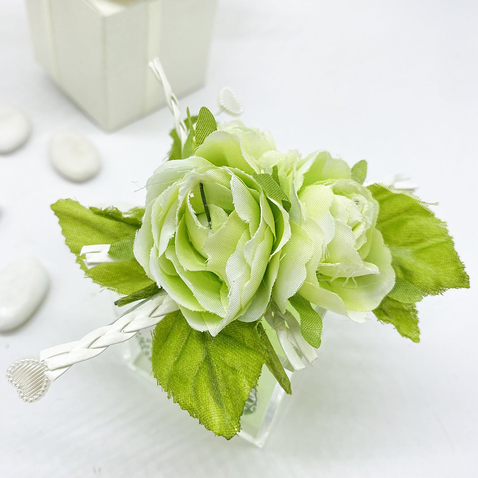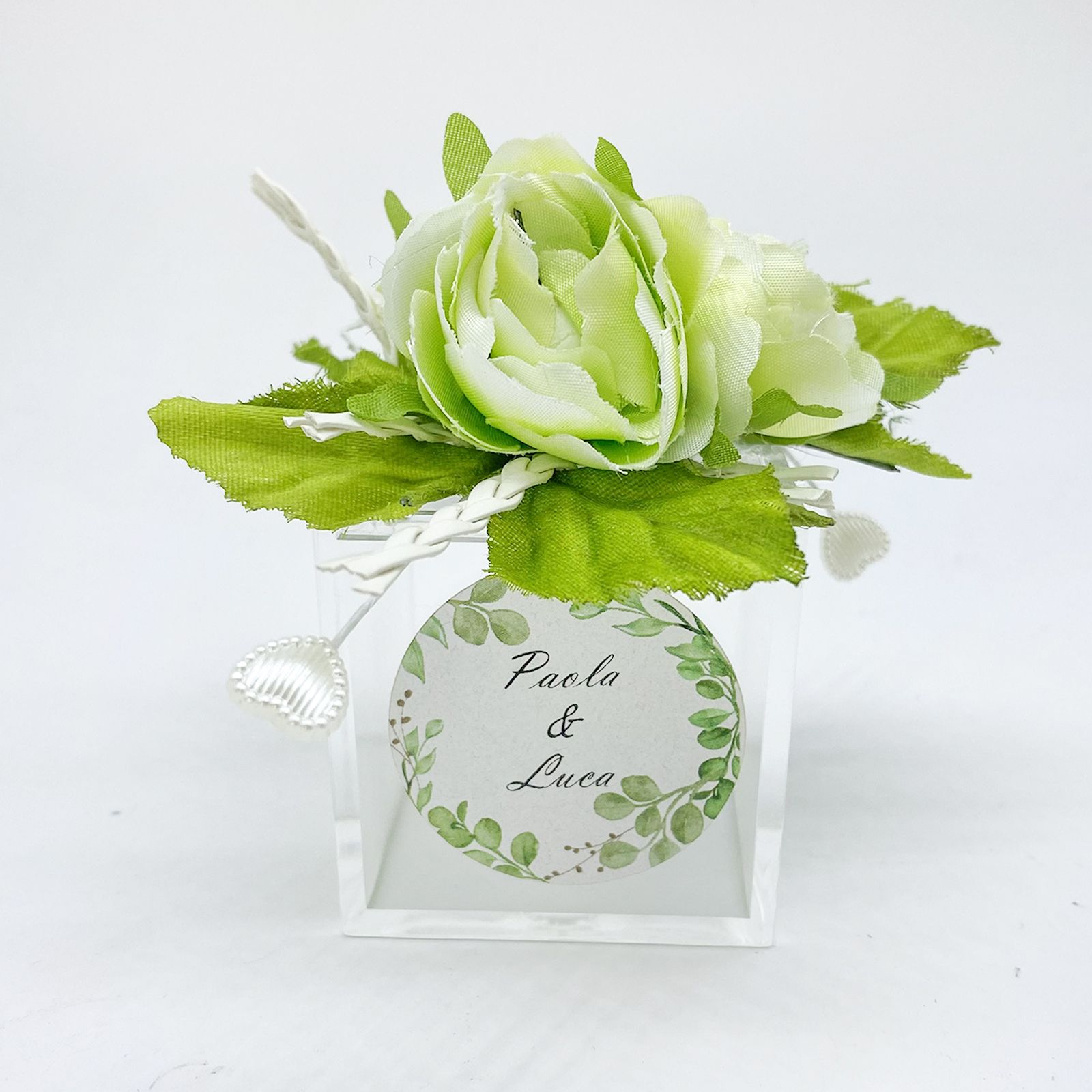 Esalta i momenti più speciali della tua vita con questa raffinata bomboniera floreale. Questa esclusiva scatolina in plexiglass trasparente, a forma di cubo, è impreziosita da tre delicati fiori verdi, foglie e uno stelo in cordoncino color panna. Sul fronte è inserito un adesivo personalizzabile con foglie verdi dove poter stampare il nome e la fata dell'evento.Un regalo unico ed elegante, perfetto per celebrare importanti occasioni come battesimi, prime comunioni, cresime, matrimoni, anniversari, promesse di matrimonio e 18 anni.