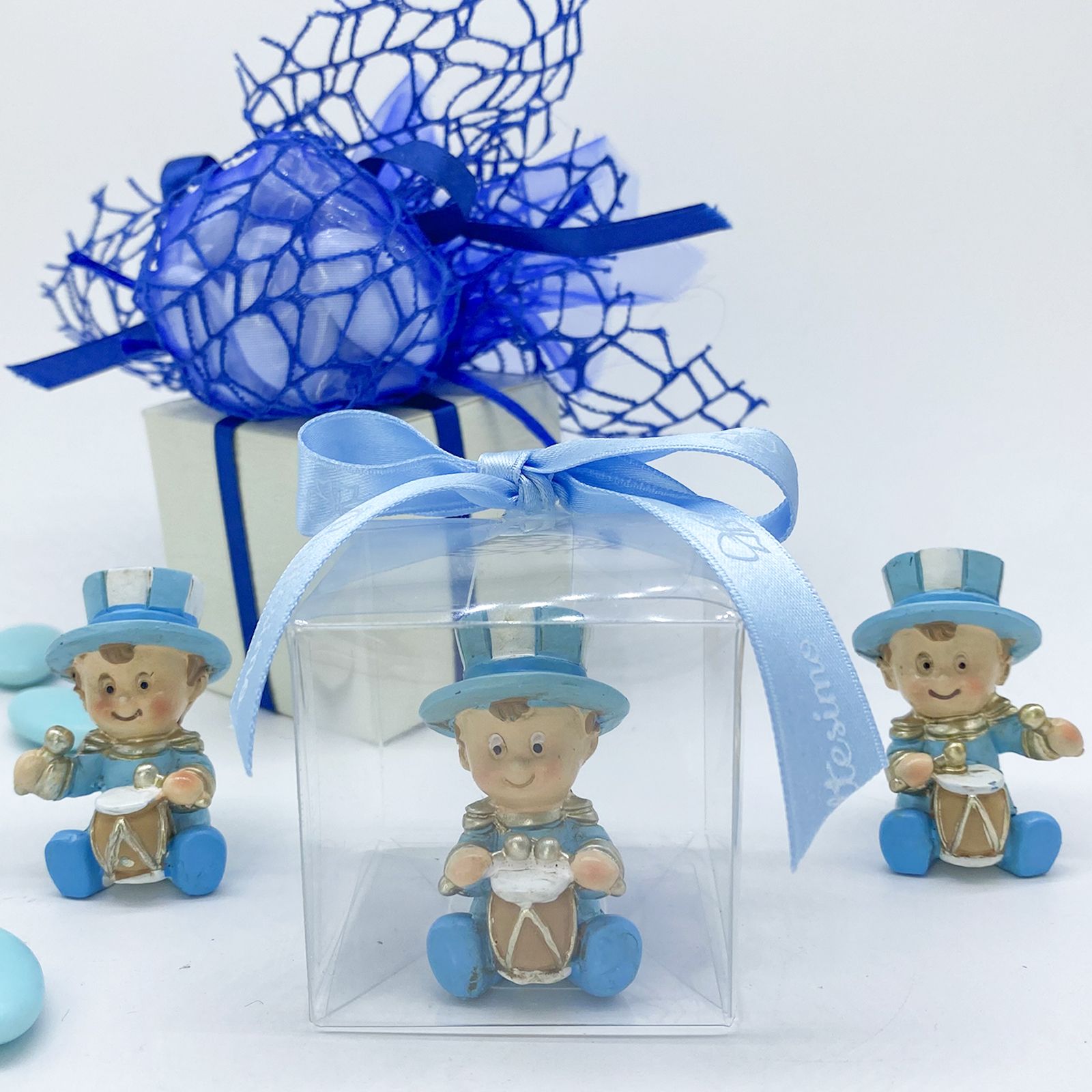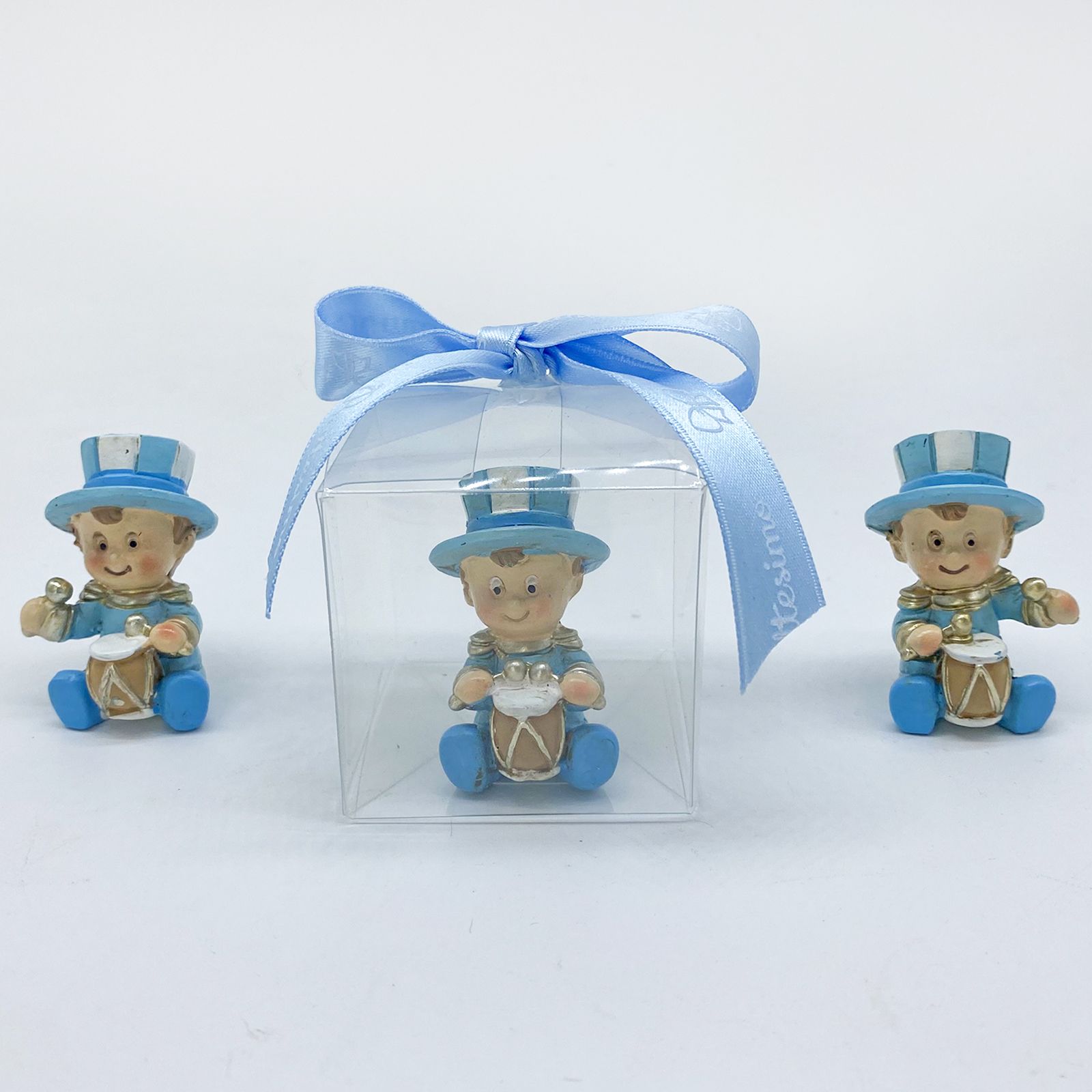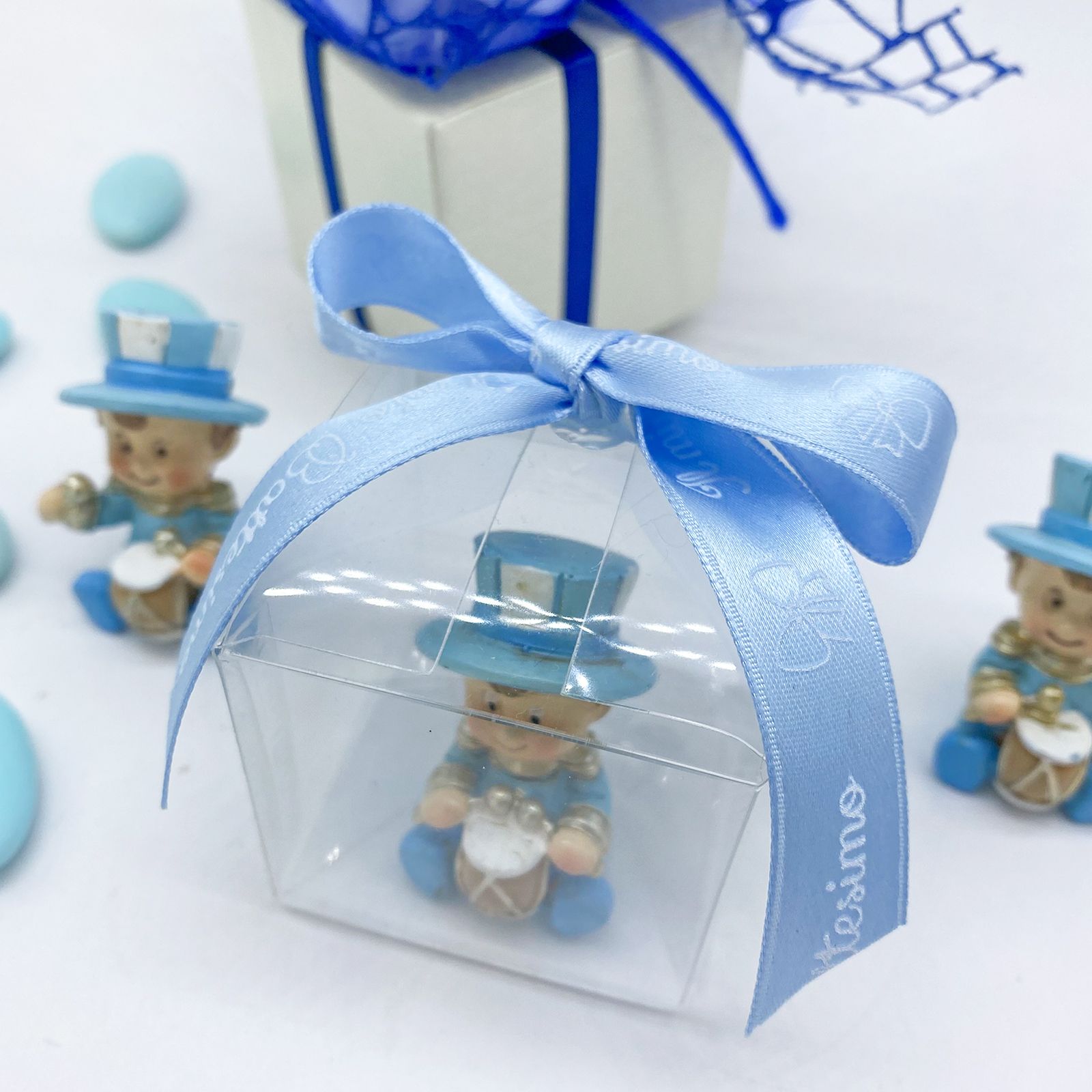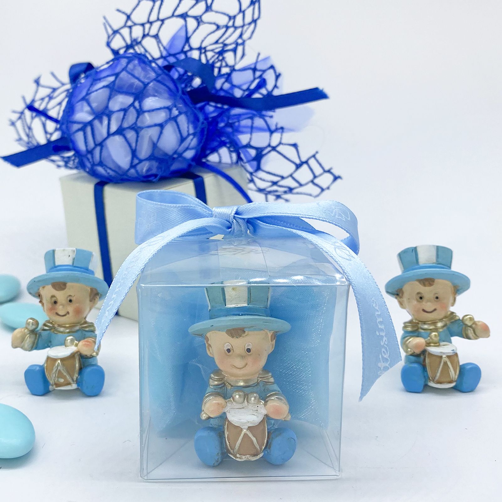 La scatolina trasparente in PVC è una scelta versatile ed economica per creare splendide confettate per eventi speciali come nascite, battesimi e compleanni. Al suo interno, troverai una statuina del simpatico bimbo jolly seduto con un tamburello, indossando una divisa celeste con dettagli oro e un cappello a cilindro. Ogni statuina è assortita in varie posizioni, rendendo ogni pezzo unico e speciale.