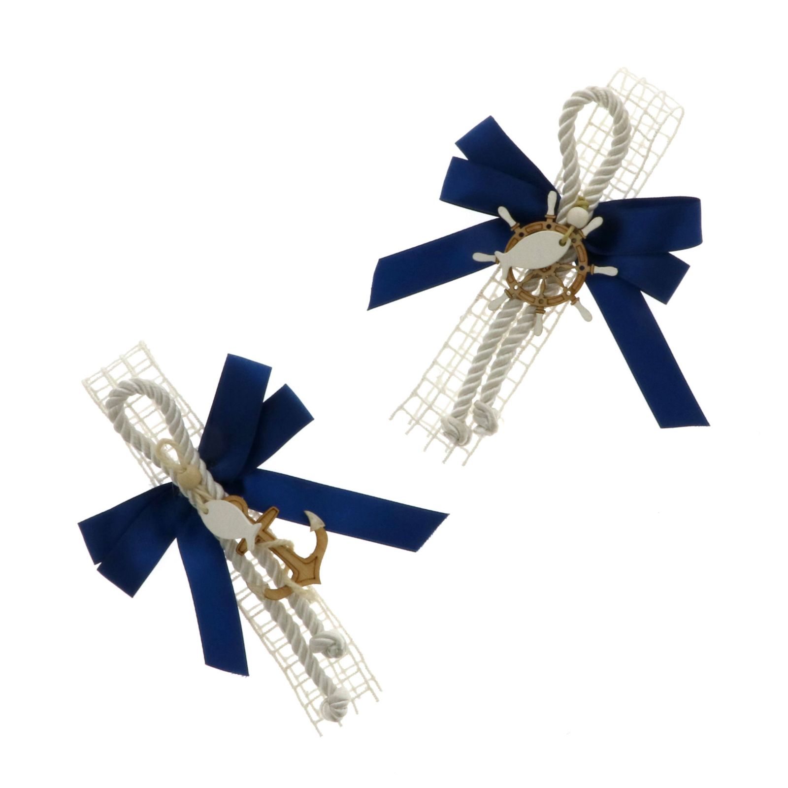 Vi presentiamo un segnaposto tema mare con nastro blu , corda, rete e merletto assortito in due varianti con ancora e pesciolino o con timone e pesciolino, una decorazione unica e originale.