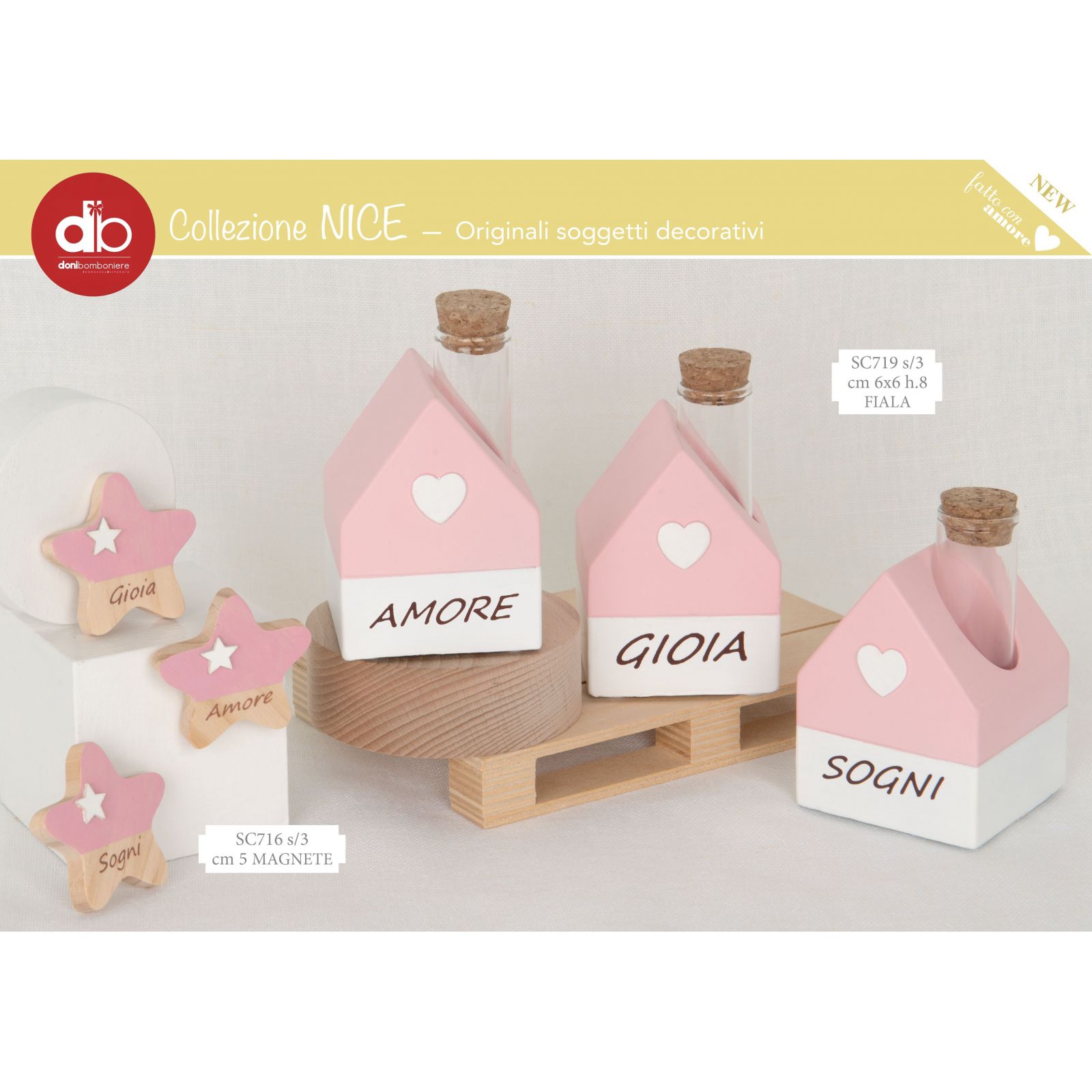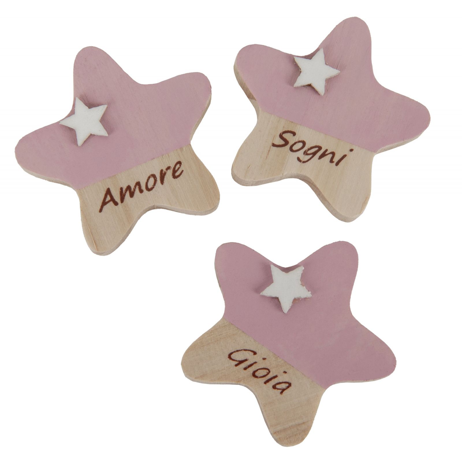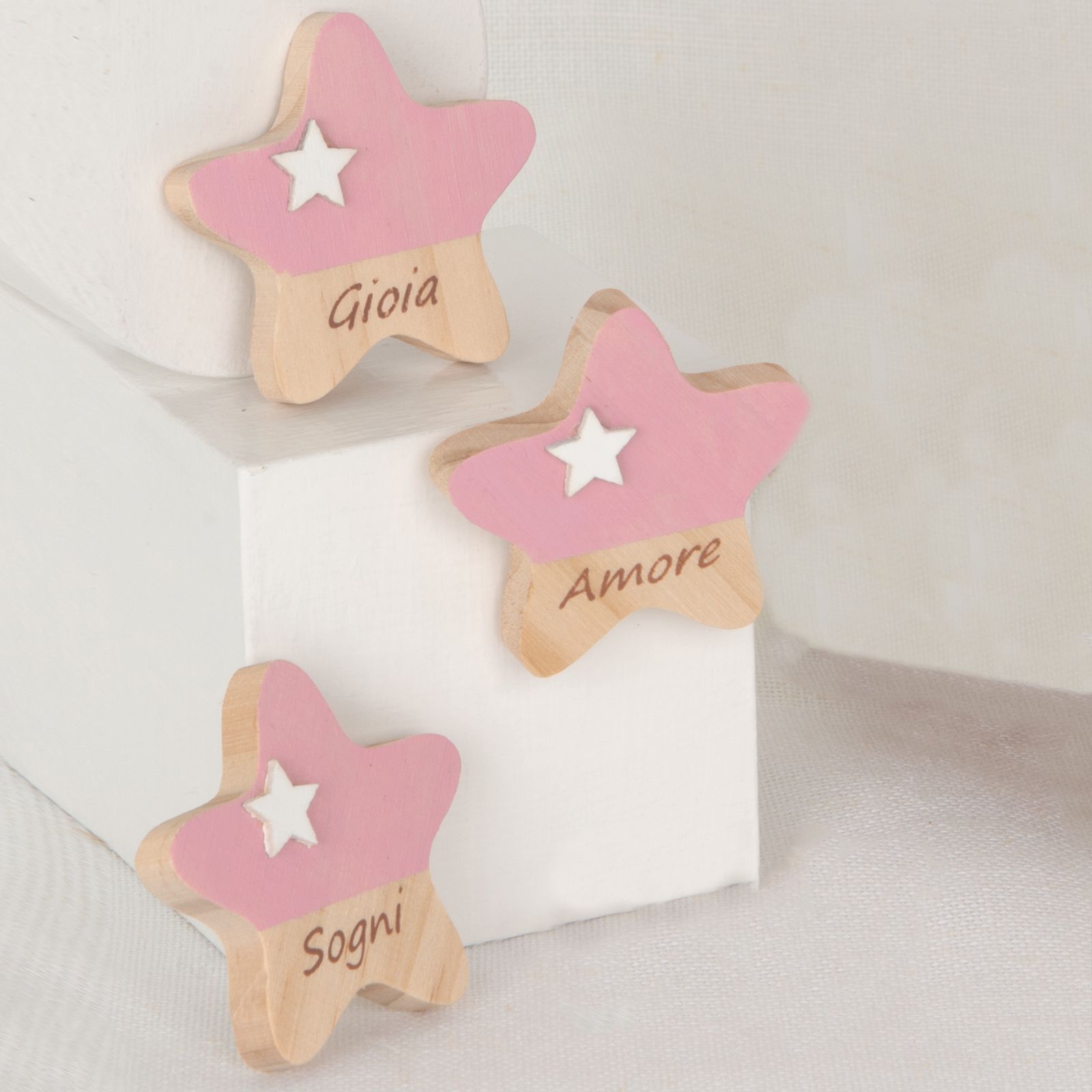 Questi magnifici magneti a forma di stelline assortiti in tre modelli con le parole "sogni", "gioia" e "amore" sono perfetti come bomboniere per eventi speciali come la nascita o il battesimo. Realizzati in legno di alta qualità, questi magneti sono disponibili nei colori rosa e legno naturale, e misurano circa 5 cm.