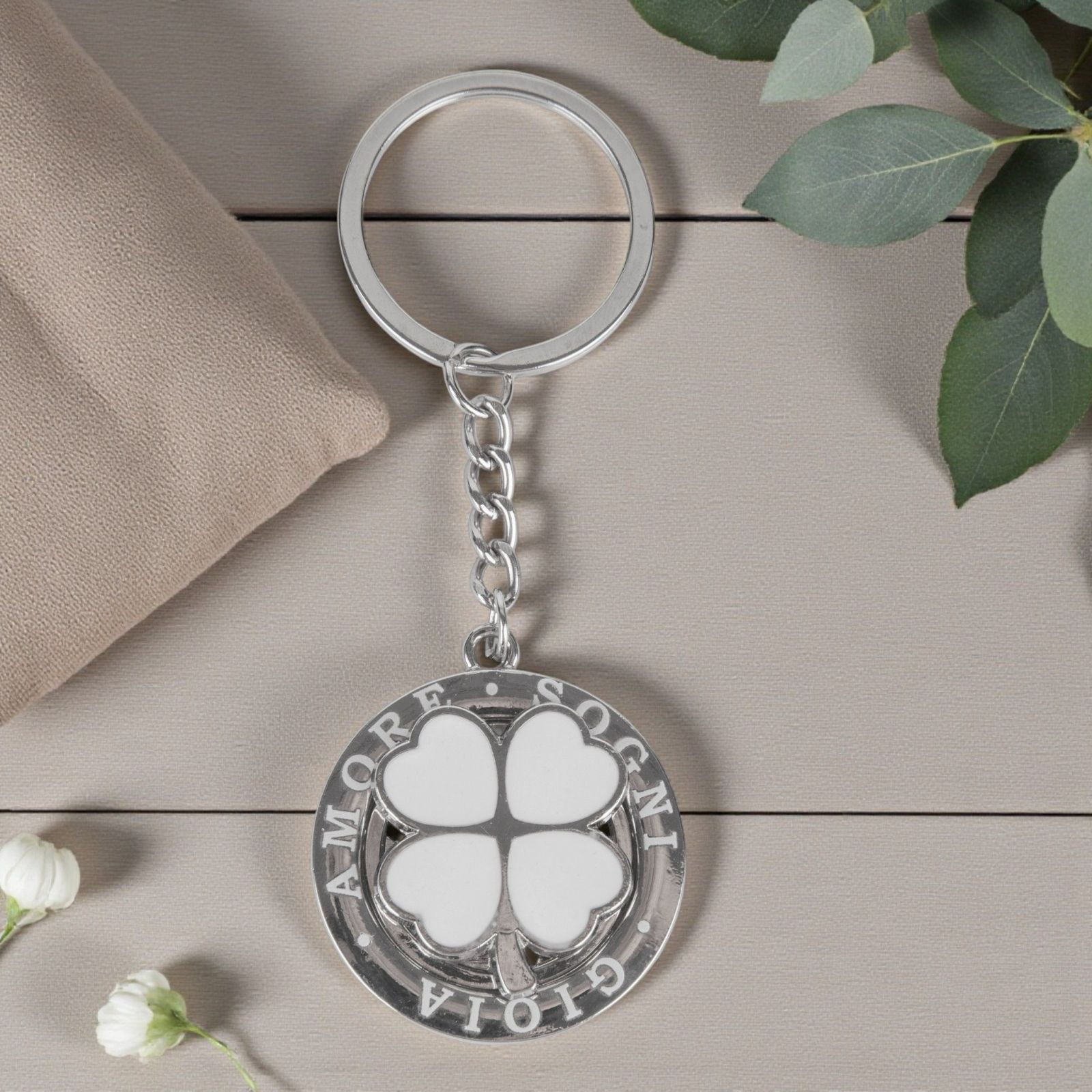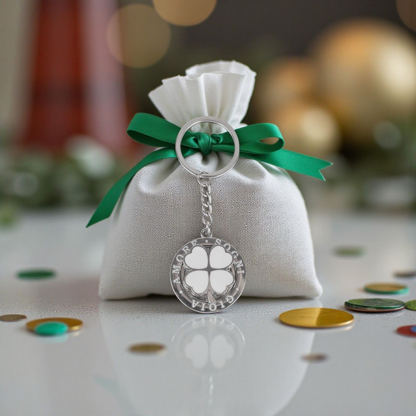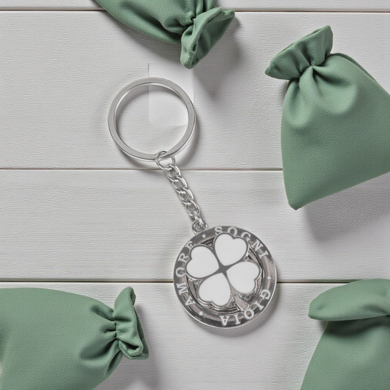 Un piccolo pensiero dal grande significato: portachiavi a forma di ruota con scritta “Amore, Gioia e Sogni” e quadrifoglio portafortuna centrale. Perfetto come bomboniera, segnaposto o regalo per gli invitati, unisce praticità ed eleganza in un oggetto originale.