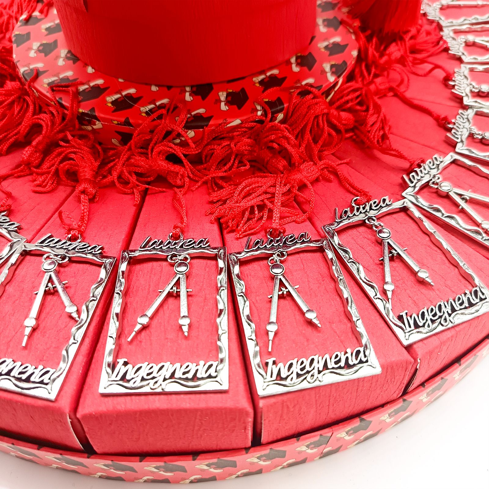 Porta un tocco di allegria e stile alla tua laurea con una coloratissima torta di bomboniere! Composta da 24 fette in brillante cartoncino rosso, ogni fetta nasconde un prezioso ciondolo in metallo a forma di compasso inciso con "laurea ingegneria". Perfetta per stupire amici e parenti con un regalo davvero originale!