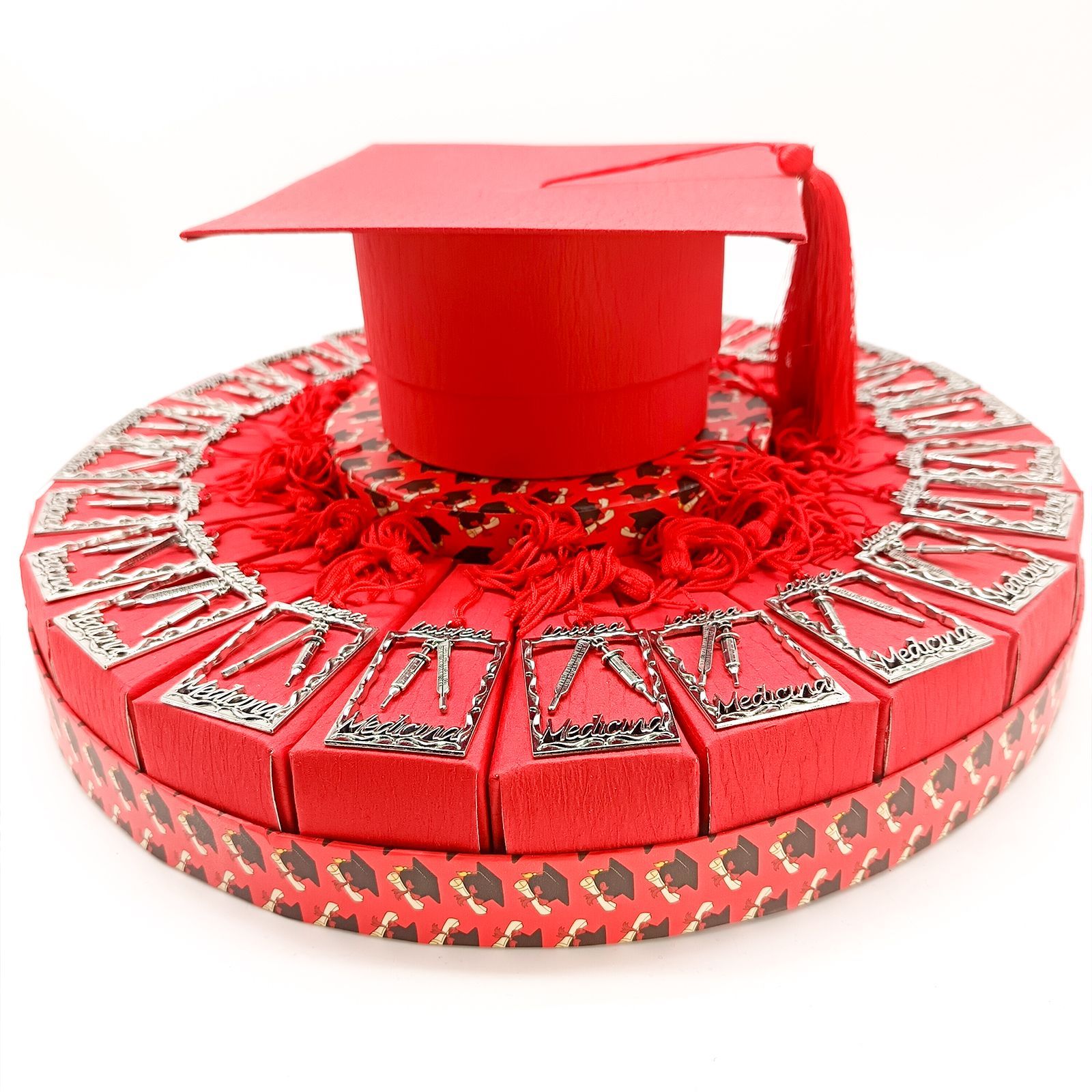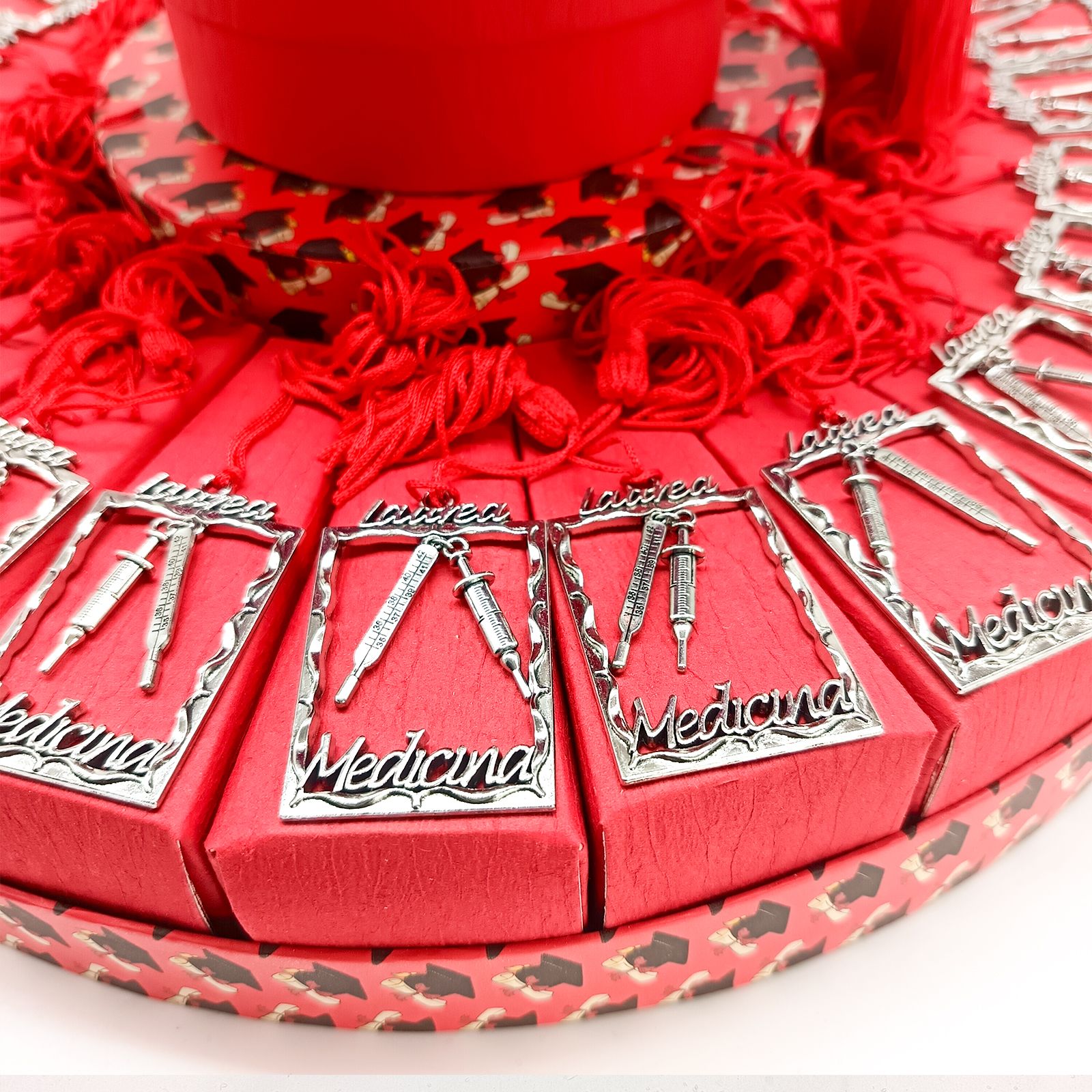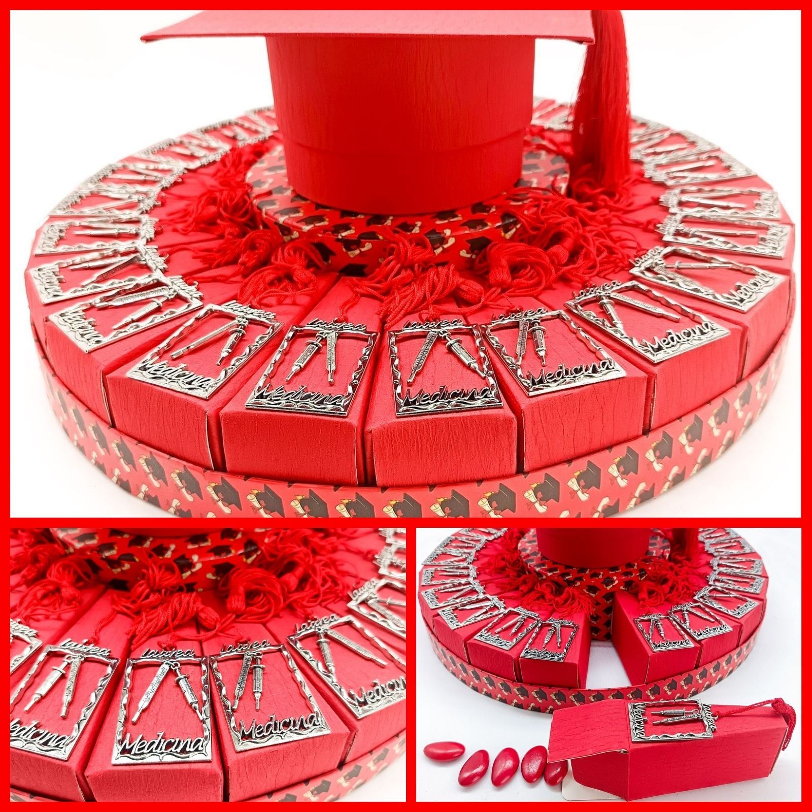 Nel giorno speciale della laurea, regala un'originale e unica bomboniera che renderà ancora più memorabile questa importante occasione. La Torta di Bomboniere con tocco centrale è composta da 24 fette, ognuna decorata con un ciondolo rappresentativo del corso di laurea in medicina: una siringa, un termometro, una nappina rossa e la scritta "laurea a medicina".