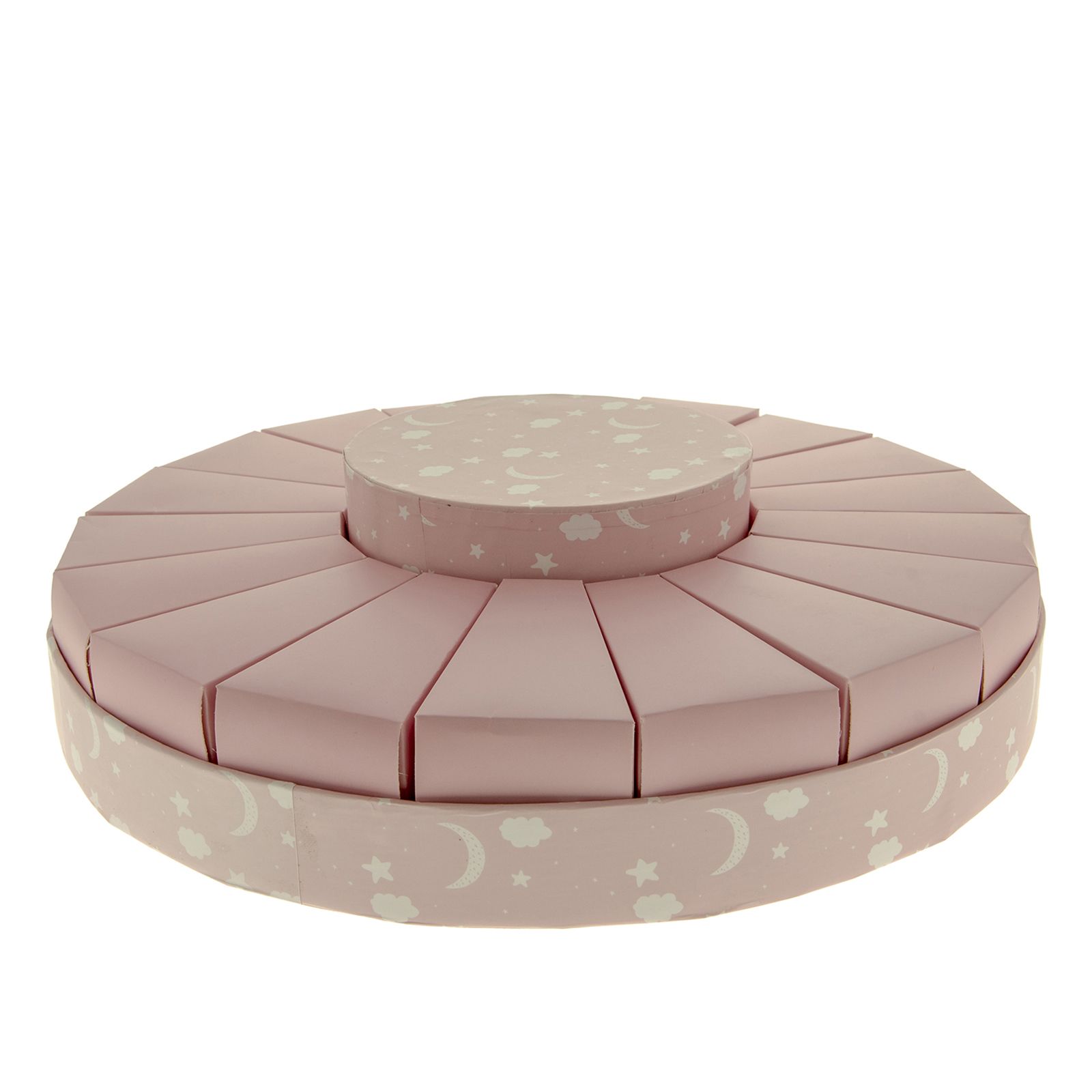 Torte bomboniere per confetti di colore rosa, con 18 o 24 scatoline a forma di fette torta composte da base e coperchio in cartoncino rosa, sul bordo della torta sono disegnate delle lune, stelle e nuvolette di colore bianco.