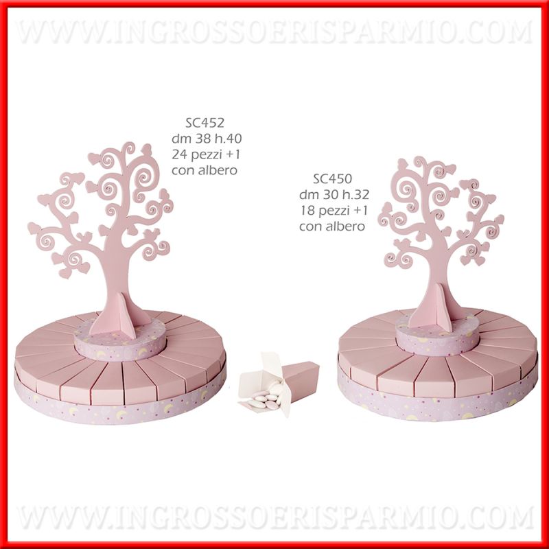 La torta battesimo è composta da fette portaconfetti rosa, disposte su un supporto decorato con stelline, nuvolette e luna. La parte centrale della torta portaconfetti presenta un intaglio a forma di croce, in cui dover inserire la bellissima struttura a forma di albero della vita realizzata in legno rosa (N.B. l'albero della vita arriverà a parte, per evitare rotture durante il trasporto).