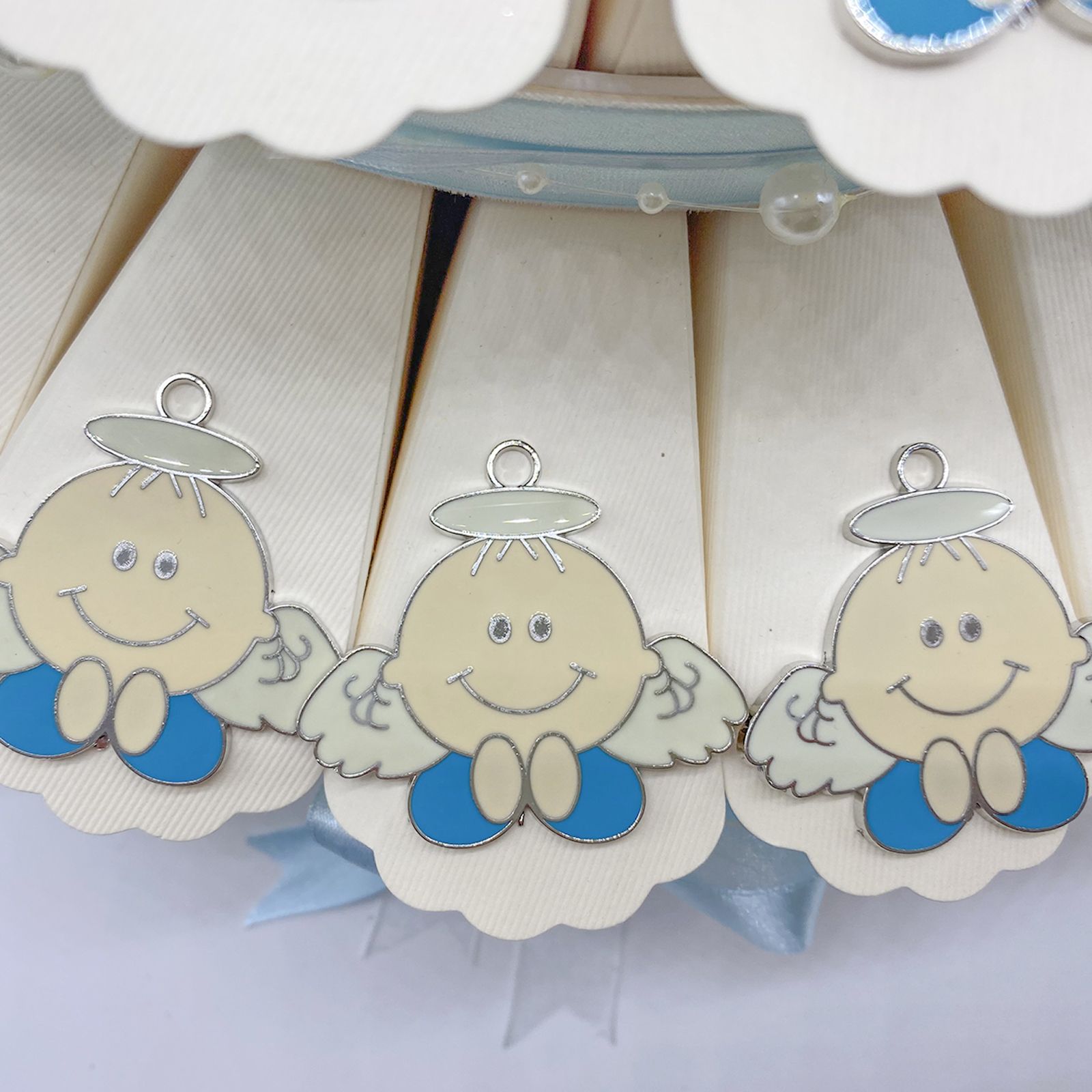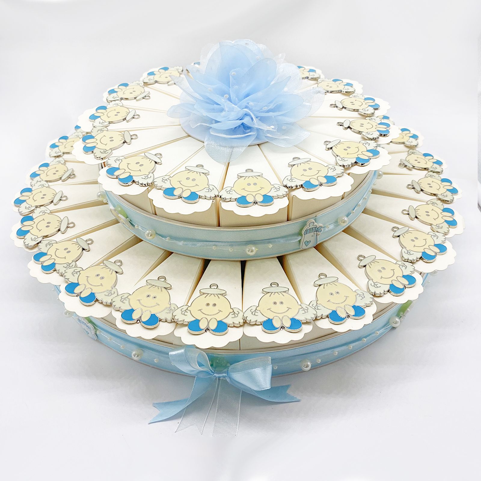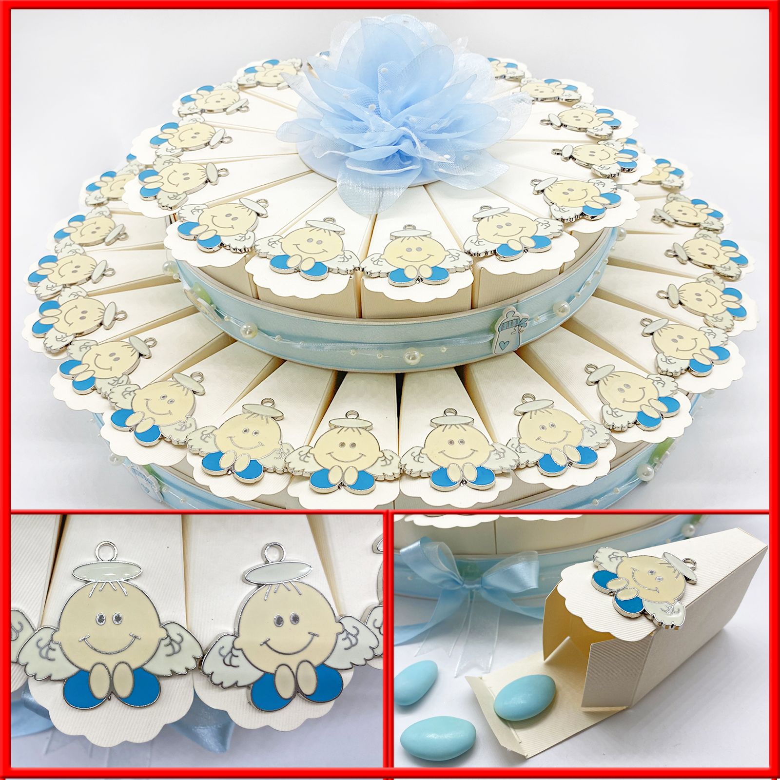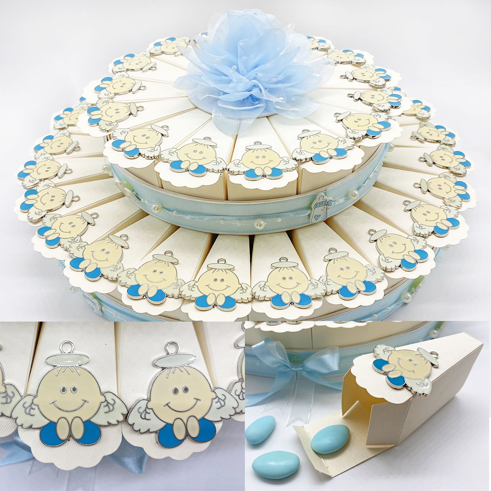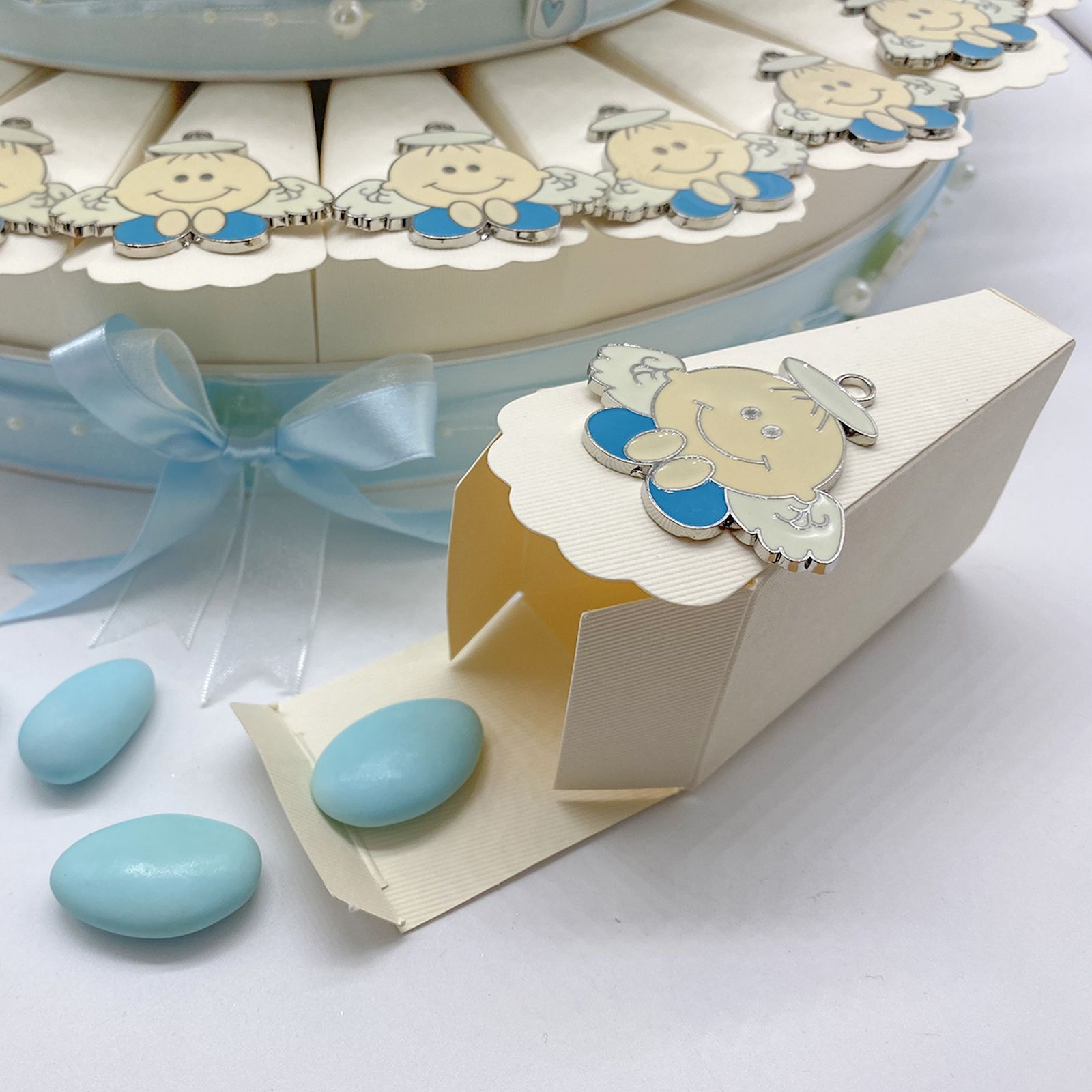Struttura torta a base circolare in cartoncino rigido con fette/scatole color avorio, decorata con nastrini, fiocchetti e perline con al centro un fiore stilizzato in raso celeste. Per ogni fetta, troverai un ciondolo in zama con occhiello a forma di angioletto nei toni del celeste.