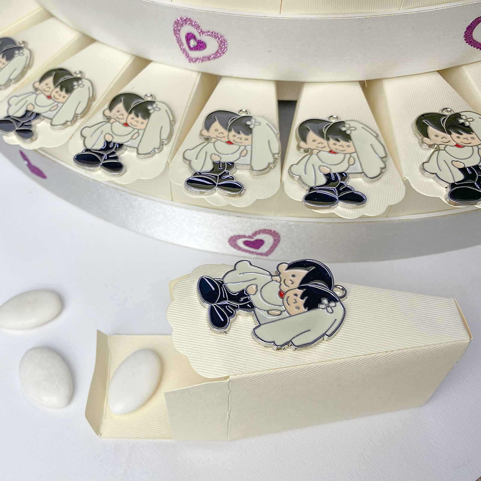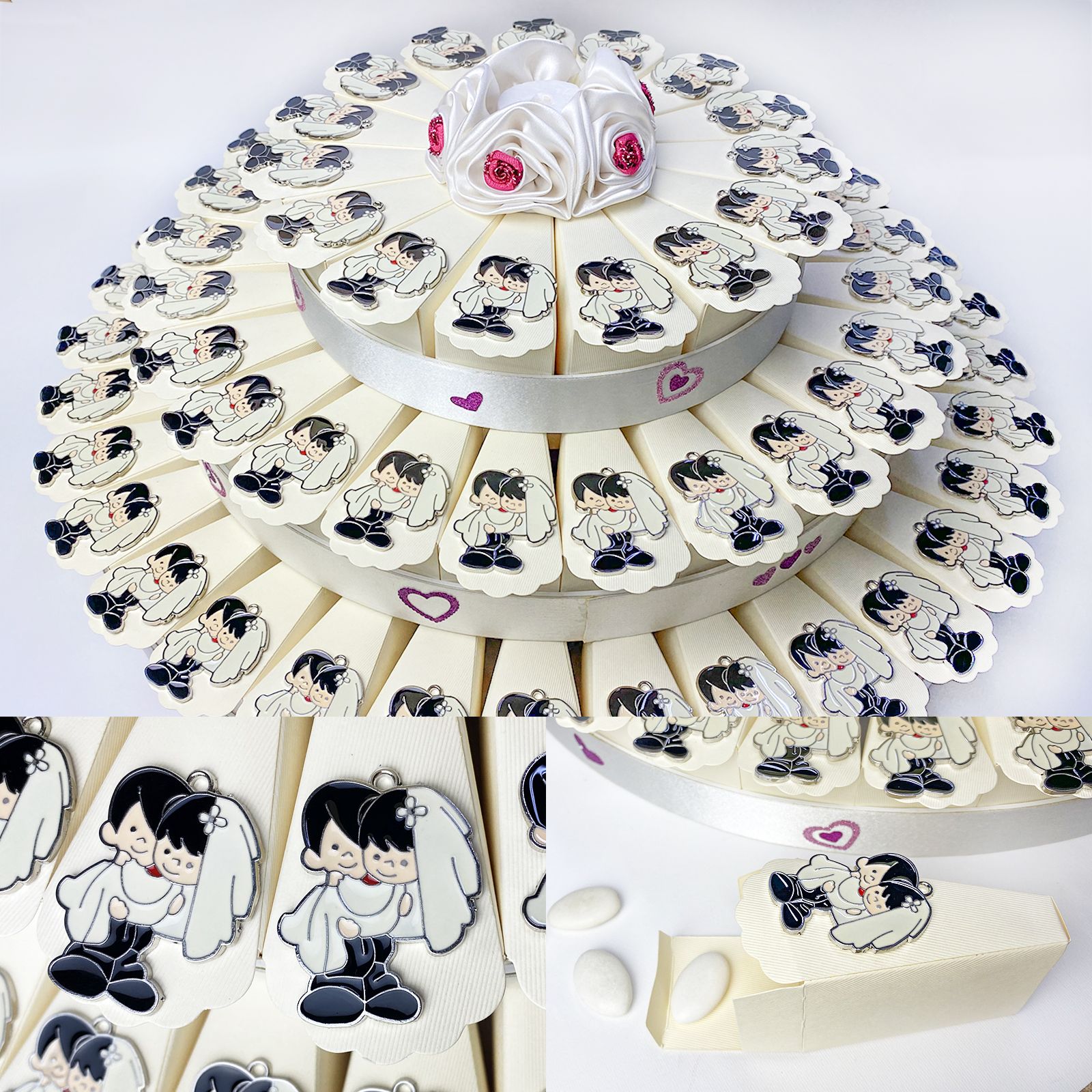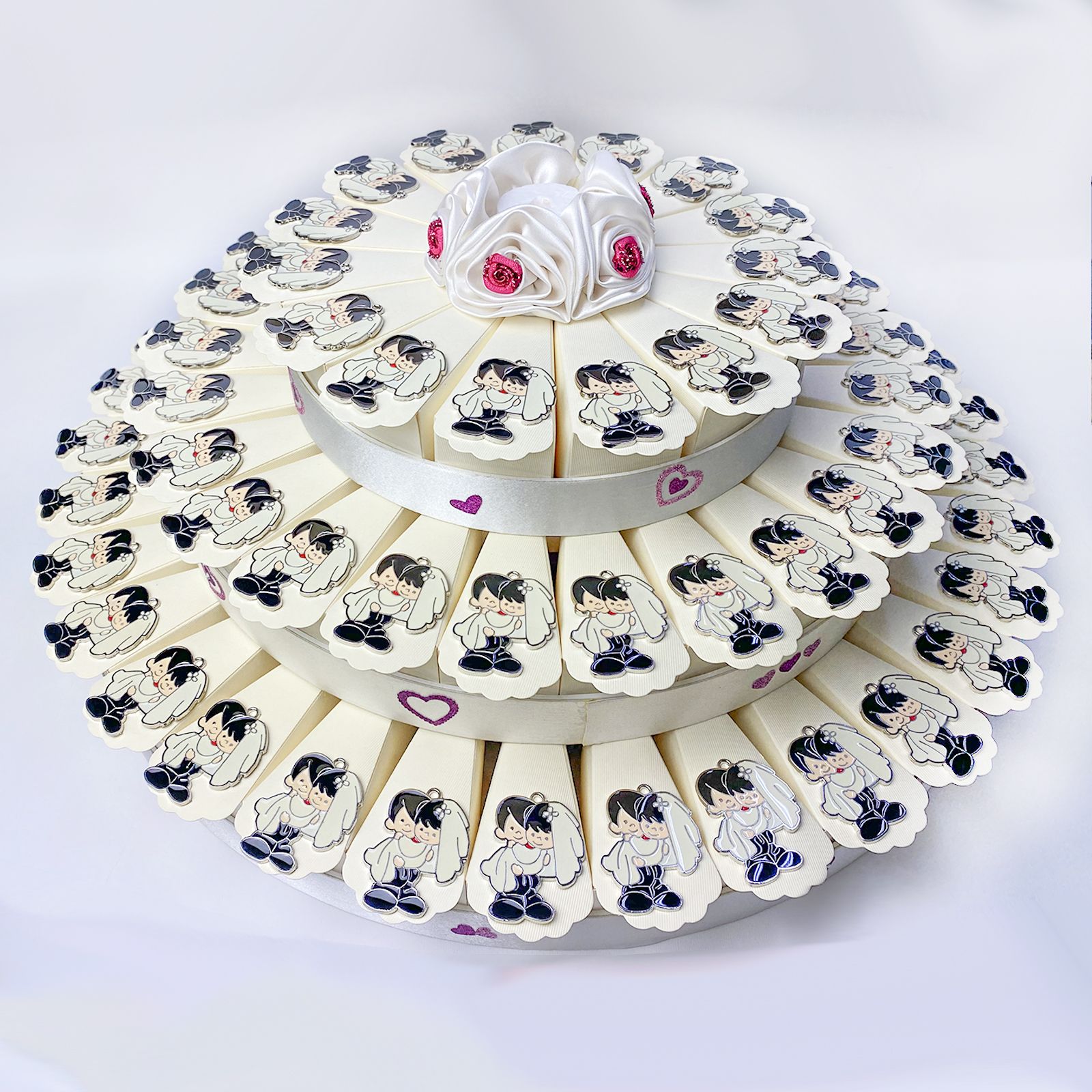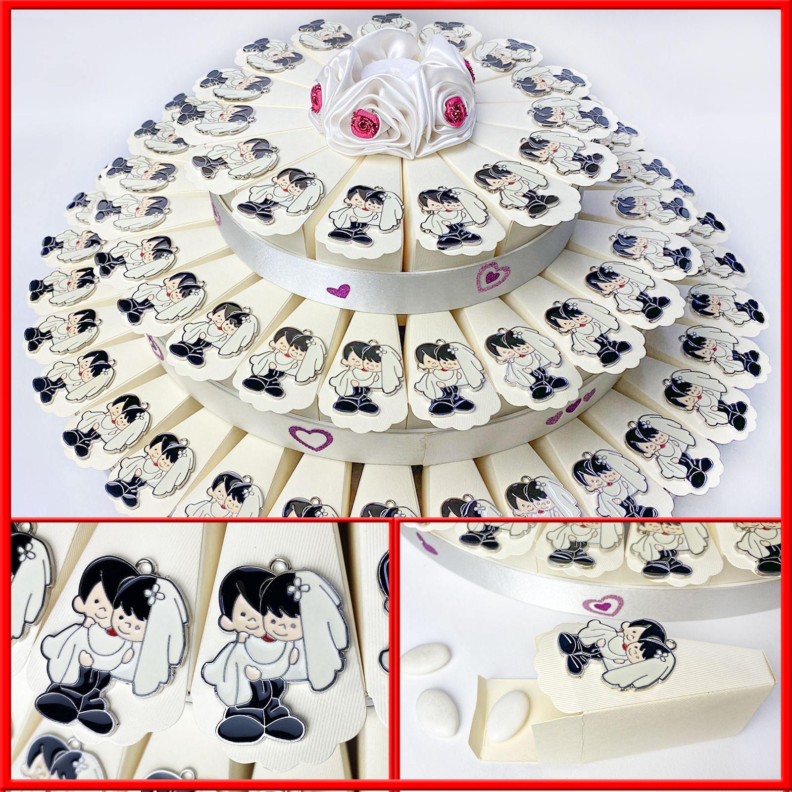 Disponibile per te struttura torta in cartoncino rigido, con 73 fette color panna distribuite su 3 piani. Per ogni fetta troverai un simpatico ciondolo in zama di una coppia, dove lo sposo tiene tra le braccia la sposa completa di velo. Sul bordo esterno di ogni piano, troverai decorazioni a forma di cuori rossi e al centro della torta un romantico e delicato fiore in raso bianco con dettagli rossi.