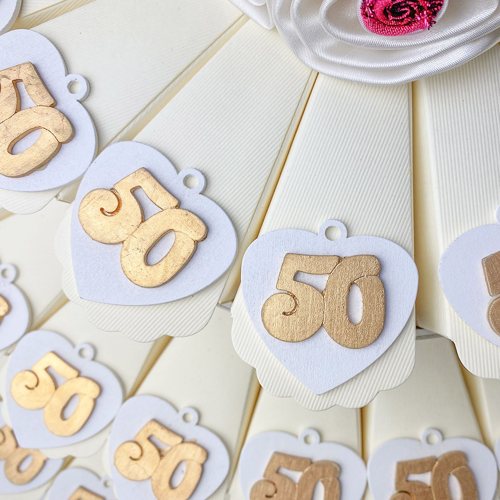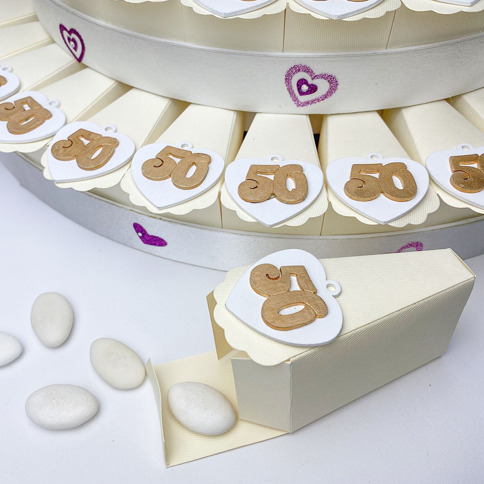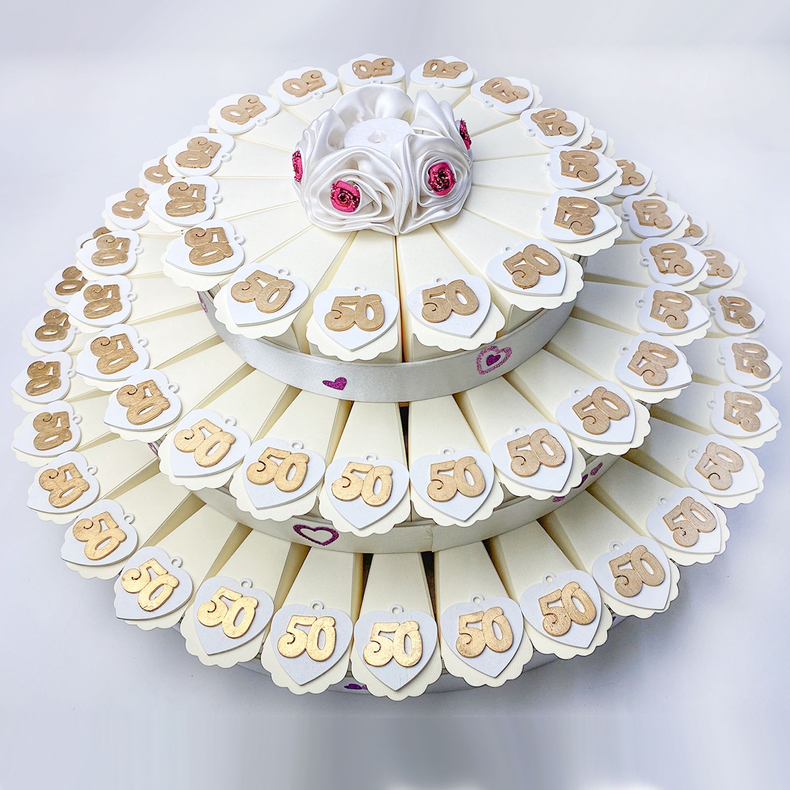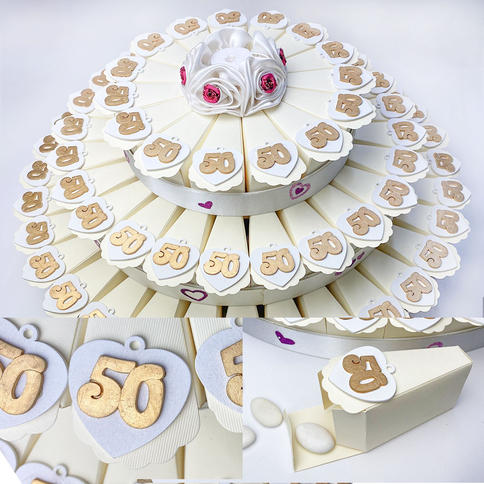 Torta con struttura e fette in cartoncino rigido color panna, di tre piani, con decorazioni a forma di cuoricini su ogni bordo e fiore in raso bianco con dettagli rossi. Per ogni fetta troverai un applicazione/decorazione in legno a forma di cuore con occhiello e numero 50 in color oro .