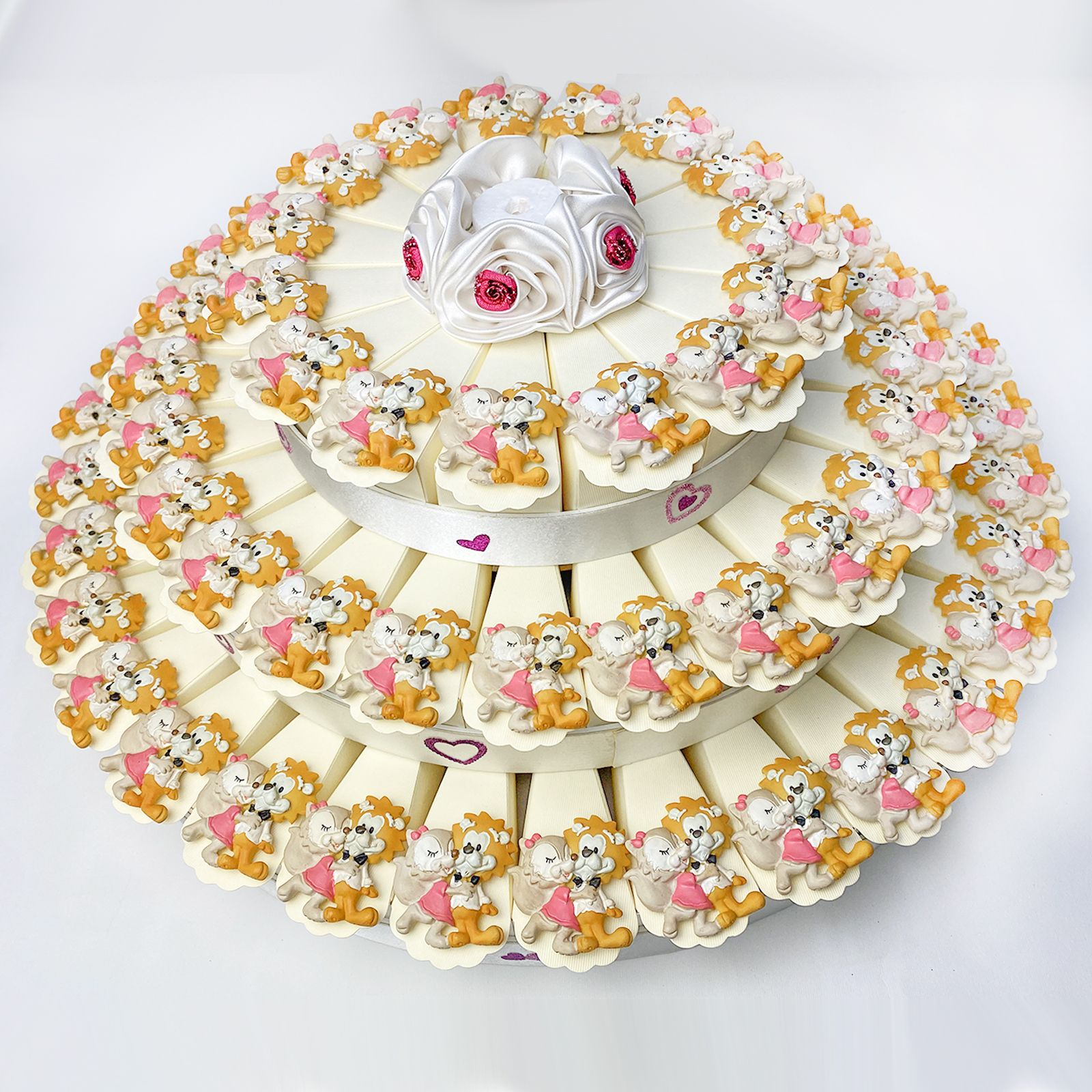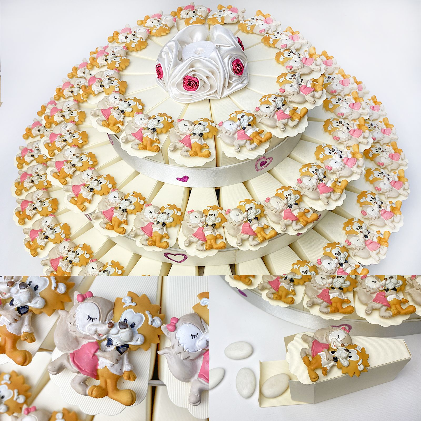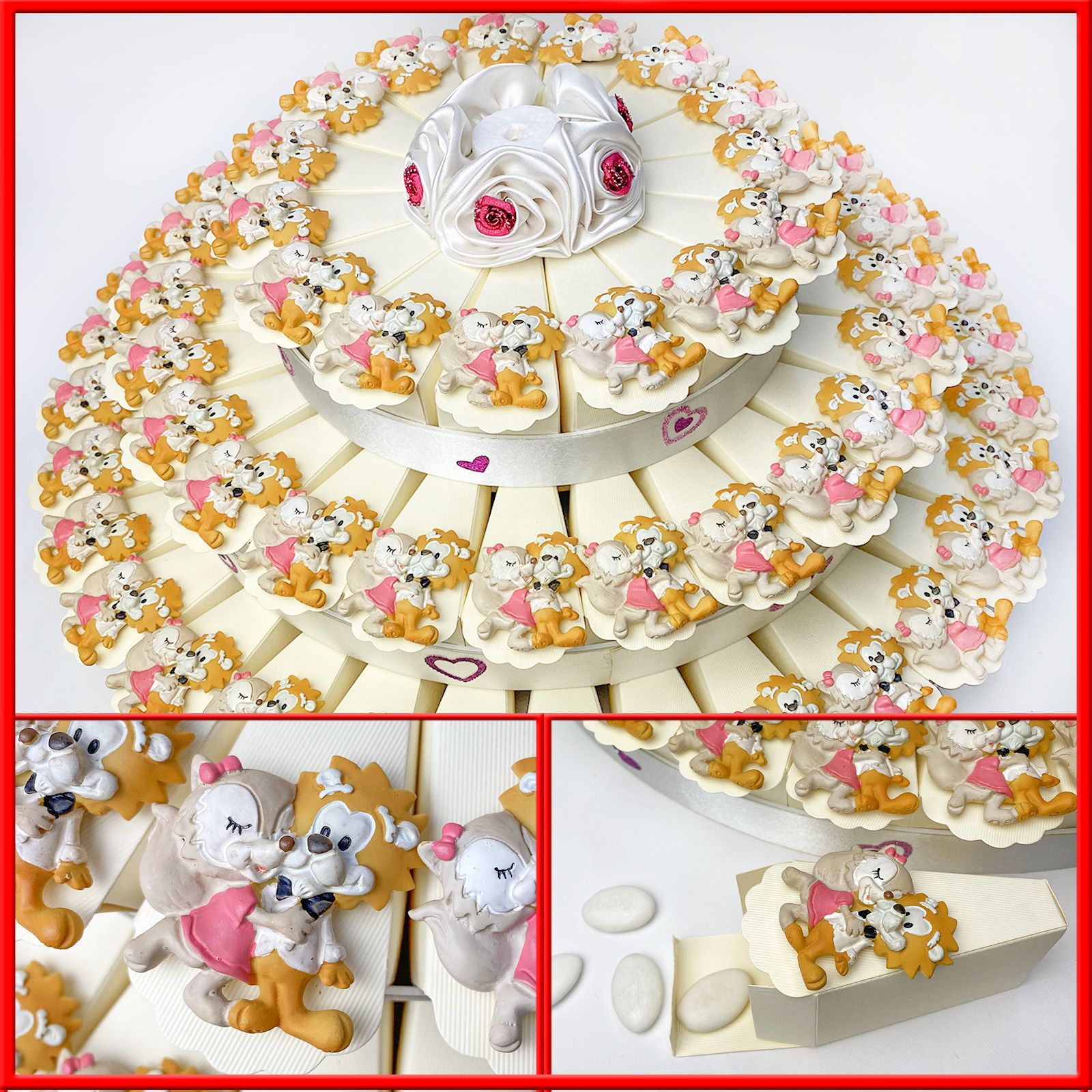 Per ogni fetta troverai una calamita raffigurante un leone in smoking bianco e una volpe con fiocchetto rosa che si abbracciano.