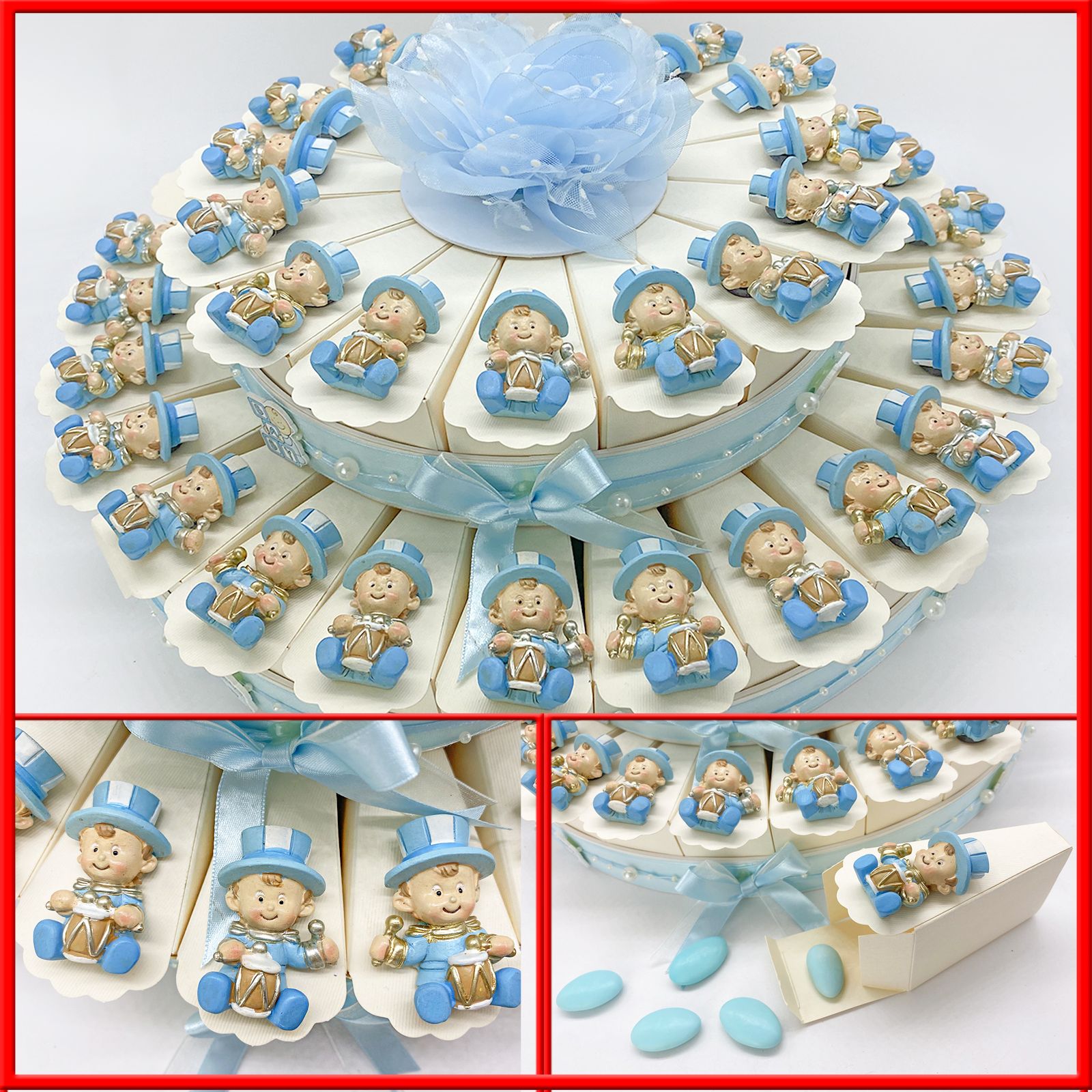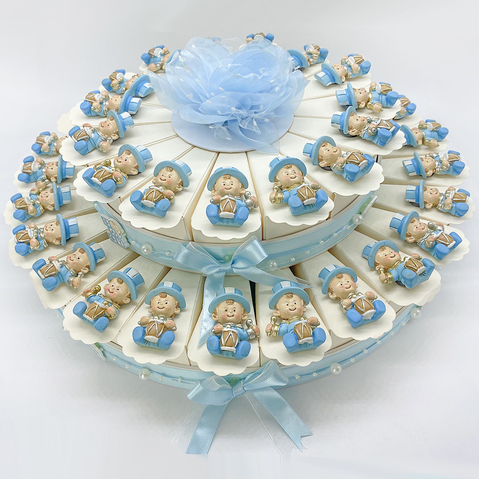 Immagina di rendere i tuoi eventi speciali ancora più dolci e memorabili con la nostra Torta Celeste 15/25/40 fette con magnete bimbo Jolly. Realizzata con cura e amore, questa torta di bomboniere è perfetta per celebrare nascite, compleanni, battesimi e altri momenti importanti. Ogni fetta avorio in cartoncino è splendidamente decorata con fiocchetti, perline e nastrini, mentre al centro troverai un grazioso fiore in raso celeste.