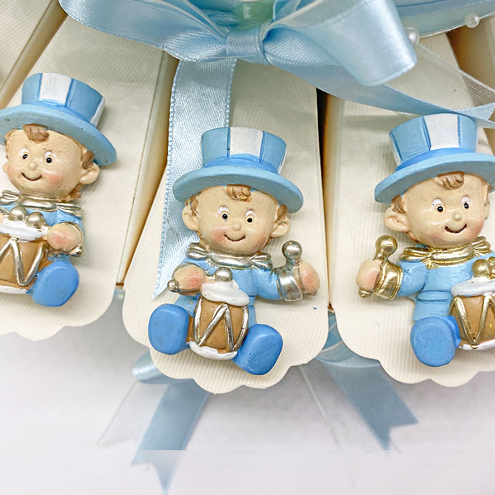 Ma ciò che rende questa torta davvero speciale sono i magneti bimbo jolly con tamburello che adornano ogni fetta. Ogni magnete rappresenta un simpatico bimbo jolly seduto con il suo tamburello, indossando una tuta celeste con dettagli oro e un cappello a cilindro. Le calamite sono assortite in varie posizioni, donando un tocco di allegria e originalità a ogni fetta.