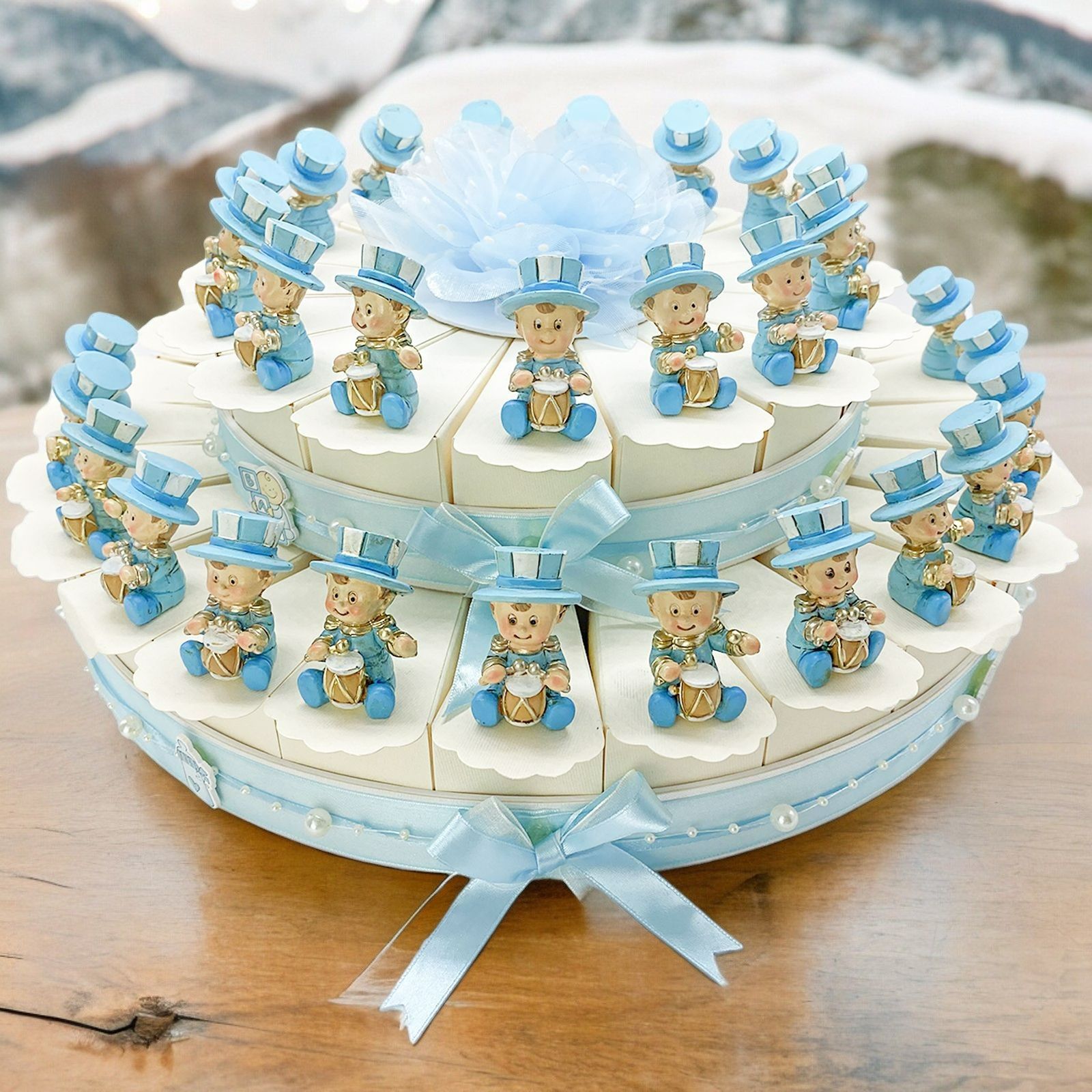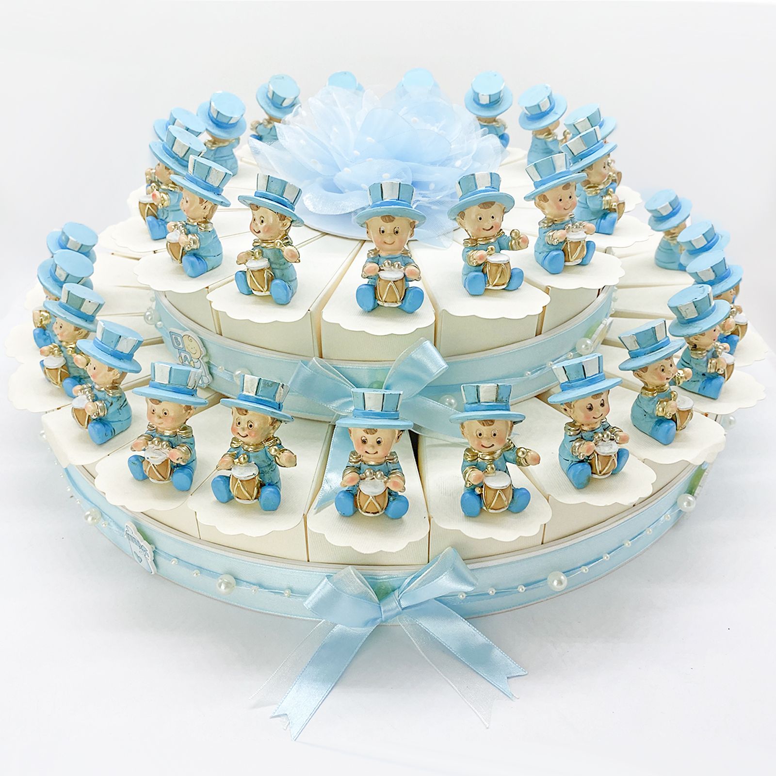 Sorprendi i tuoi ospiti con la nostra torta celeste di bomboniere con statuetta bimbo Jolly, un'opzione economica e deliziosa per celebrare eventi speciali. Questa torta è composta da fette avorio in cartoncino, decorate con fiocchetti, perline, nastrini e un meraviglioso fiore in raso celeste al centro. Ogni fetta della torta è accompagnata da una Statuetta Bimbo Jolly con Cappello e Tamburello, realizzata in resina e disponibile in tre varianti diverse (non selezionabili singolarmente). La torta celeste con statuette Bimbo Jolly è perfetta per eventi come la nascita, il battesimo e il compleanno. È adatta a genitori e bambini di sesso maschile, portando un tocco di allegria e divertimento alla celebrazione.