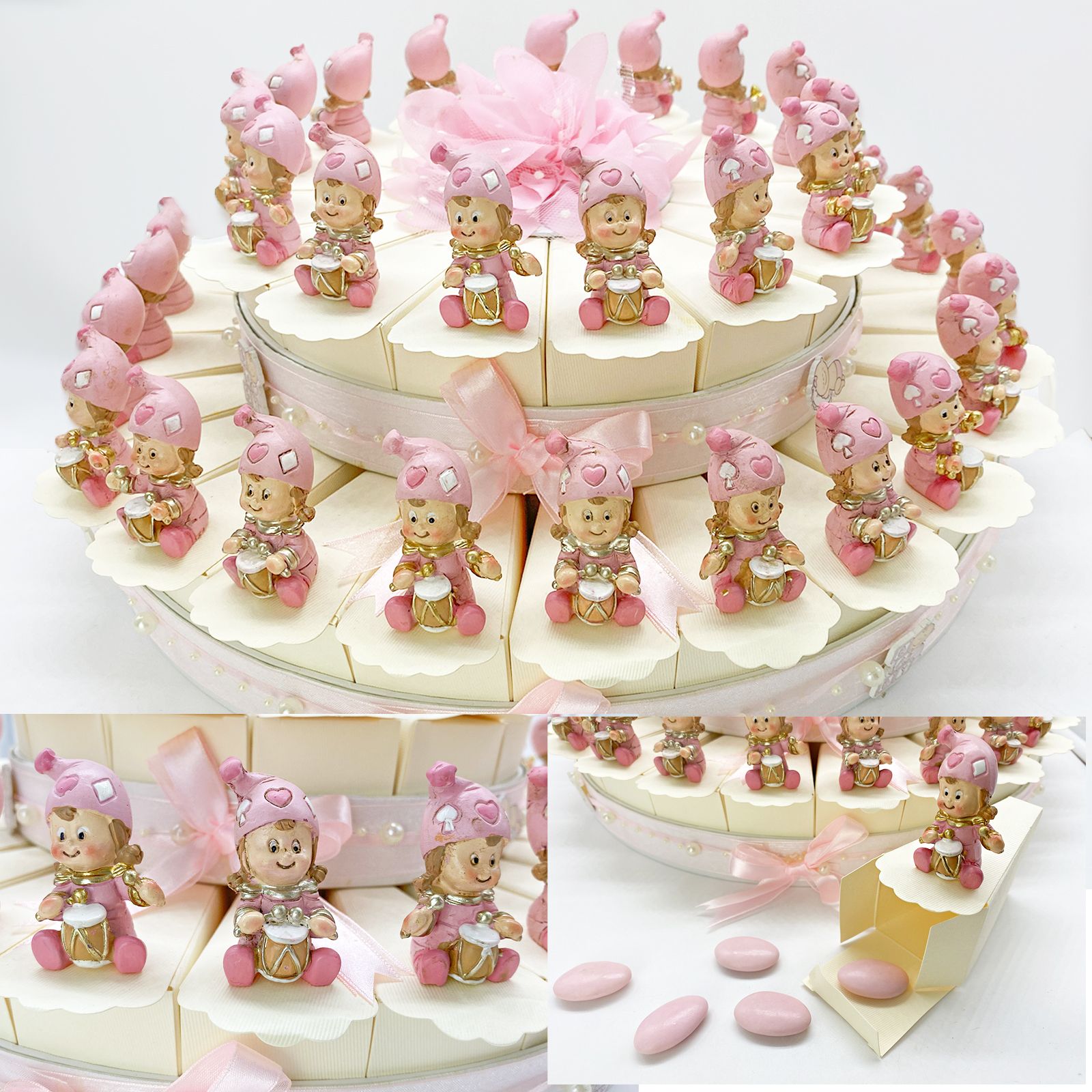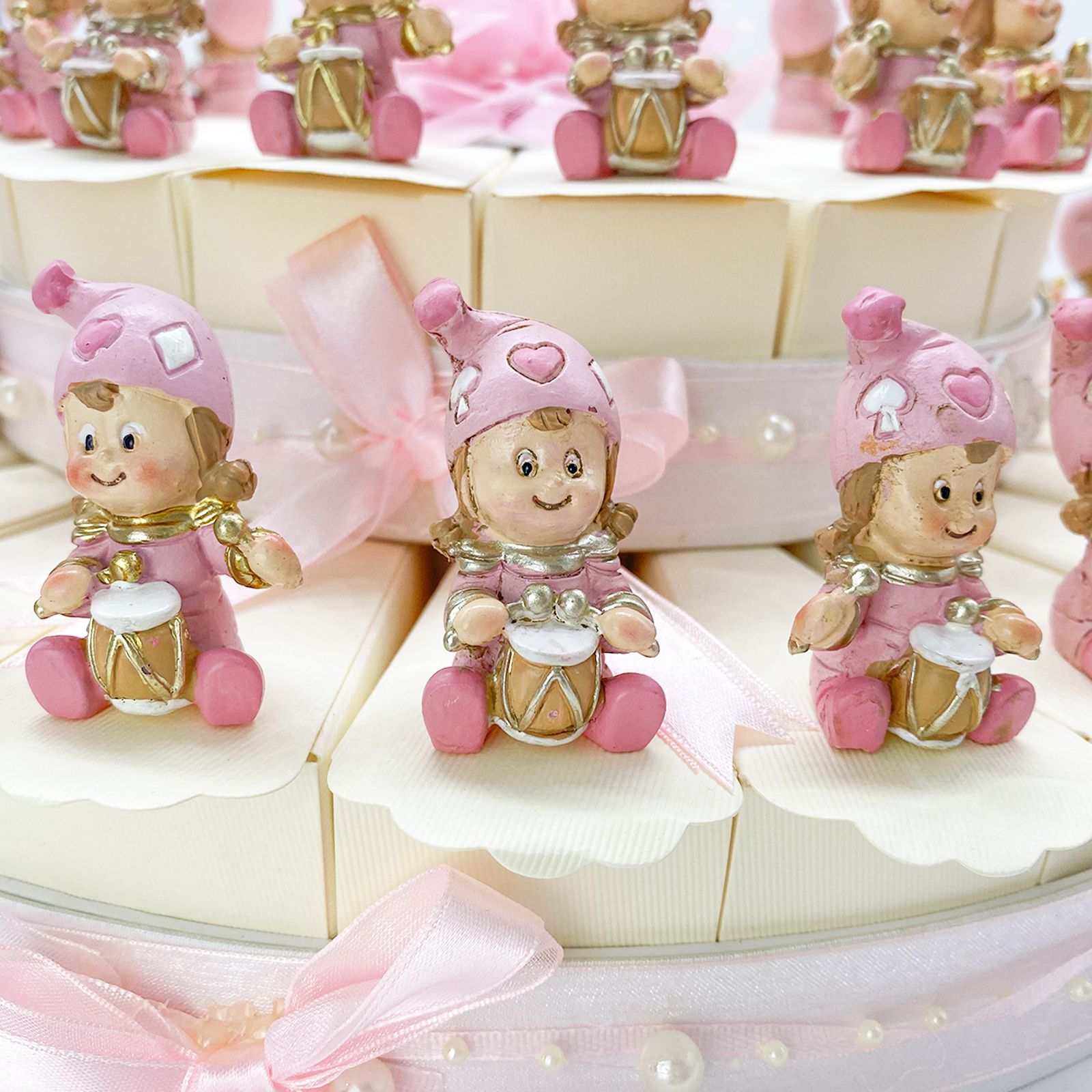 Ma la vera attrazione di questa torta sono le adorabili statuine Jolly Bambina con tamburello. Queste statuine, realizzate in resina e impreziosite con dettagli in oro e rosa, raffigurano delle dolcissime bambine sedute con il loro tamburello. Ogni fetta di torta è accompagnata da una statuina assortita, che aggiunge un tocco di allegria e gioia. Le diverse pose delle statuine rendono ogni fetta unica e divertente. Il retro di ogni statuina è dotato di un magnete che ti permette di utilizzarle anche come simpatici segnaposto o decorazioni magnetiche.