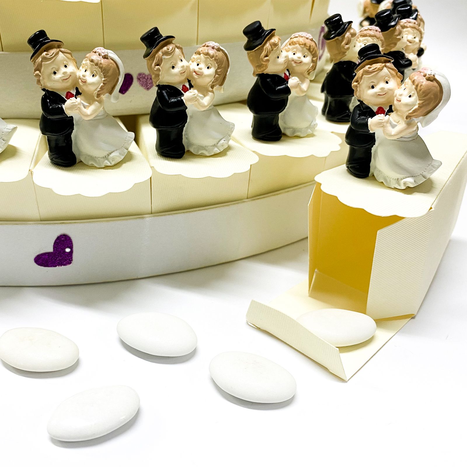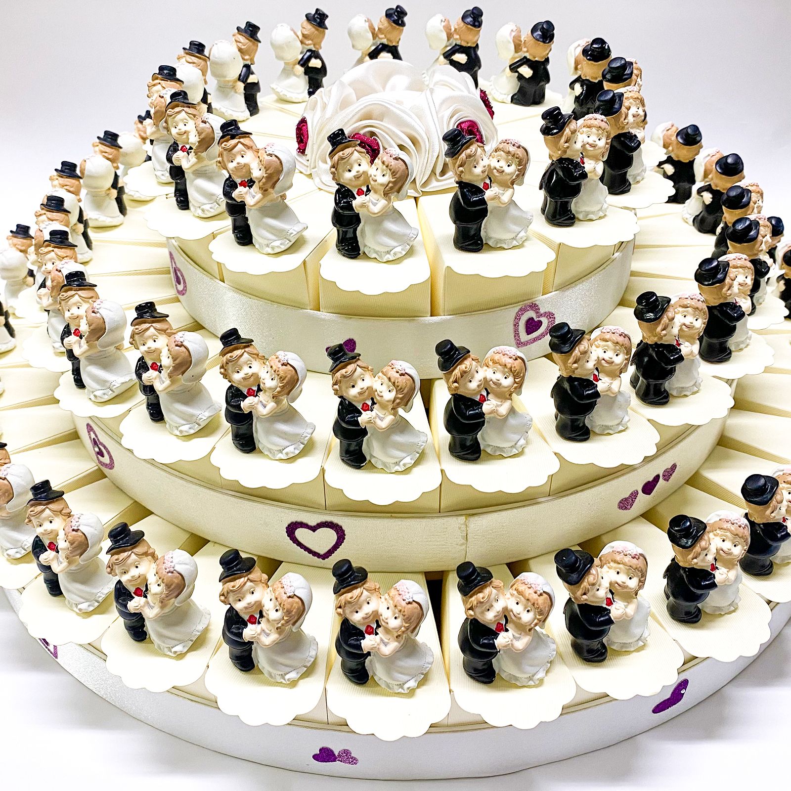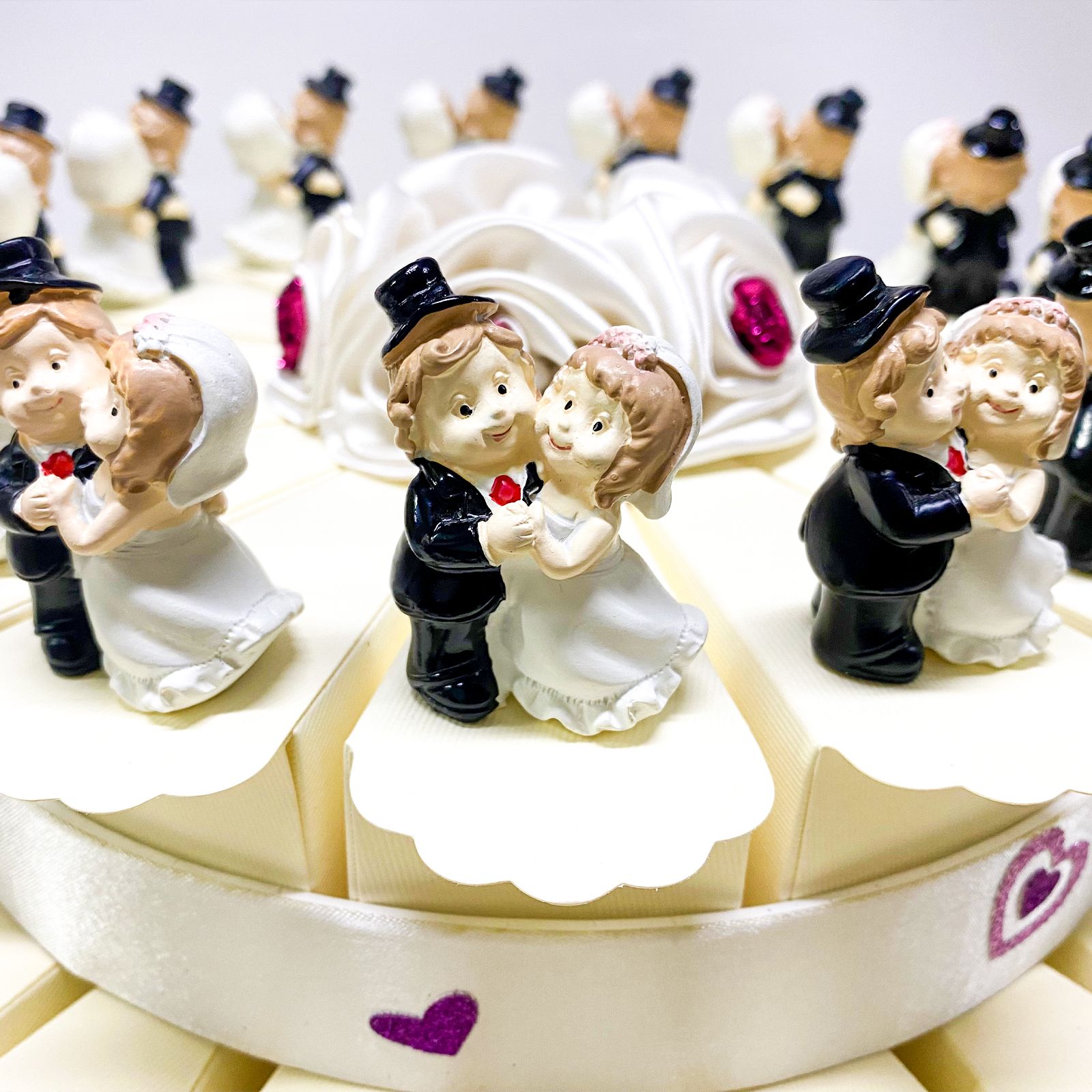 La nostra torta di confetti con 73 fette è l'opzione perfetta per festeggiare matrimoni e anniversari in modo originale ed economico. La struttura della torta è realizzata in cartoncino rigido e le 73 fette sono di un elegante colore panna. Ogni fetta è accompagnata da statuine degli sposi in resina, raffiguranti la coppia abbracciata. La sposa indossa un abito bianco e un velo, mentre lo sposo indossa uno smoking con cappello a cilindro.