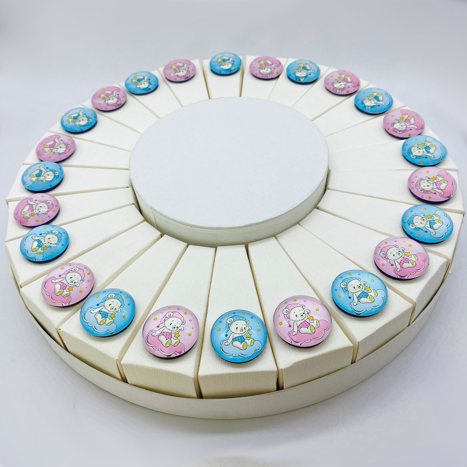 Scegli la nostra Torta di Fette Scatoline Neutra Bianca per rendere ogni evento legato alla nascita dei tuoi gemelli indimenticabile.Questa bomboniera presenta una struttura di fette/scatole bianche in cartoncino, che emana eleganza e raffinatezza. Il vassoio bianco completa il suo aspetto, adattandosi a qualsiasi tema o stile dell'evento. Ogni fetta è impreziosita da graziose applicazioni in vetro tagliate in forma semi-sferica. Le applicazioni nascita raffigurano un tenero orsetto seduto su una nuvola, con il suo cappello da notte, circondato da stelline.