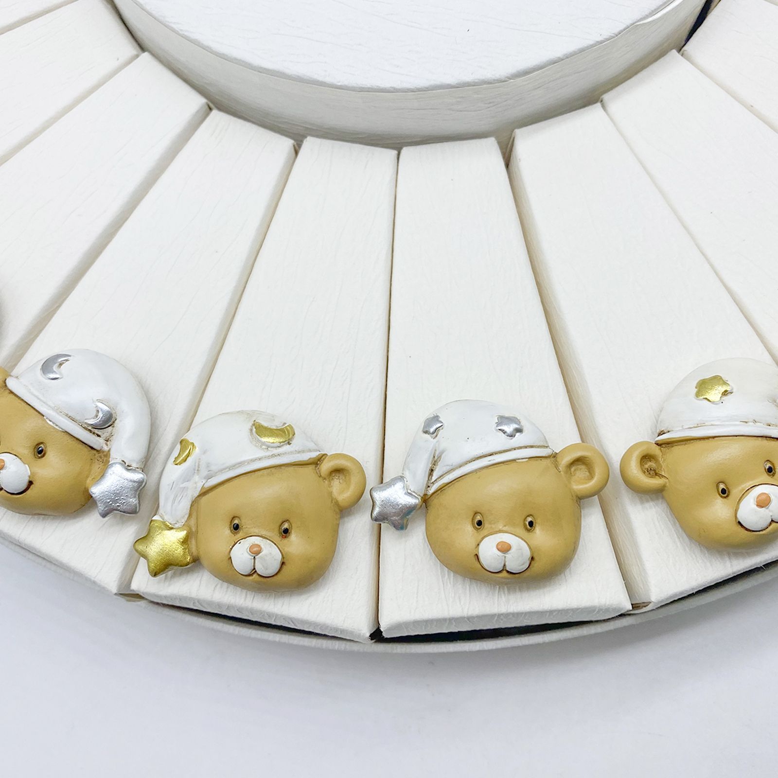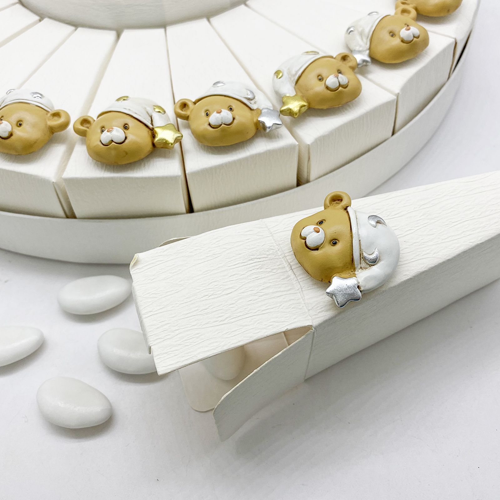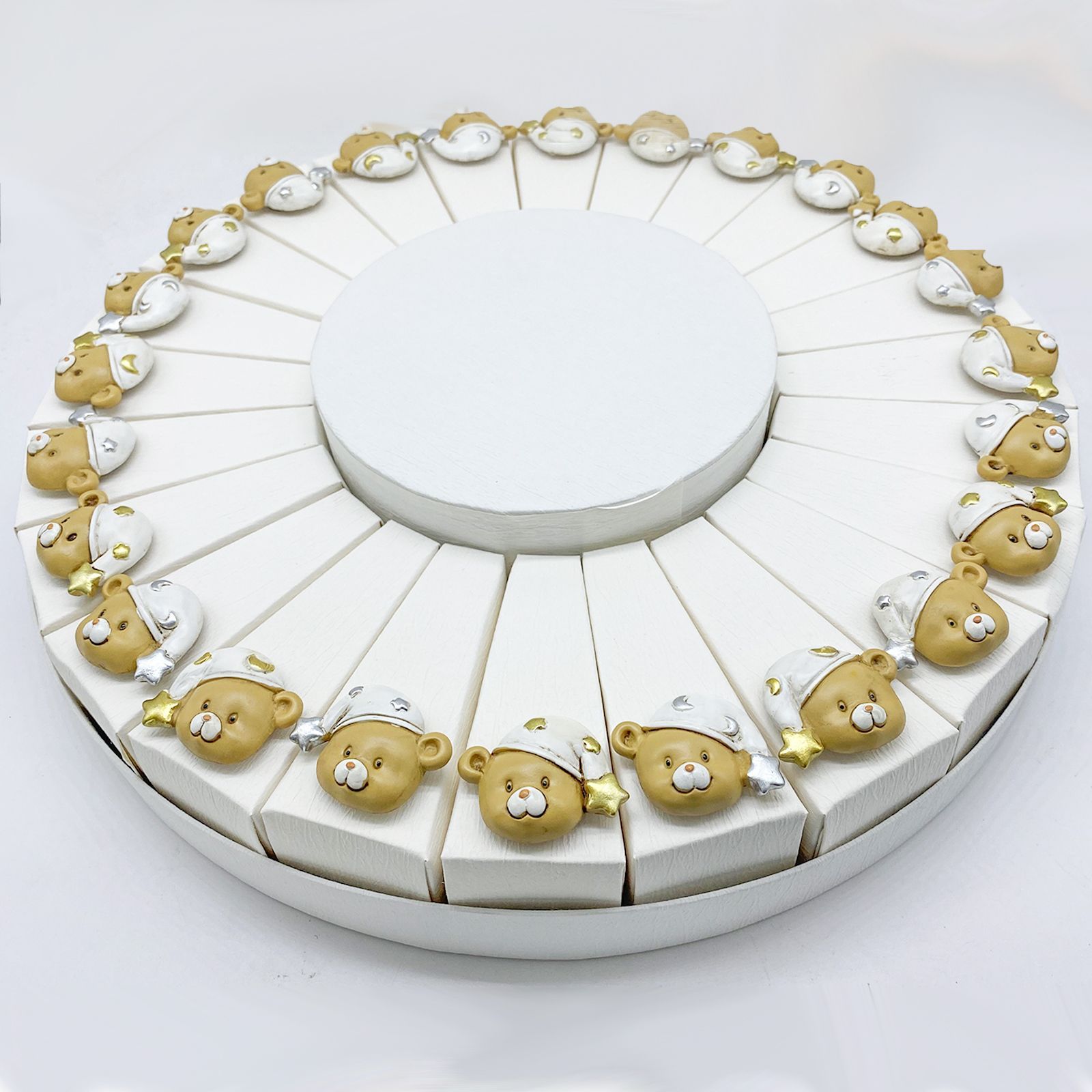 Festeggiate l'arrivo di un nuovo membro nella vostra famiglia con la nostra incantevole Torta di Bomboniere. Ogni fetta di questa torta contiene una sorpresa unica: una calamita a forma di testa di orsetto con un cappellino da notte. Le stelle d'oro o d'argento sul cappello aggiungono un tocco di eleganza e brillantezza.