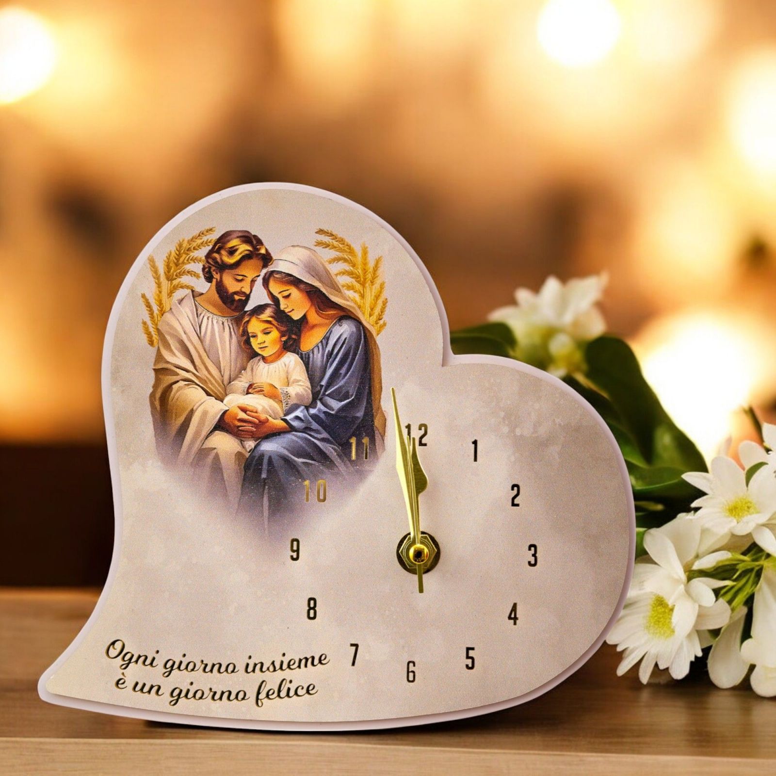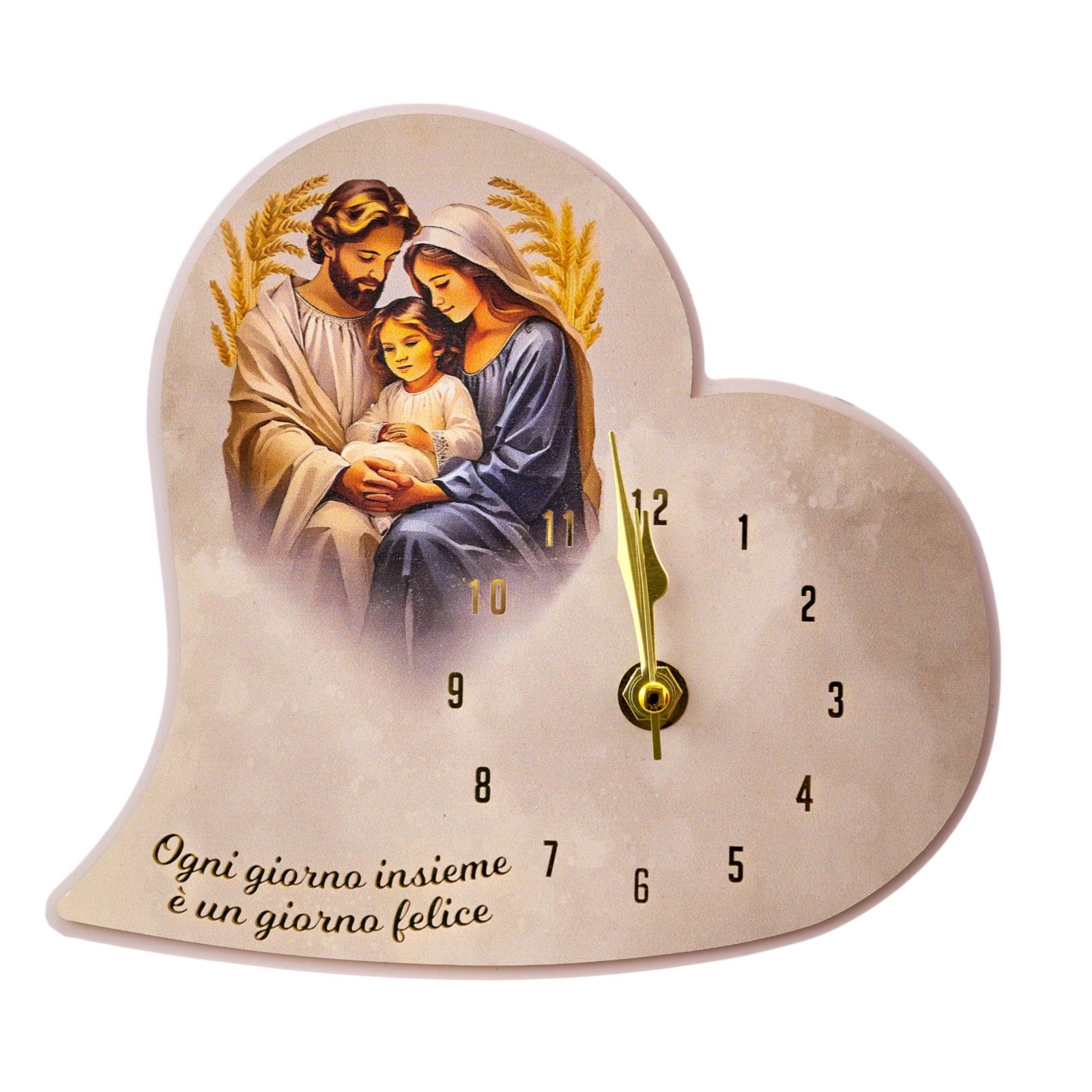Questo splendido orologio a forma di cuore con raffigurazione Sacra Famiglia e la frase "Ogni giorno insieme è un giorno felice" è il regalo perfetto per eventi speciali come battesimo, comunione e cresima. Le dimensioni di questa bomboniera sono 19x17x2 cm circa, e il colore pastello lo rende ancora più delicato e raffinato.