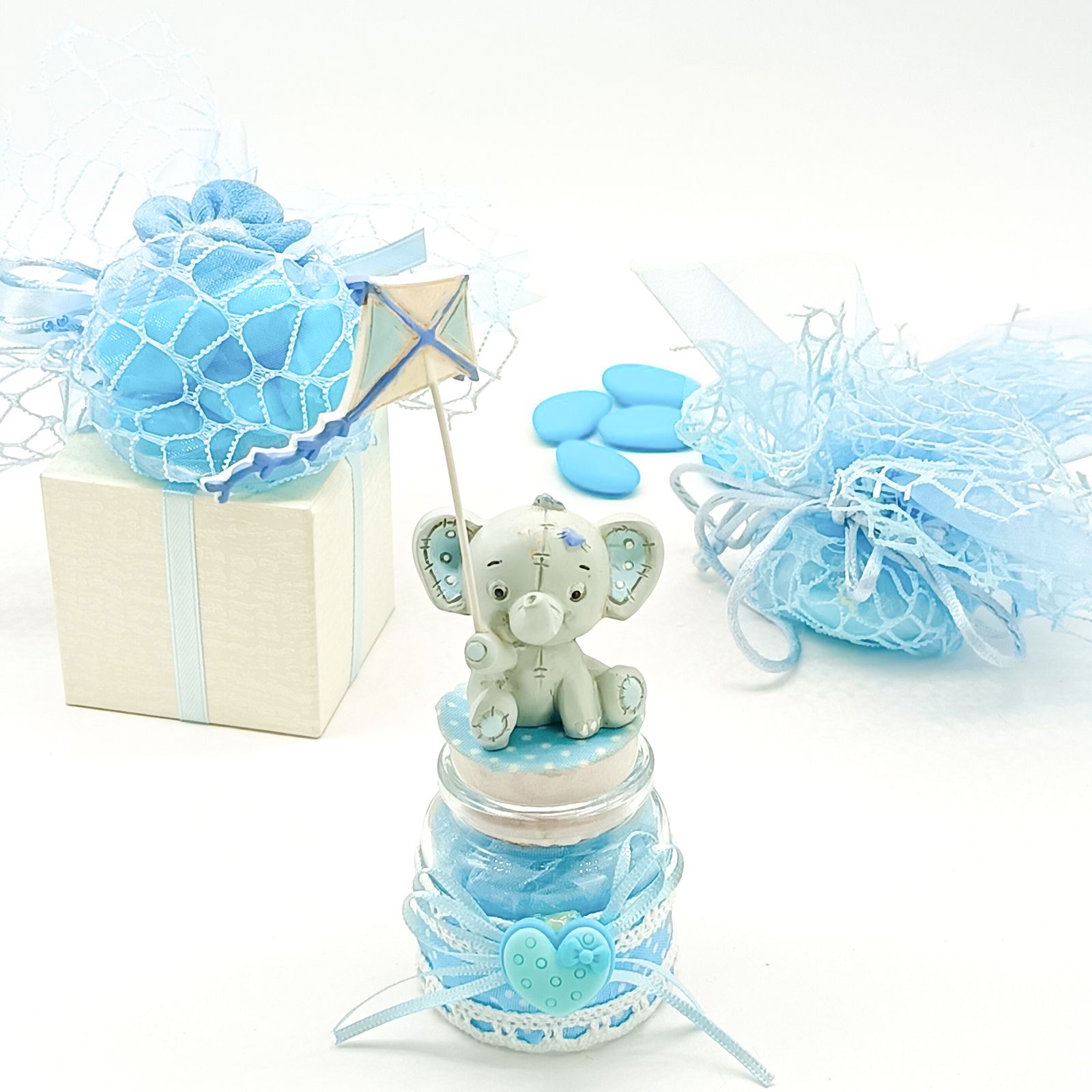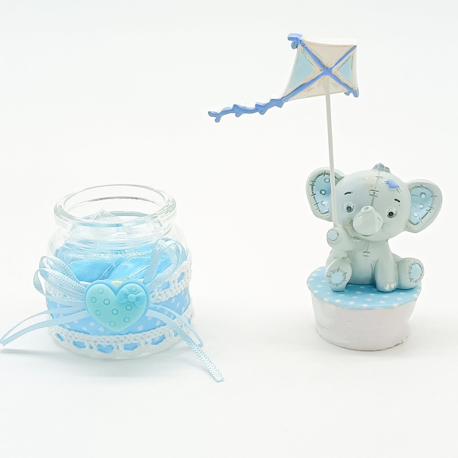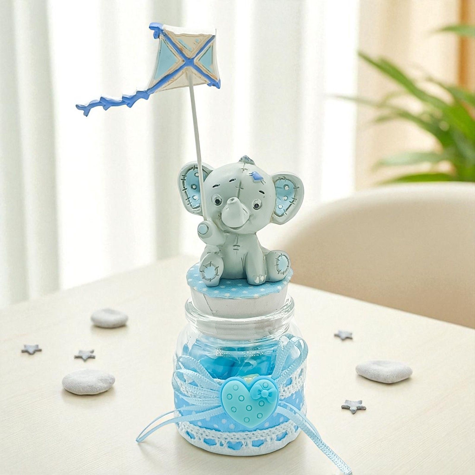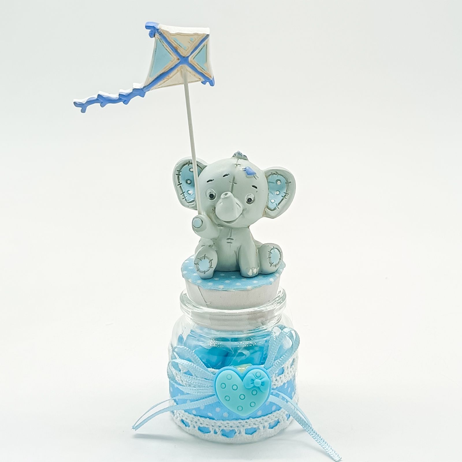 Dolce e tenero, questo portaconfetti è la bomboniera perfetta per celebrare la nascita, il battesimo o il primo compleanno di un bimbo. Il barattolino in vetro decorato con pois, pizzo e cuoricino è chiuso da un tappo in sughero, su cui spicca un simpatico elefantino grigio e celeste con aquilone.