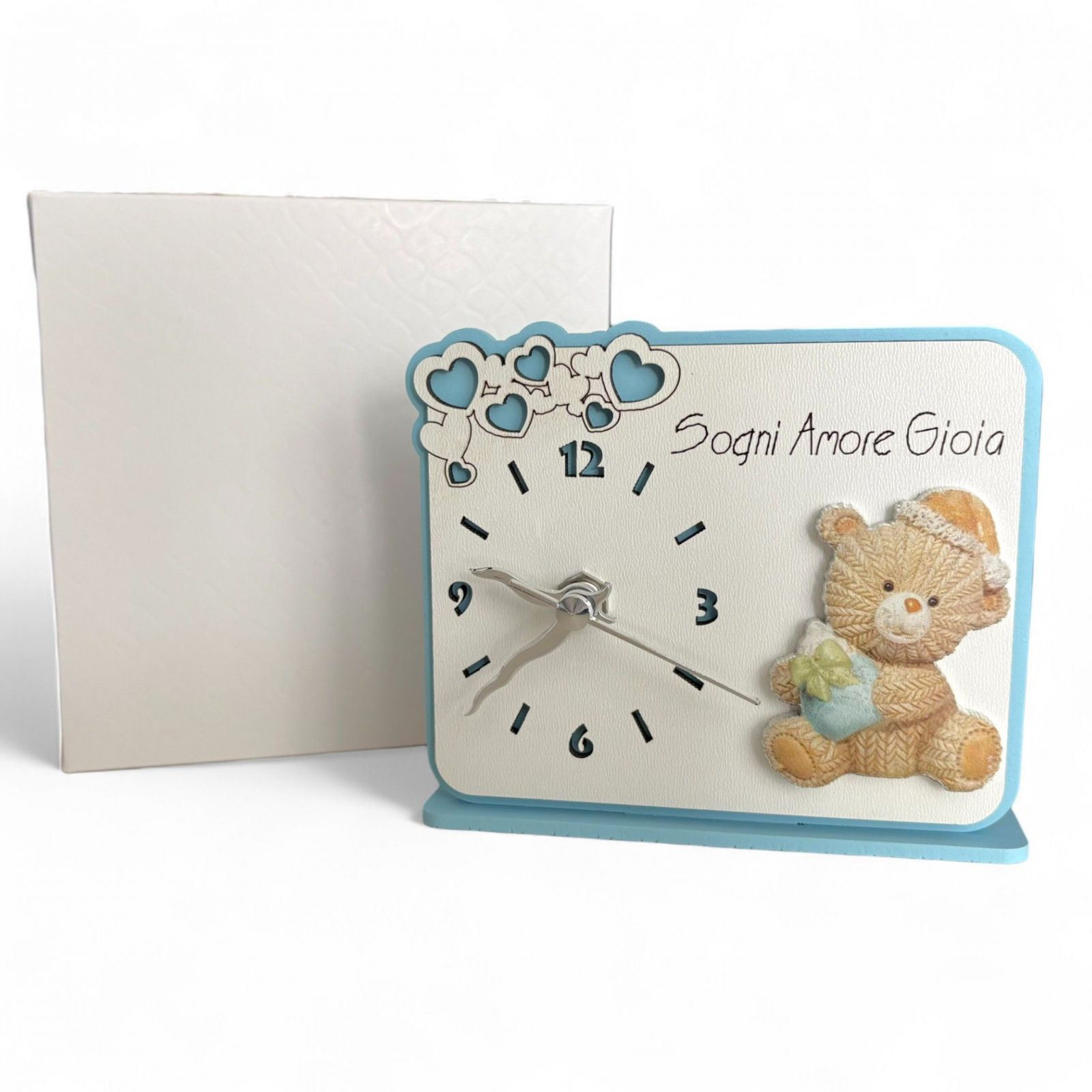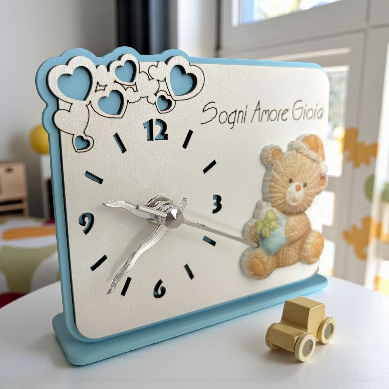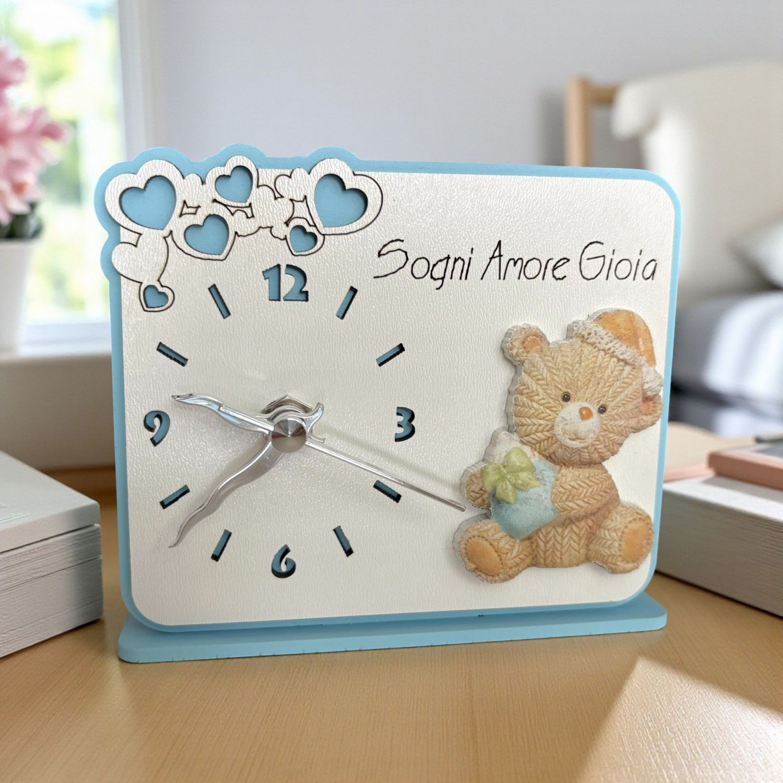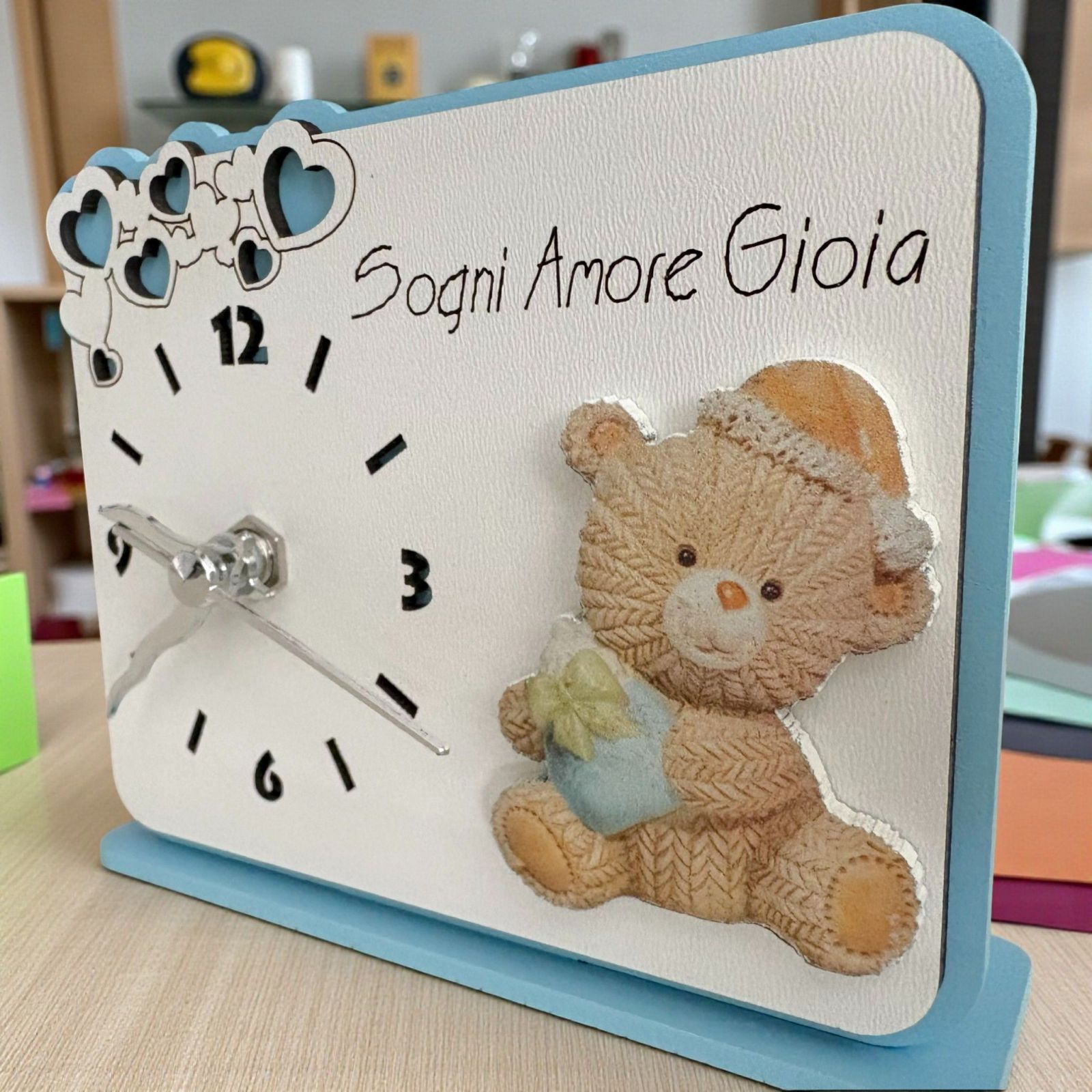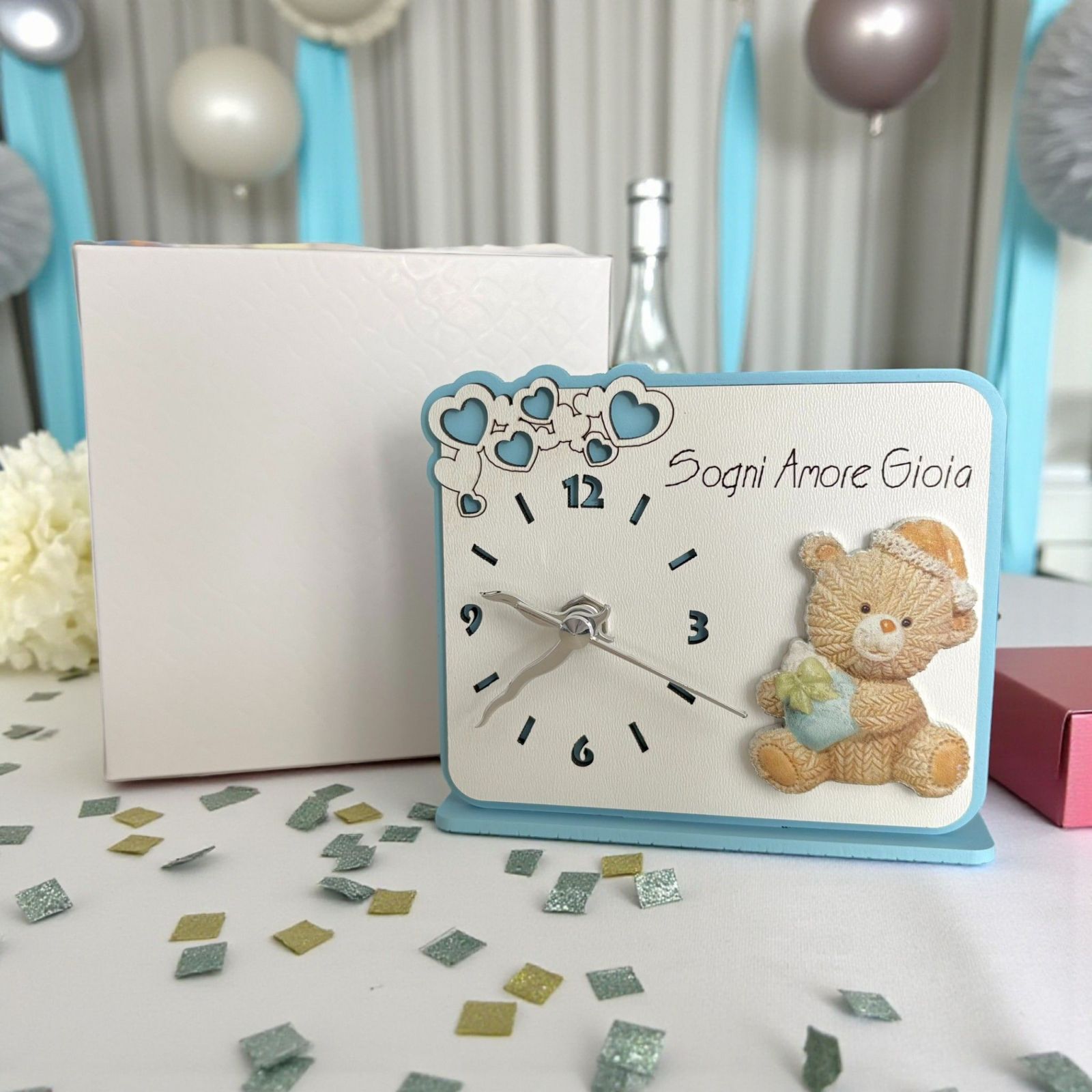 Scopri la dolcezza dell'amore incondizionato con il nostro orologio con orsetto, un'affascinante bomboniera per il battesimo del tuo bimbo. Ogni dettaglio è pensato per trasmettere un messaggio di affetto e serenità, trasformando questo oggetto in un ricordo prezioso da custodire nel cuore. Le parole Sogni, Amore e Gioia incise sull'orologio evocano emozioni profonde, rendendo questo regalo davvero speciale.