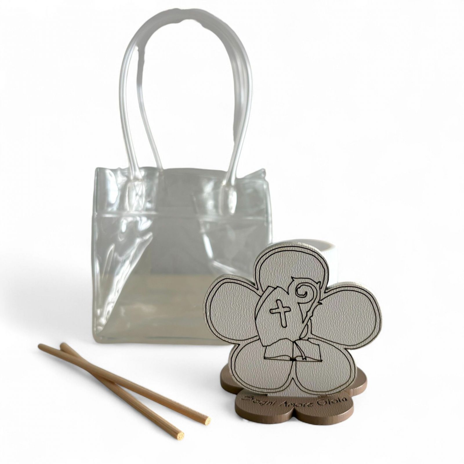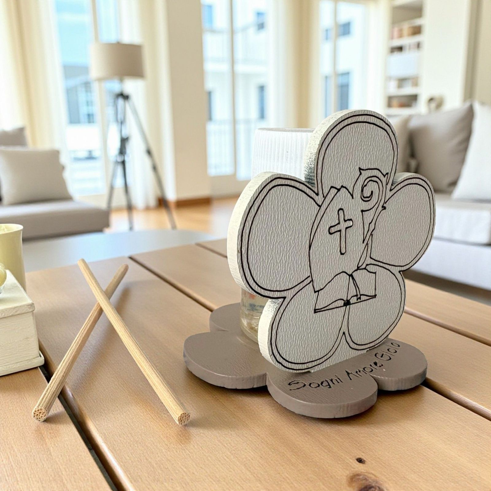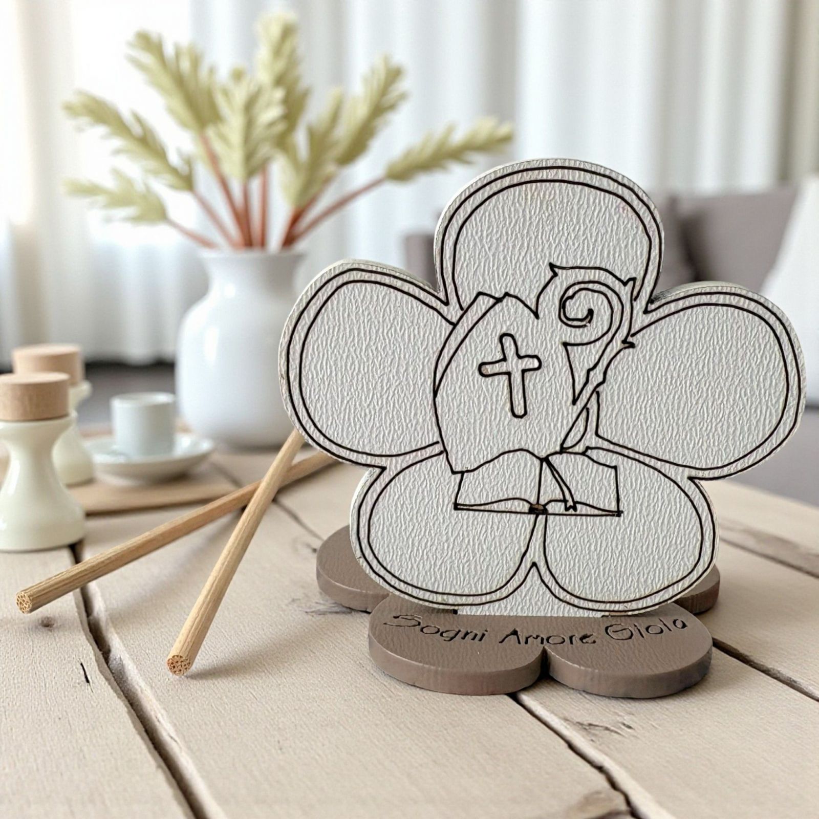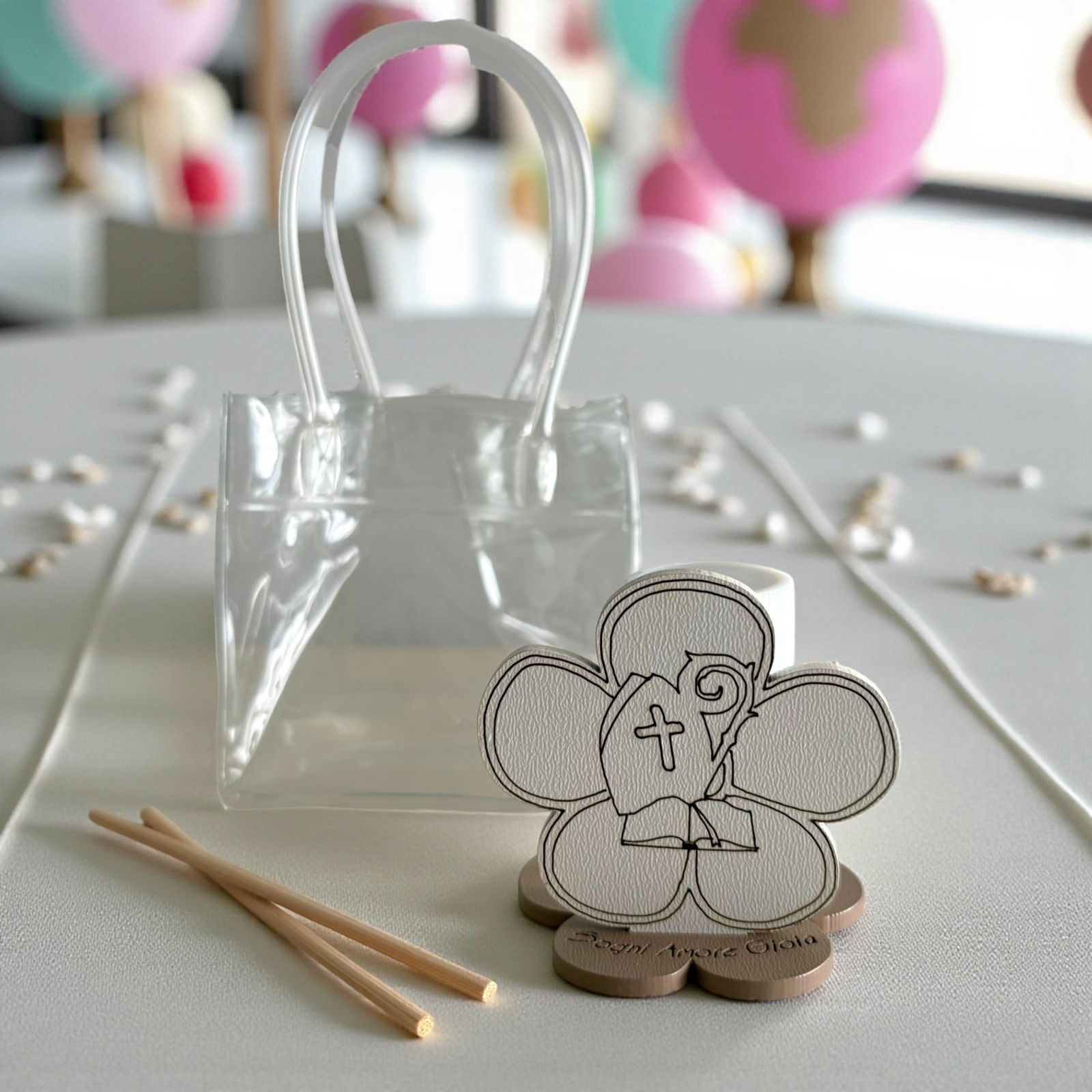 Rendi la tua cresima indimenticabile con le nostre eleganti bomboniere cresima: il profumatore ambiente fiore e simboli sacri è un dono che parla direttamente al cuore. Ogni dettaglio è stato curato con amore, dalla base tortora al delicato fiore bianco, per rappresentare la purezza e la spiritualità di questo importante passo nella vita dei giovani. Donare un profumatore significa offrire un ricordo che si diffonderà nell’aria, richiamando emozioni e momenti preziosi.