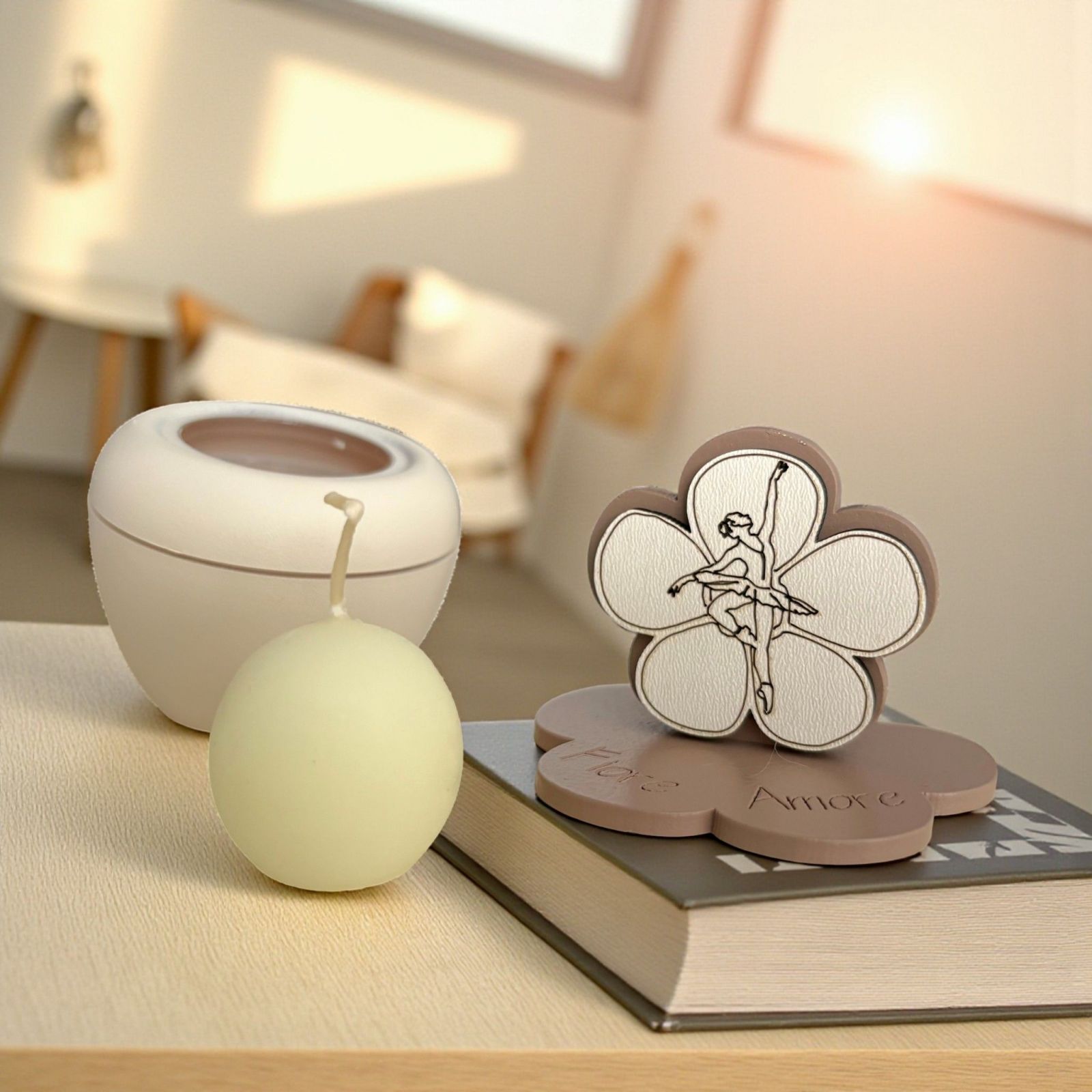 Delicato portacandela con fiore che racchiude un piccolo mondo di dolcezza e movimento. Sul coperchio, a forma di fiore, compaiono le parole Fiore, Amore, mentre all’interno una graziosa ballerina che danza aggiunge un tocco magico e giocoso. Perfetto come bomboniere battesimo bimba o bomboniere prima comunione a tema danza, regala un’emozione speciale a chi lo riceve.