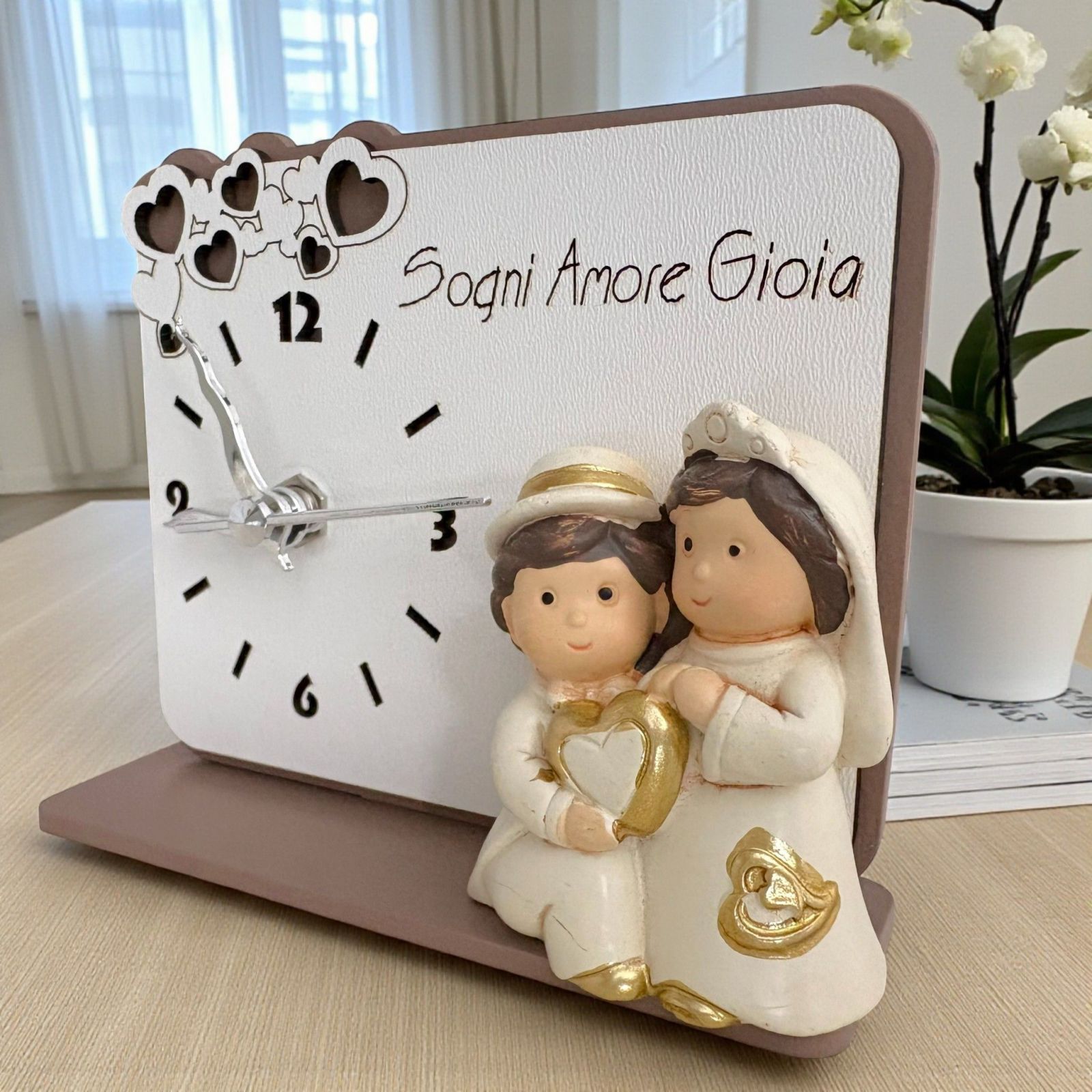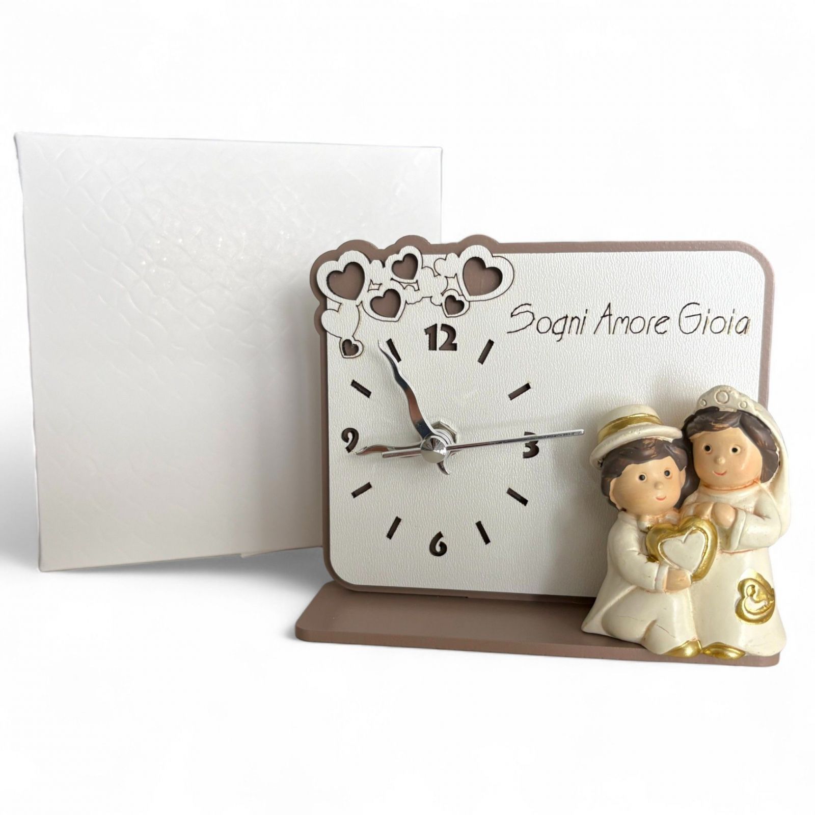 Elegante orologio rettangolare con statuina sposi che celebra l’amore eterno. I due innamorati, abbracciati e dettagliati con riflessi color oro, sono accompagnati dalle parole Sogni, Amore, Gioia, simbolo di felicità e unione. Perfetto come bomboniera matrimonio, anniversario o nozze d’oro, aggiunge un tocco romantico e significativo a ogni celebrazione.