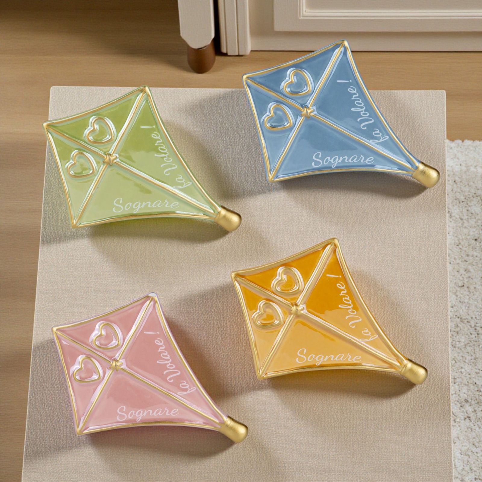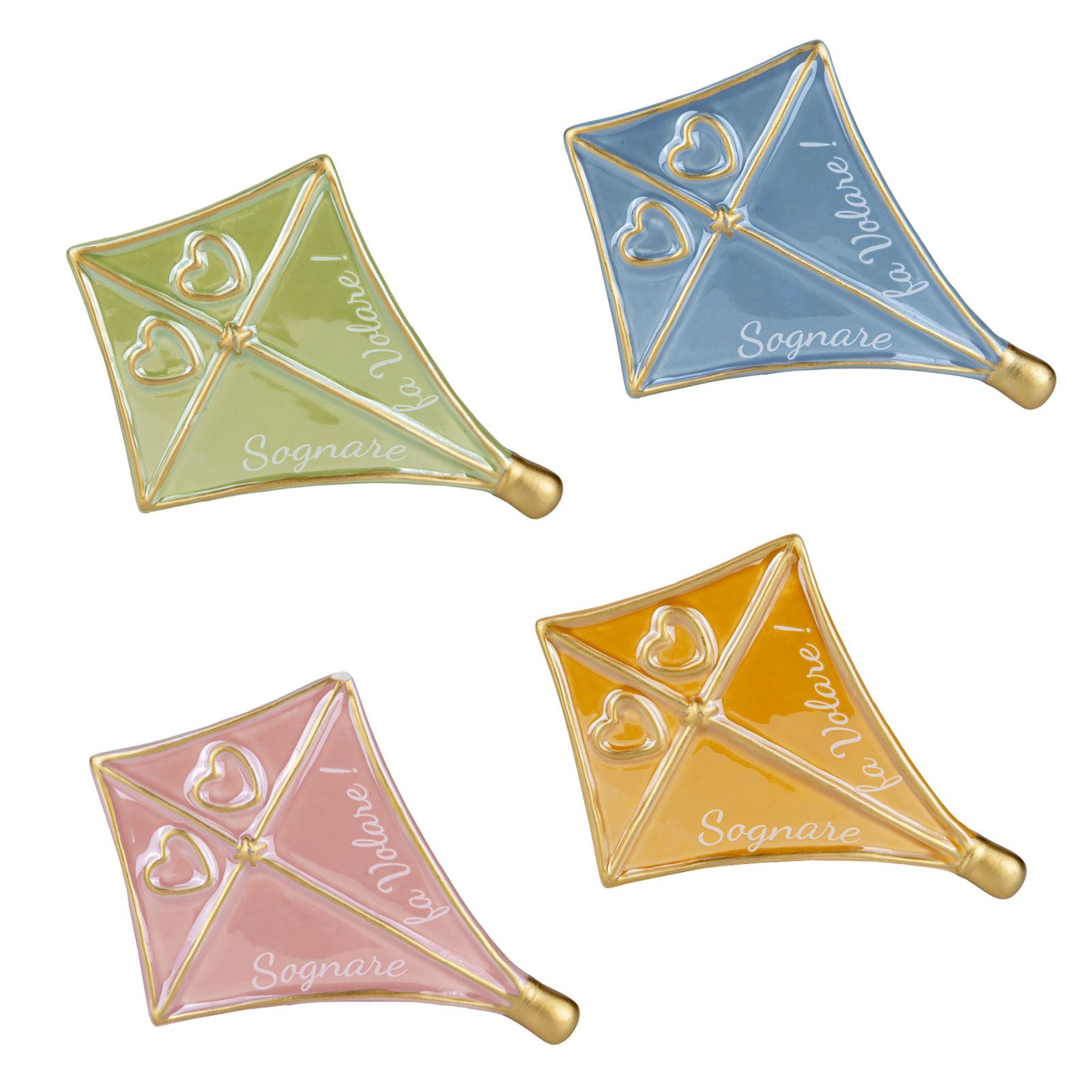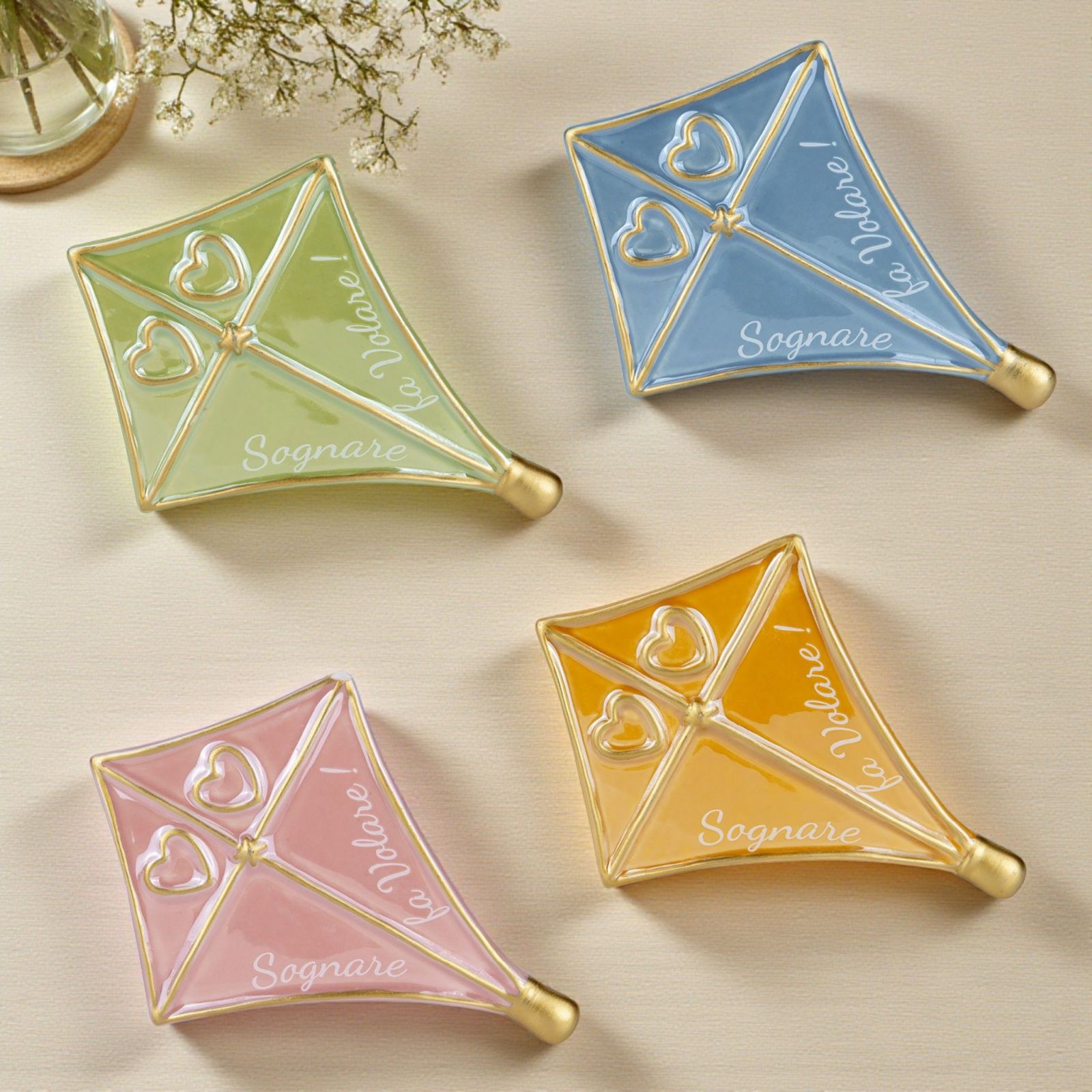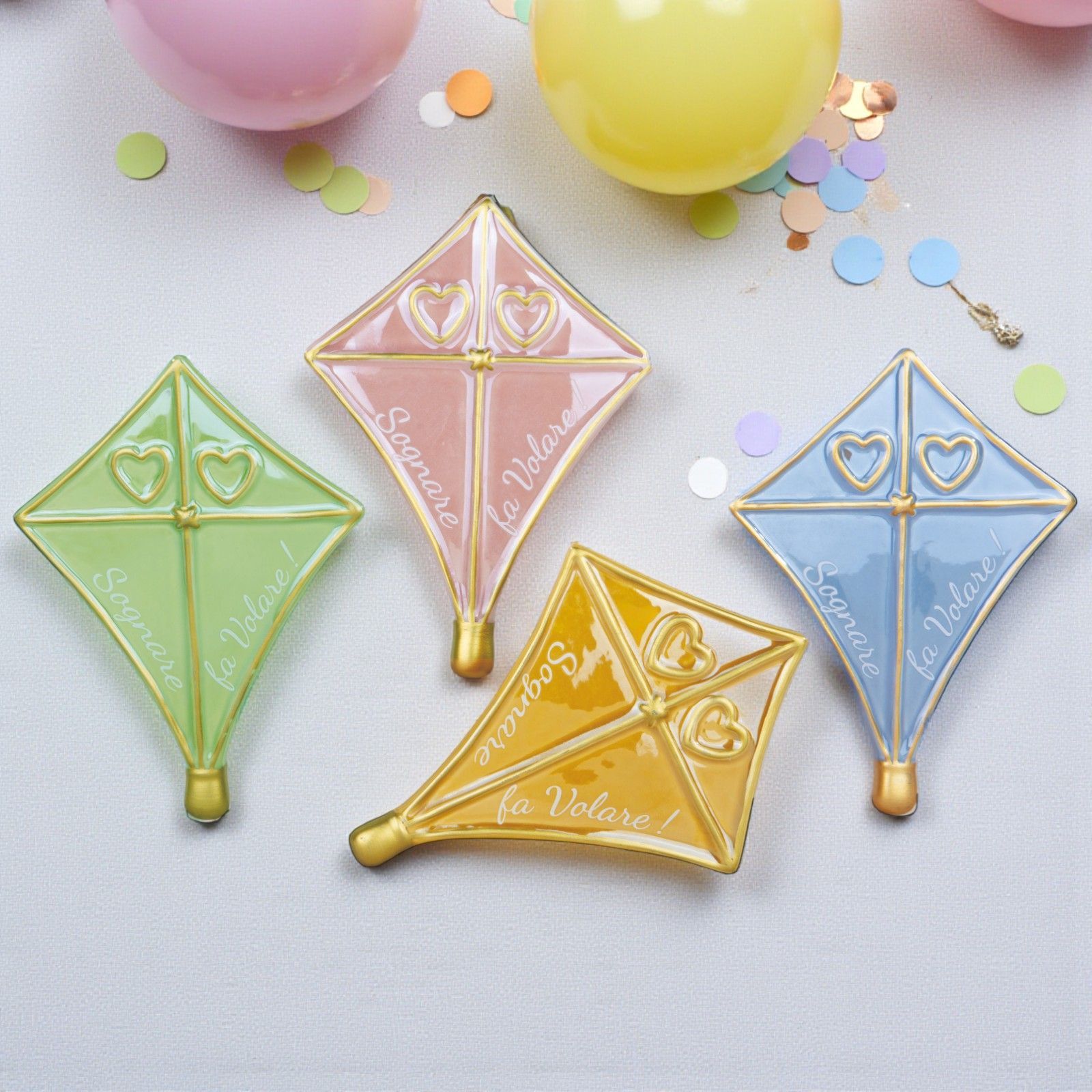 Lasciati trasportare dalla magia di un sogno con la n ostra esclusiva bomboniera a forma di aquilone, un simbolo di libertà e avventura. Questa meravigliosa creazione, decorata con bordi dorati e piccoli cuoricini, porta con sé il messaggio profondo che “Sognare fa volare". Perfetta per celebrare momenti speciali come nascite, battesimi, comunioni, cresime, diciottesimi e compleanni, questa statuina è molto più di un semplice regalo, è un modo per condividere un sogno con i tuoi cari.