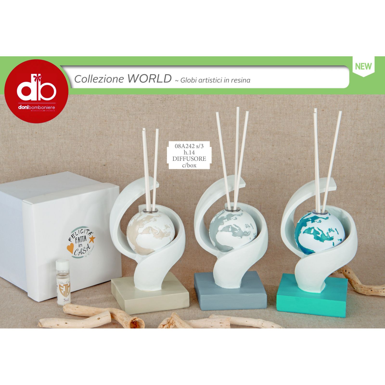 Scoprire il mondo non è mai stato così affascinante! Questo diffusore essenza con planisfero rappresenta un'idea originale per le tue bomboniere tema viaggio. Con continenti elegantemente dipinti di bianco, rappresenta non solo un elemento decorativo, ma anche un simbolo di avventure condivise e di sogni da realizzare insieme. Scegliere questa bomboniera per il tuo matrimonio o anniversario significa regalare un ricordo che profuma di amore e di libertà.