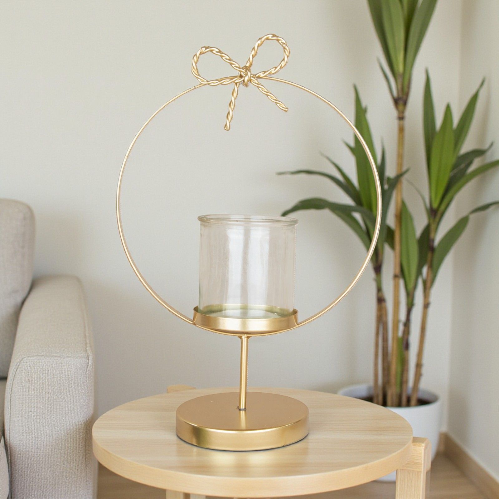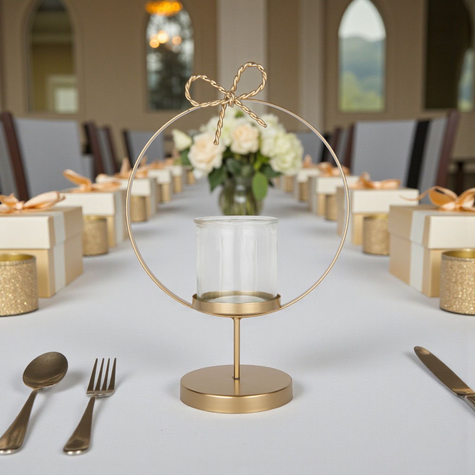 Realizzata in un raffinato colore oro, questa bomboniera si distingue per la sua struttura in metallo e il delicato vasetto porta candela in vetro. Il cerchio chiuso con un fiochetto intrecciato aggiunge un tocco di classe, rendendo ogni evento ancora più speciale. Un regalo che non passerà inosservato e che i tuoi invitati porteranno a casa con affetto.