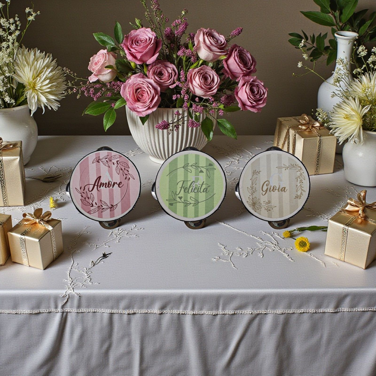 Realizzato in legno, metallo e plastica e disponibile in tre colori assortiti come da foto, questo tamburello rappresenta una delle più apprezzate idee originali bomboniere, perfette anche come segnaposto o per arricchire la confettata con un tocco creativo e simbolico.