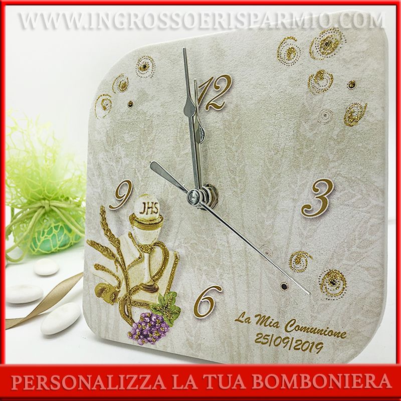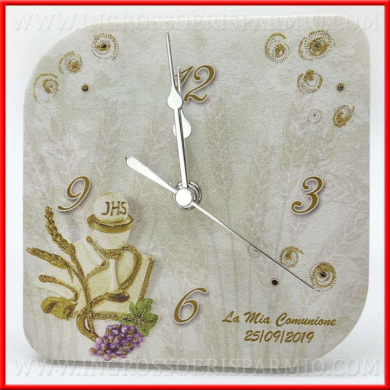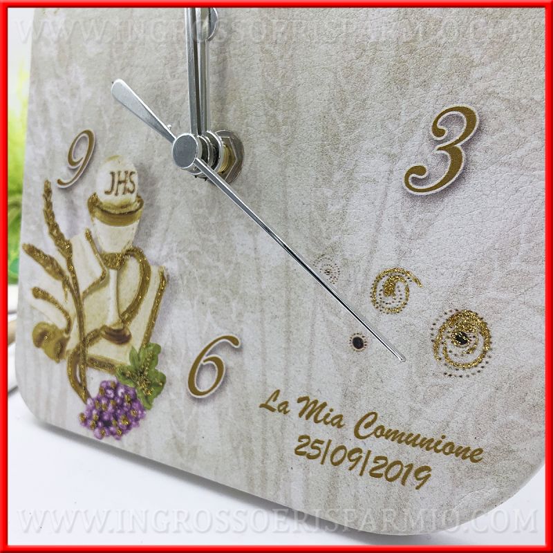 Orologi originali specifici per bomboniere comunione: forma quadrata con bordi arrotondati, supporto in legno rivestito in ecopelle stampata. L'orologio prima comunione riporta i simboli tradizionali di questo sacramento, ossia il calice con ostia, spighe di grano e grappolo d'uva. Decorato da polvere glitter dorata. E' possibile utilizzare la bomboniera orologio sia in appoggio, da tavolo, che da parete.