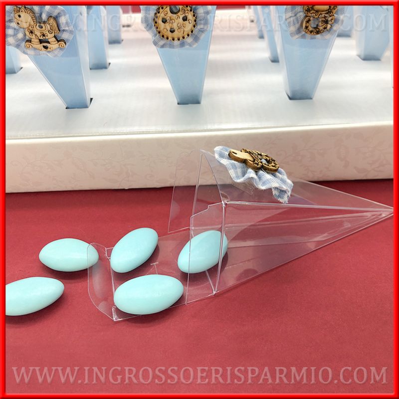 Un bellissimo set composto da cesto e 24 coni trasparenti in pvc. Il vassoio ha forma rettangolare, con manici laterali, in cartone bianco, con inserto porta coni (24 fori). Ciascuna scatolina a forma di cono portaconfetti è decorata con una piccola coccarda nascita, in stoffa a fantasia quadretti, e applicazione centrale di decorazioni in legno, assortite in 4 modelli: bavaglino, cavallo a dondolo, ciuccio e passeggino.