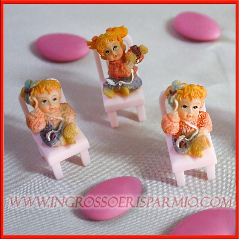 Graziose ed eleganti bimbe in resina colorata, sedute su sedia rosa in plastica ognuno con una propria caratteristica che la contraddistingue.